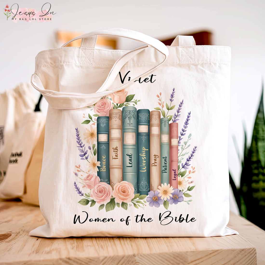 Personalized Women of the Bible Tote Bag, Christian Book Design, Faith-Based Floral Canvas Bag, Religious Gift for Women, Bible Verse Tote