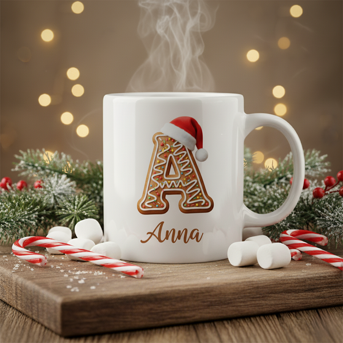 Personalized Christmas Mug, Custom Name Holiday Mug Gift, Cute Gingerbread Letter Cup, Kids Cocoa Mug, Festive Monogram Initial Mug| Mug 28