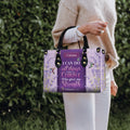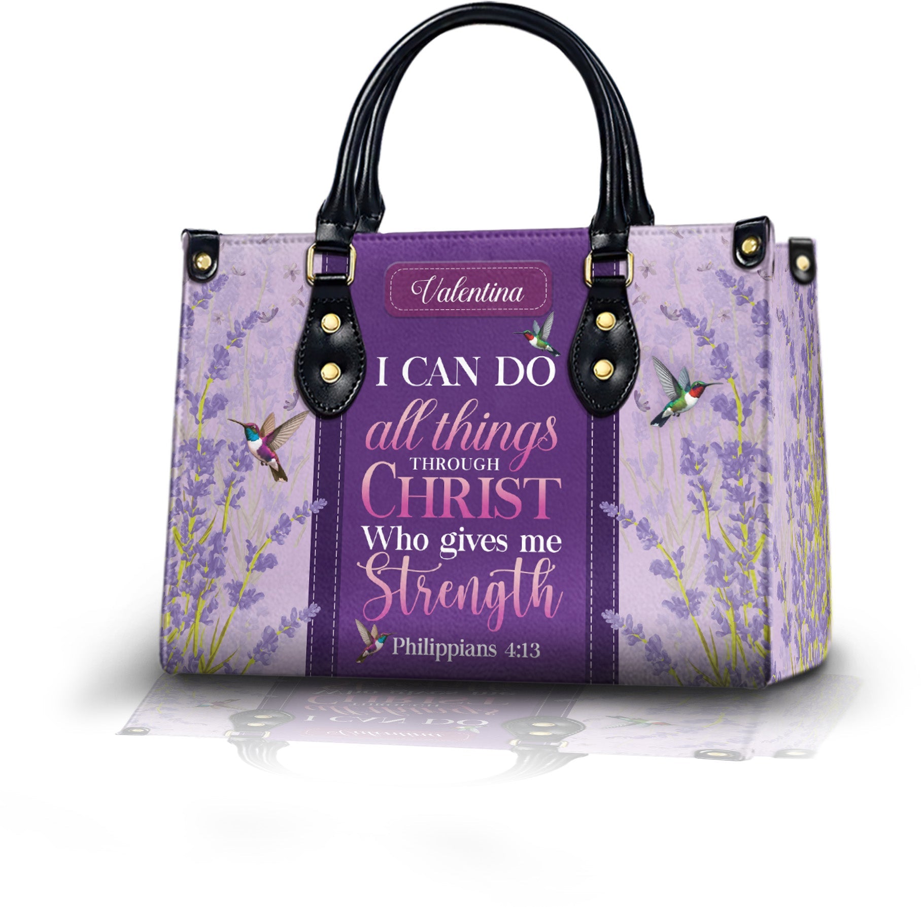 This beautifully designed handbag is made for strong women of faith who find strength in God. Featuring delicate lavender flowers and the empowering scripture, it is a symbol of grace, hope, and unwavering belief.