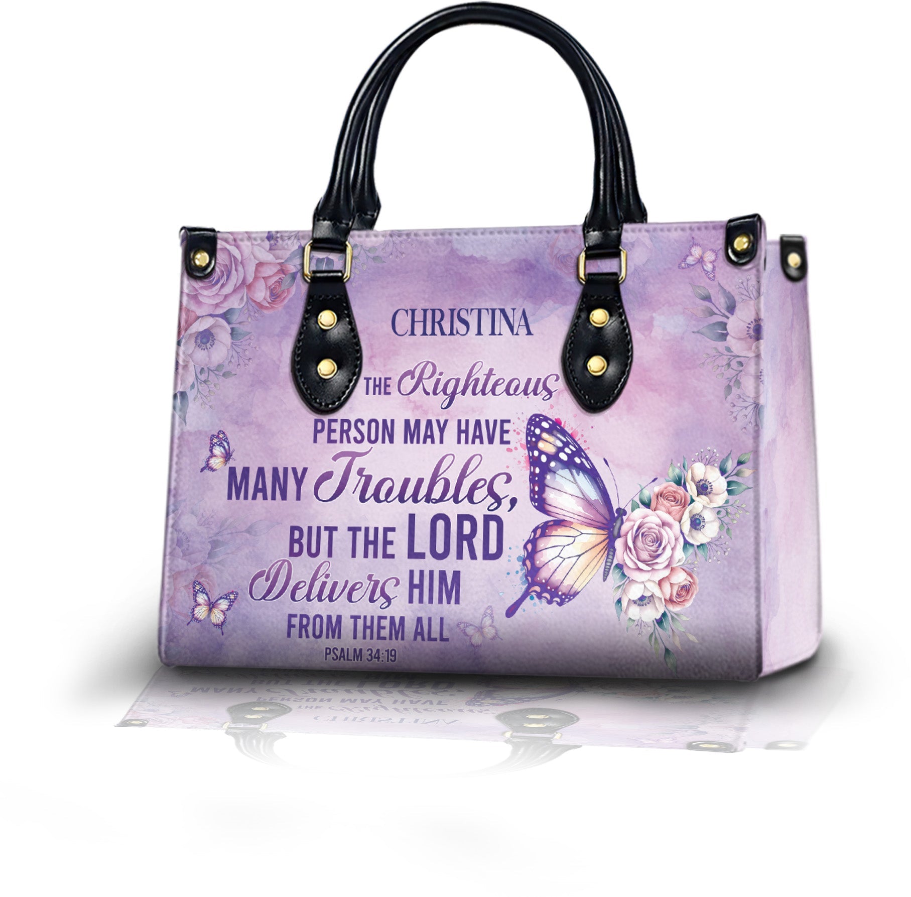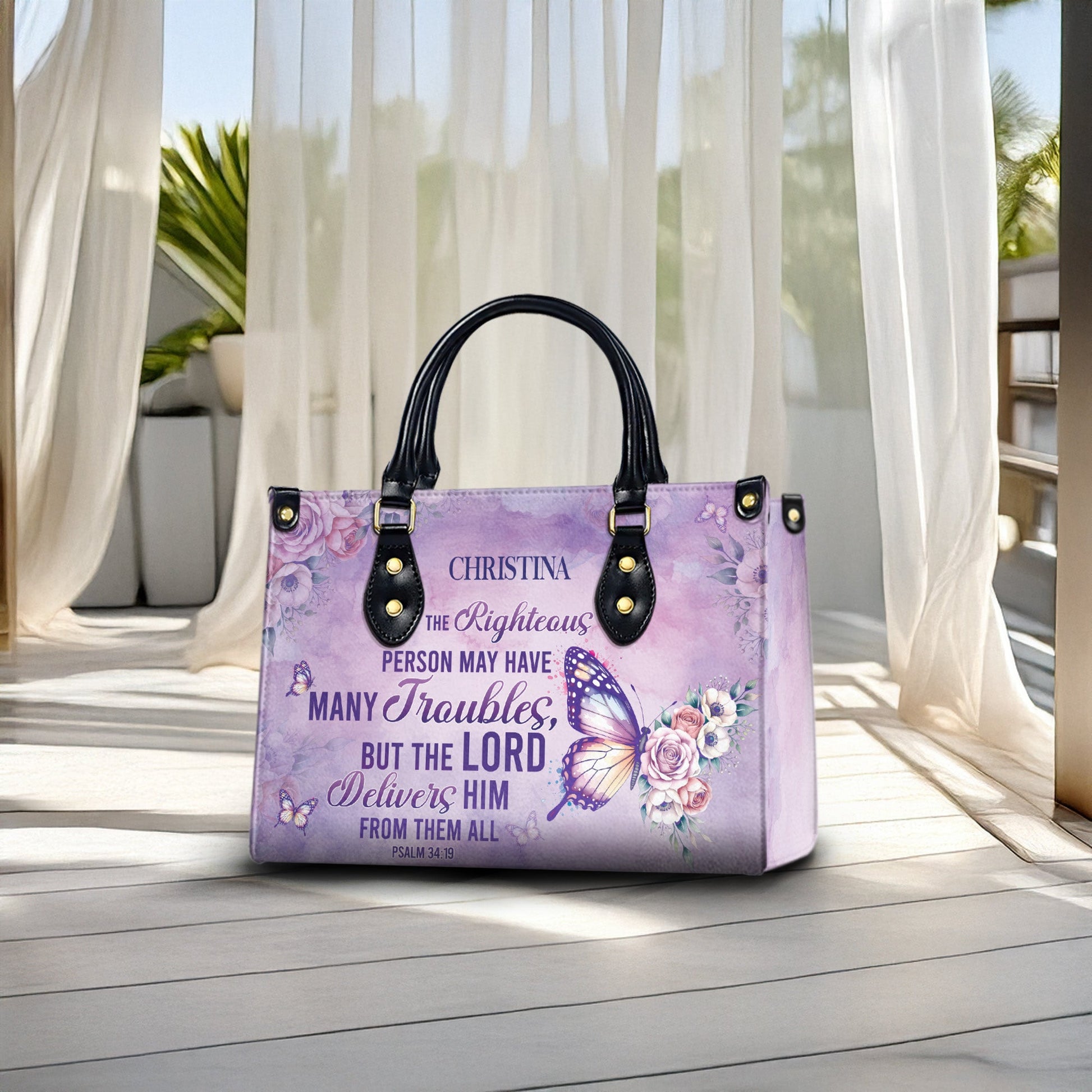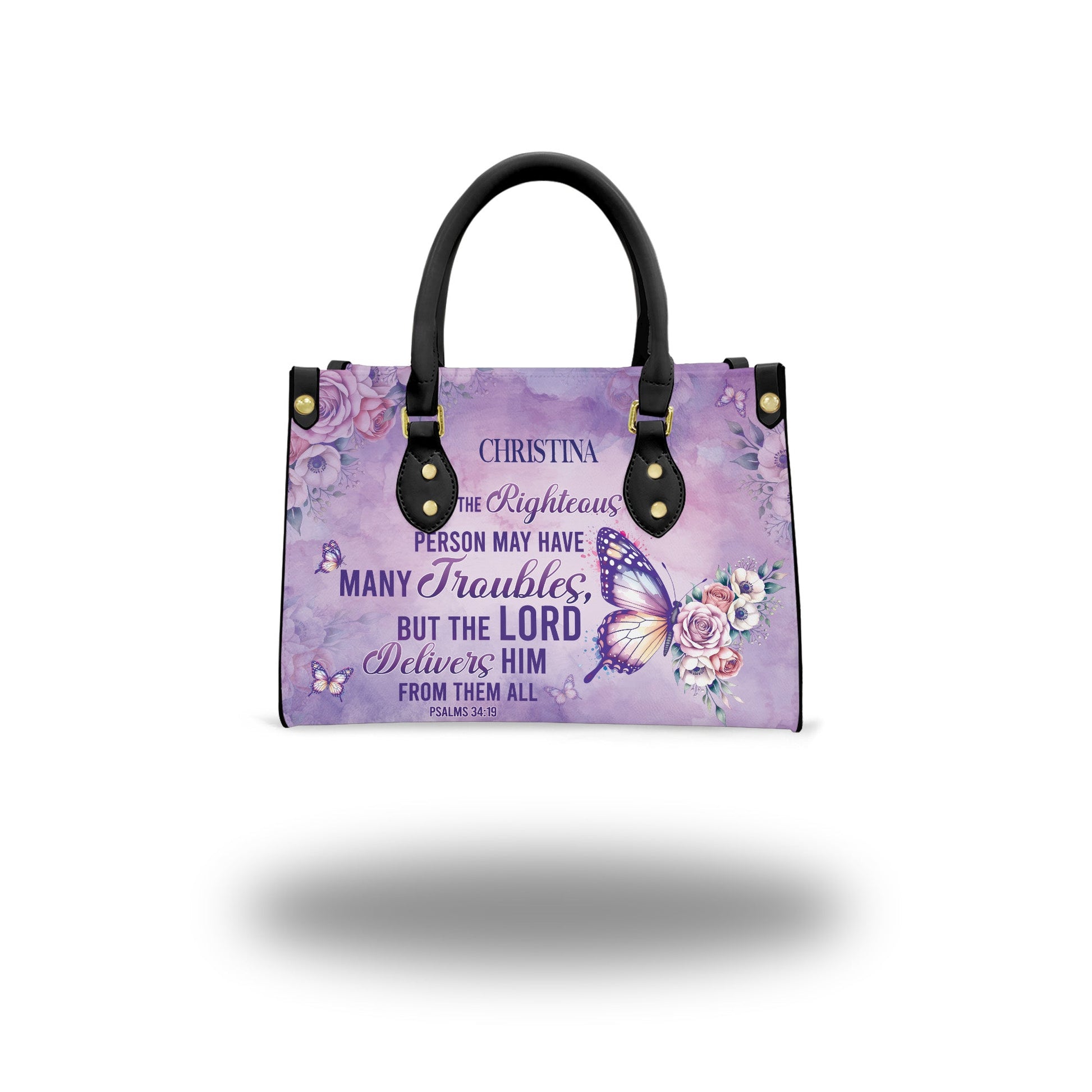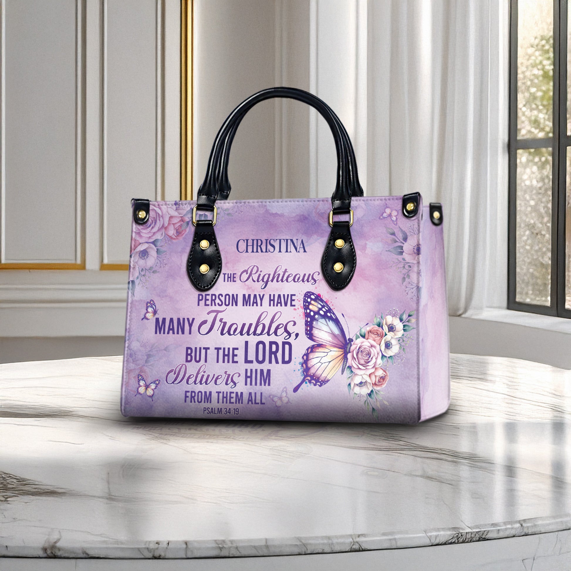 HB93 - Custom Name Christian Handbag – The Lord Delivers Purse – Bible Verse Psalm 34:19 Bag – Faith Butterfly Floral Tote for Women