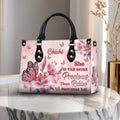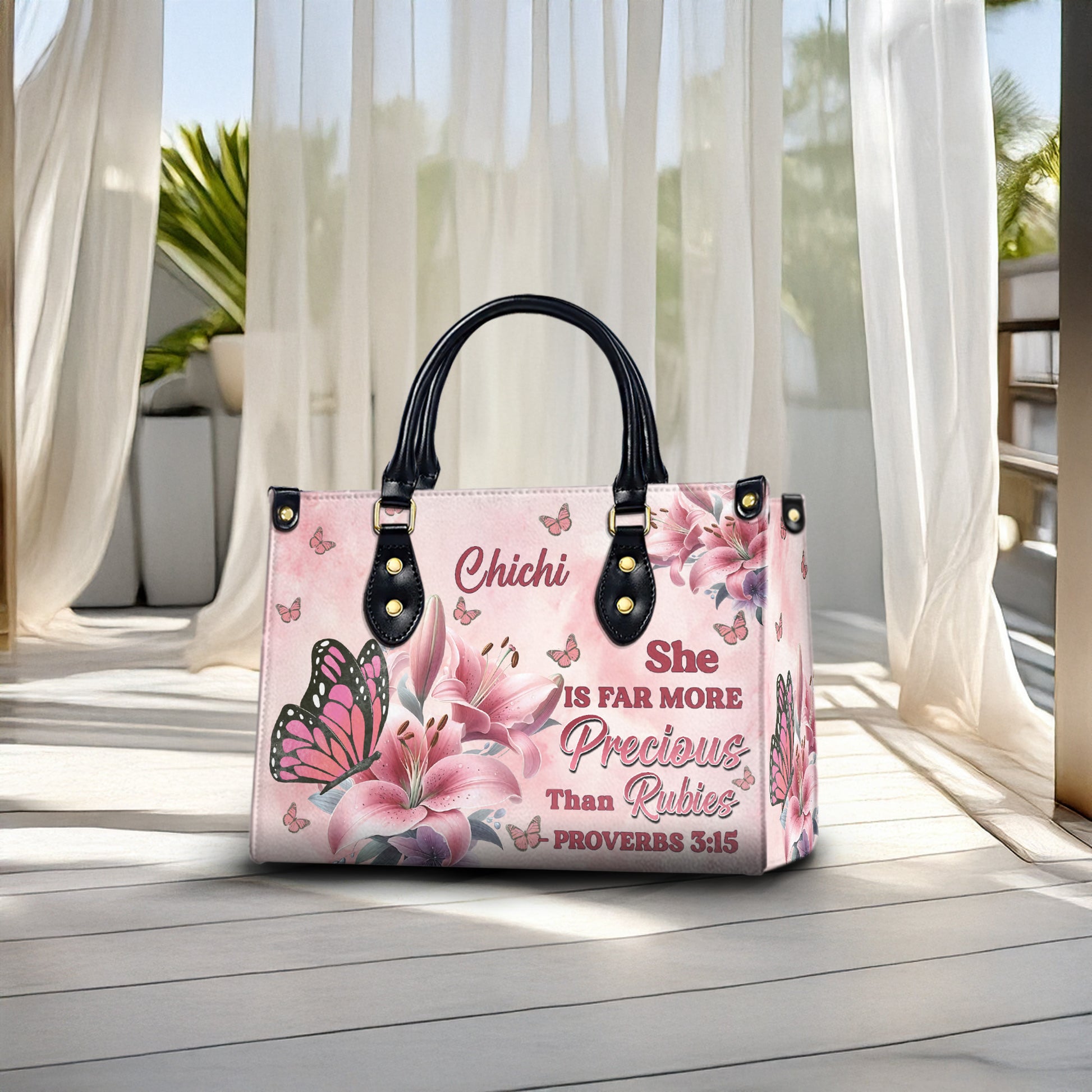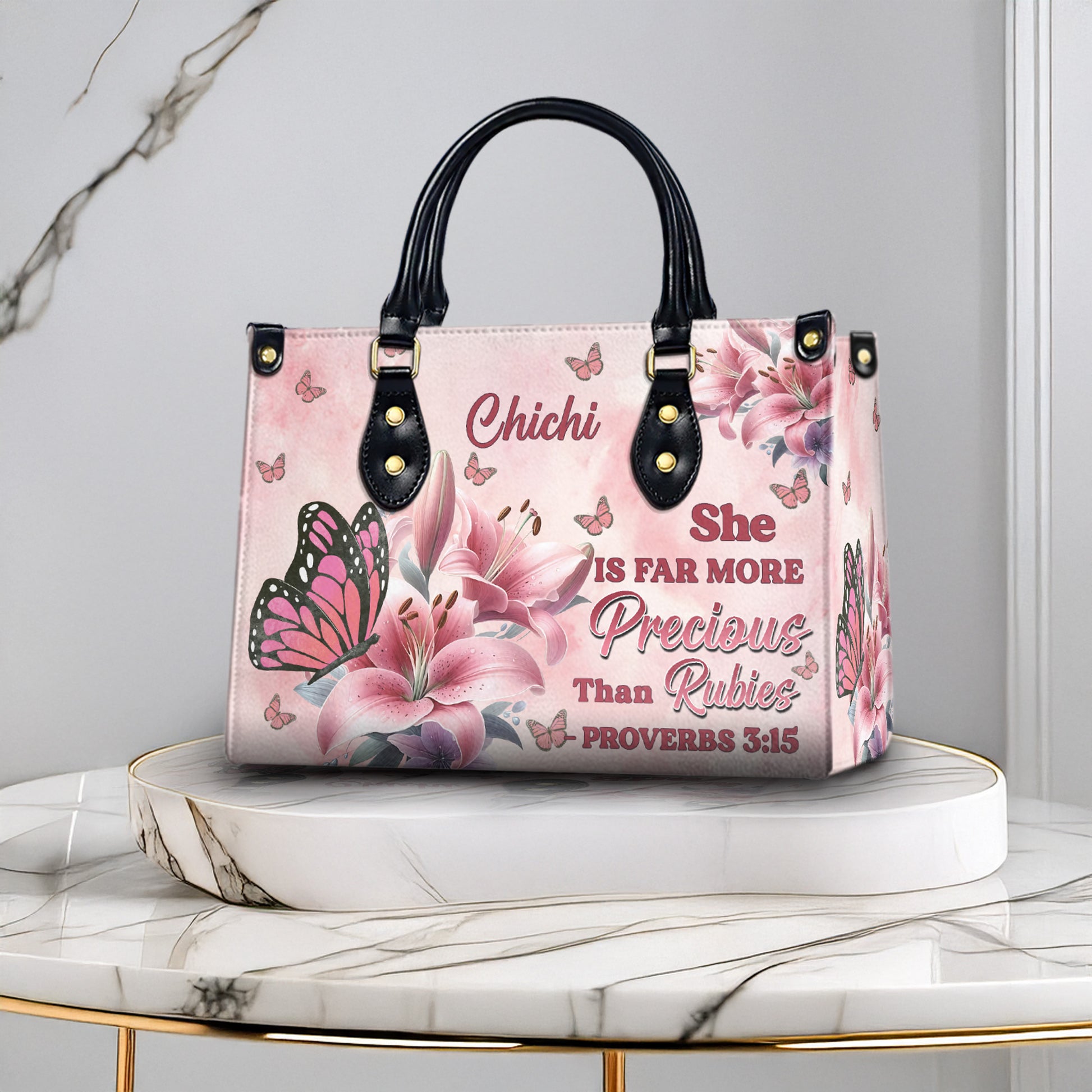 Celebrate the strength and beauty of a faithful woman with this personalized “Precious Than Rubies” handbag. Featuring stunning pink floral artwork, graceful butterflies, and the uplifting Bible verse from Proverbs 3:15, this Christian handbag is the perfect daily accessory for women of faith.