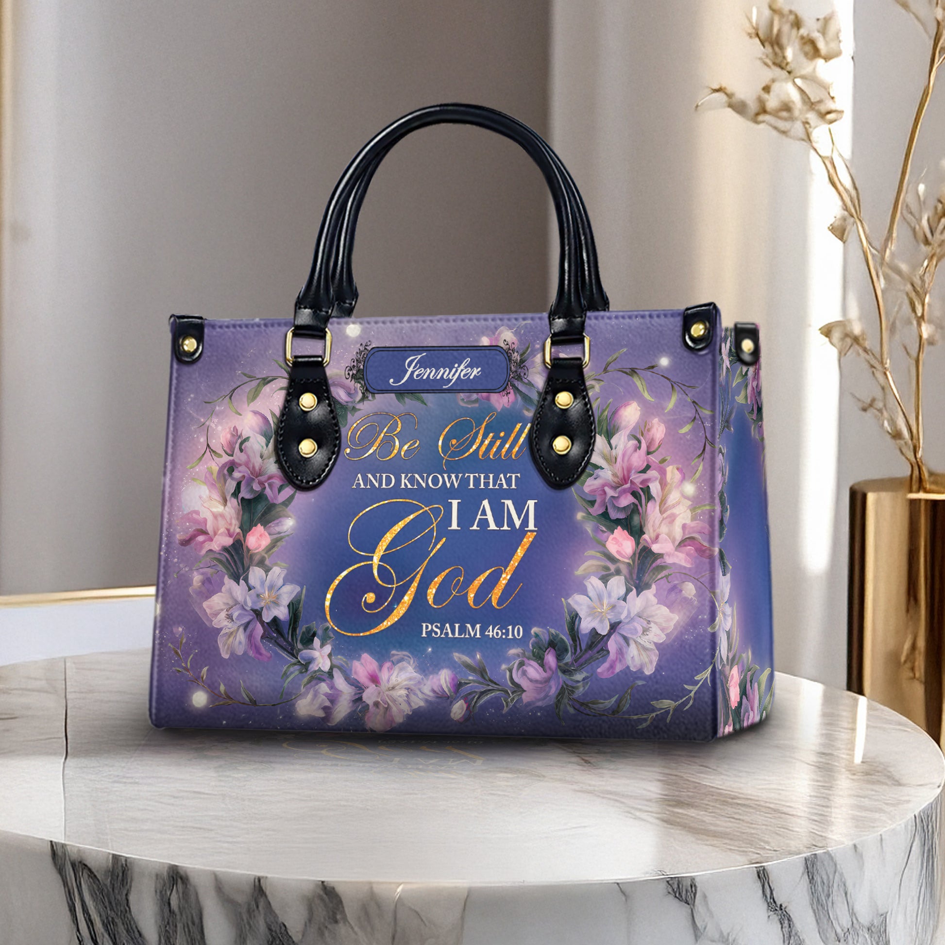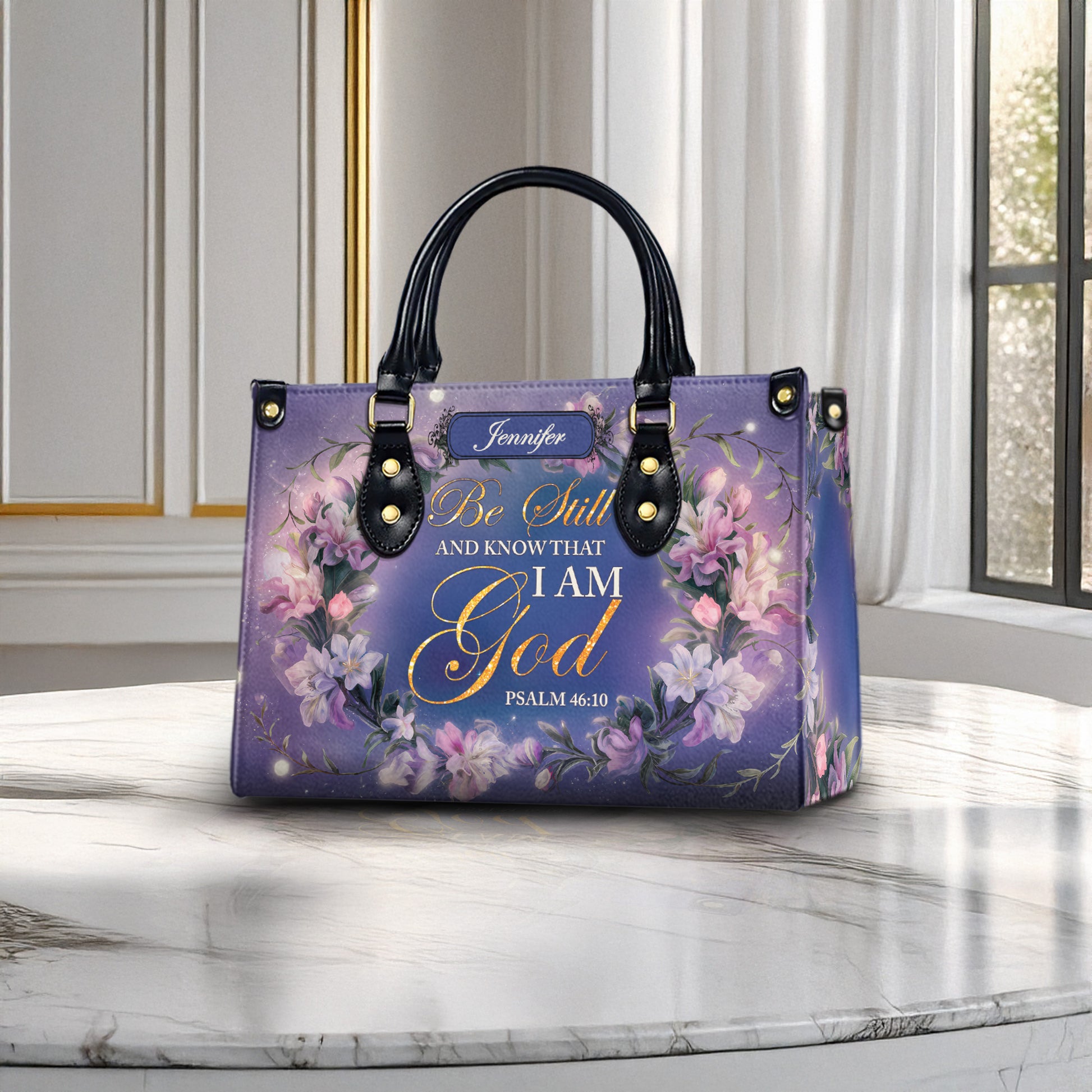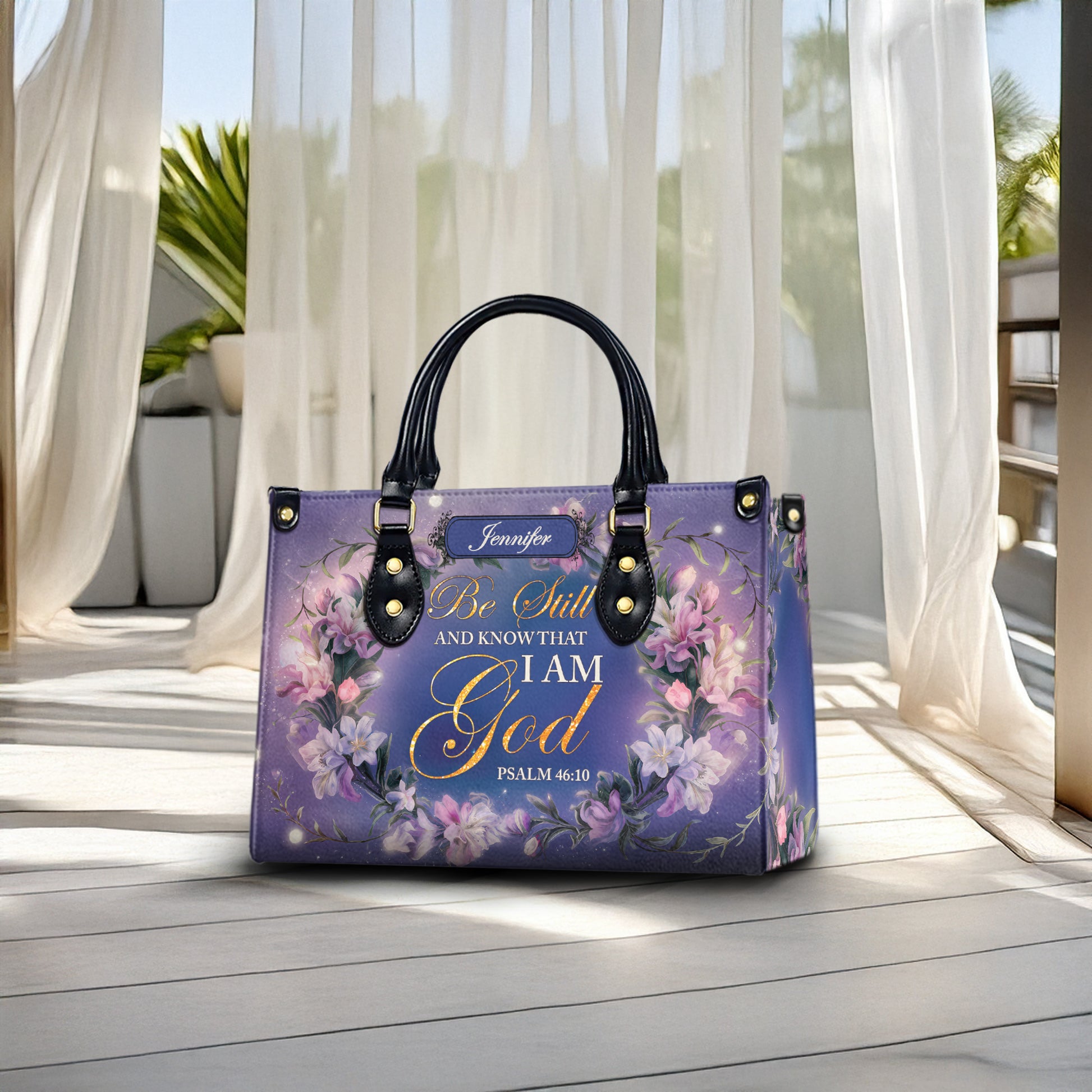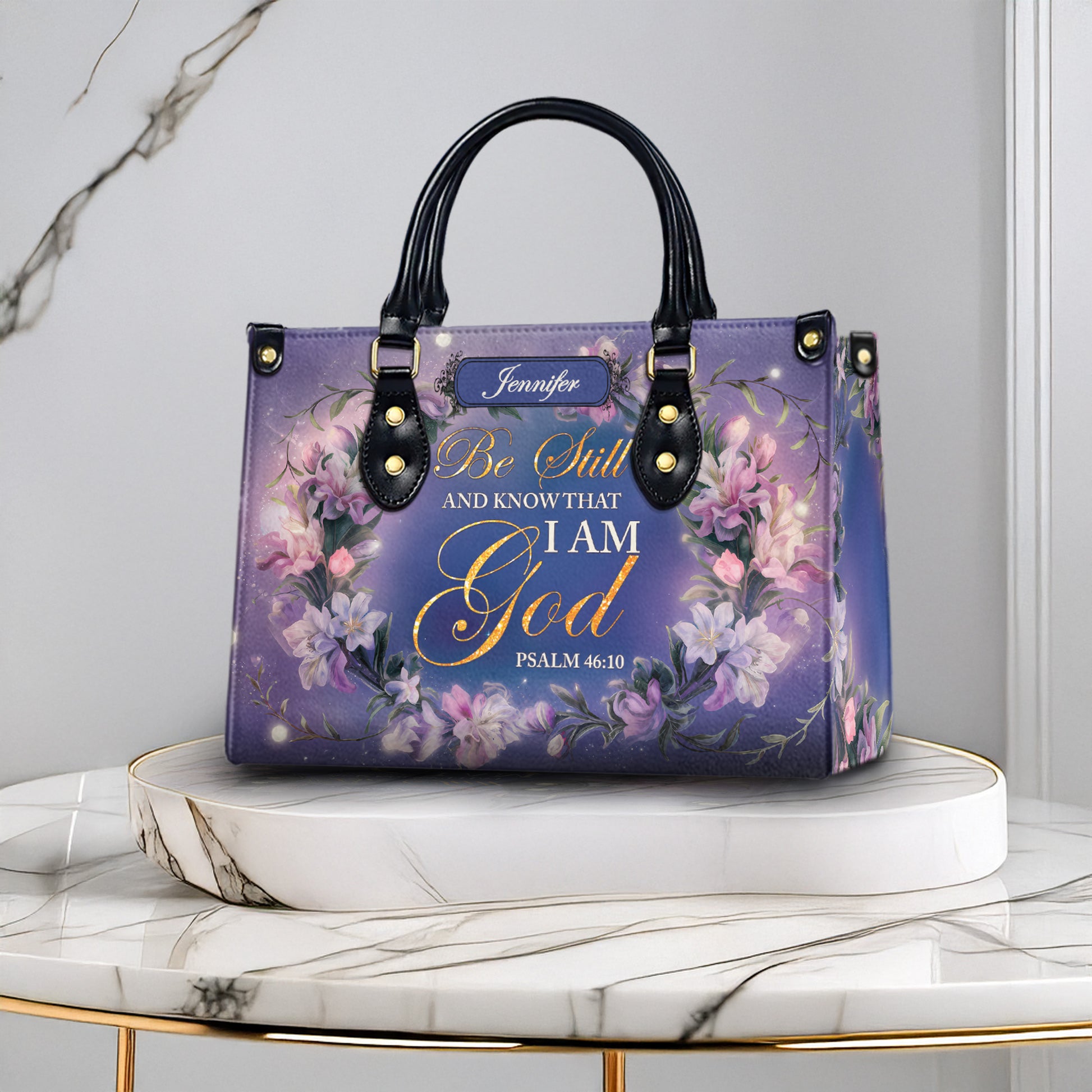Carry your faith with grace through this stunning personalized Christian handbag, featuring the beloved Bible verse Psalm 46:10: “Be still and know that I am God.” Surrounded by elegant floral details and your custom name, this bag is the perfect symbol of peace, trust, and unwavering belief.