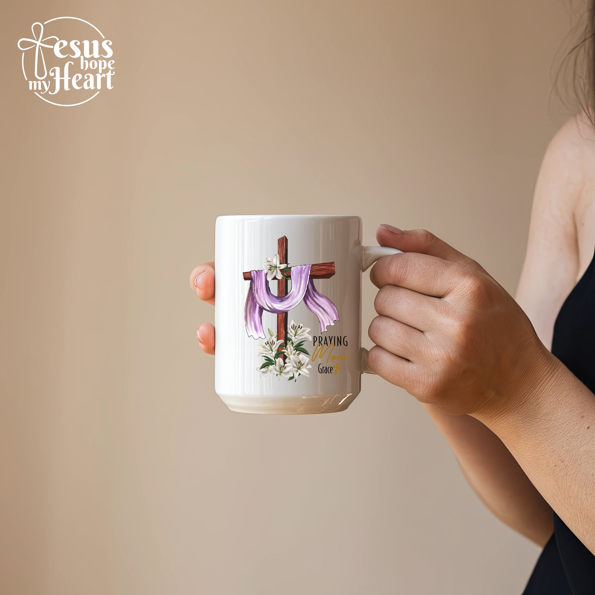 Praying Mom Christian Mug - Inspirational Coffee Cup with Cross & Lilies