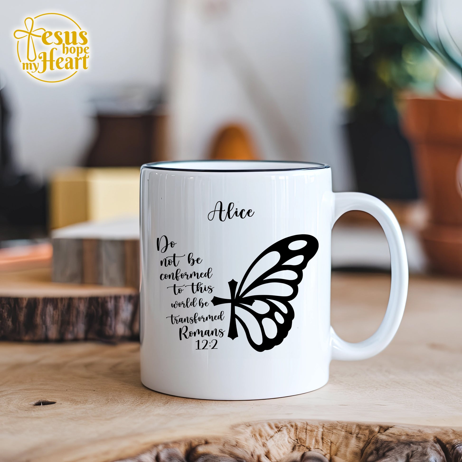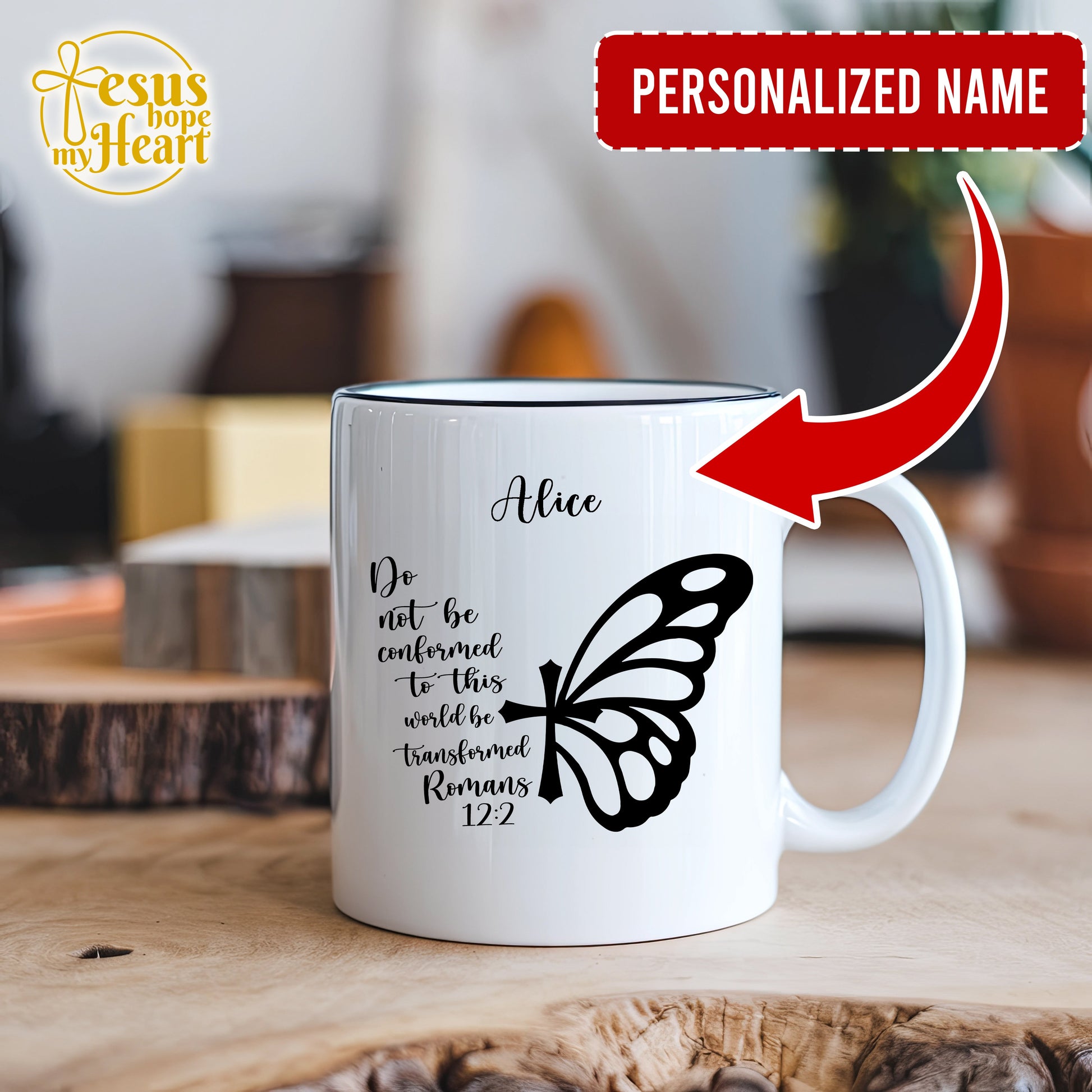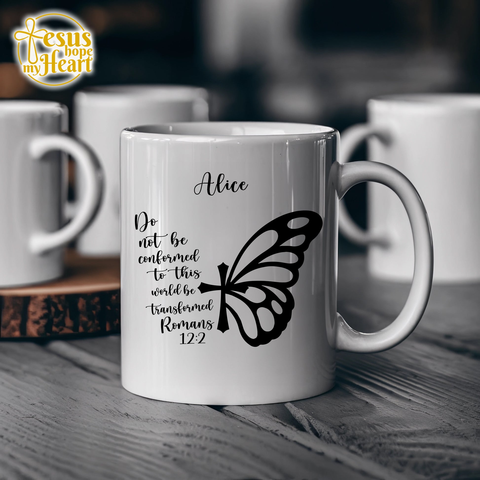 personalized romans 12 2 mug – christian butterfly coffee cup – faith gift for women