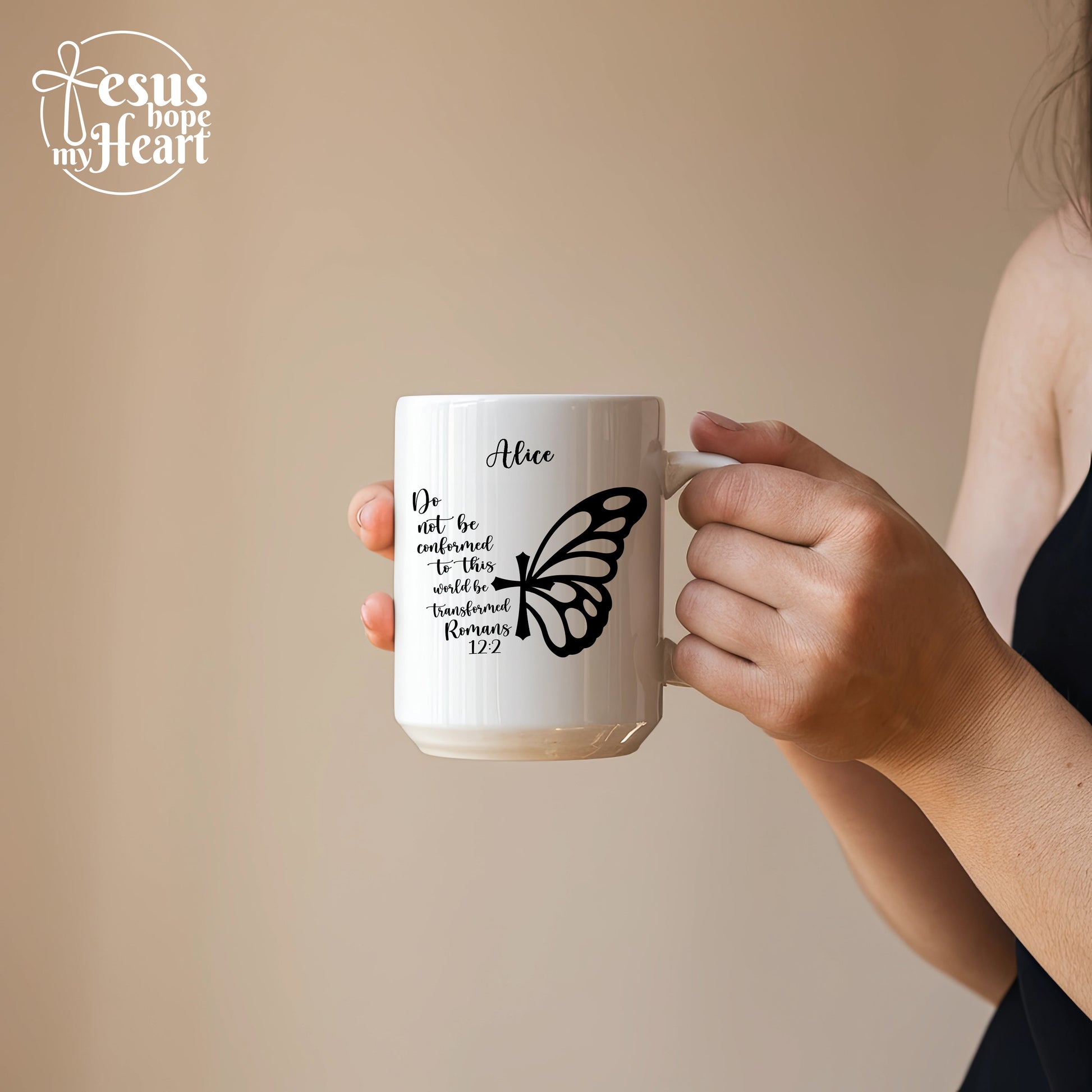 ✨ Romans 12:2 Mug – Personalized Christian Butterfly Coffee Cup