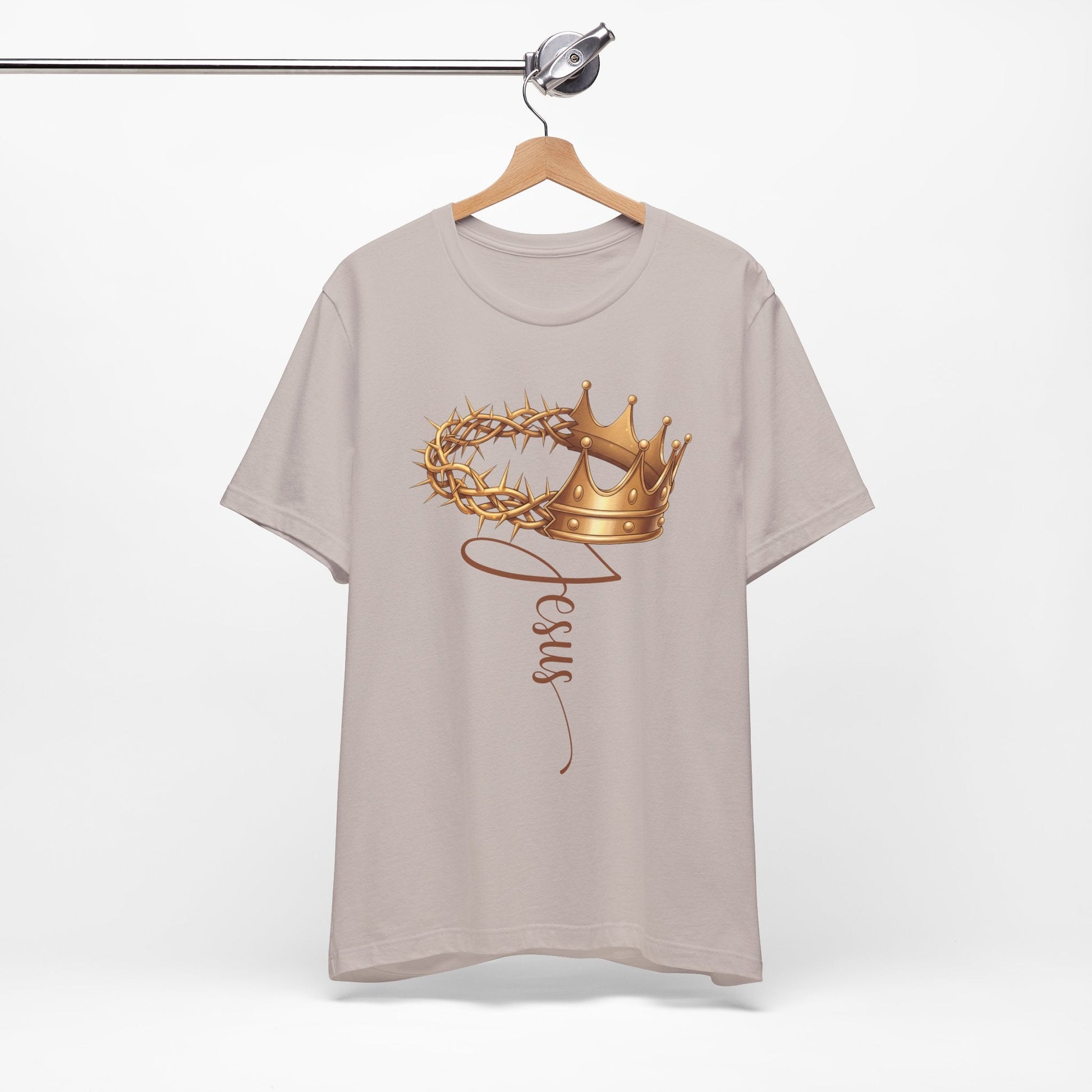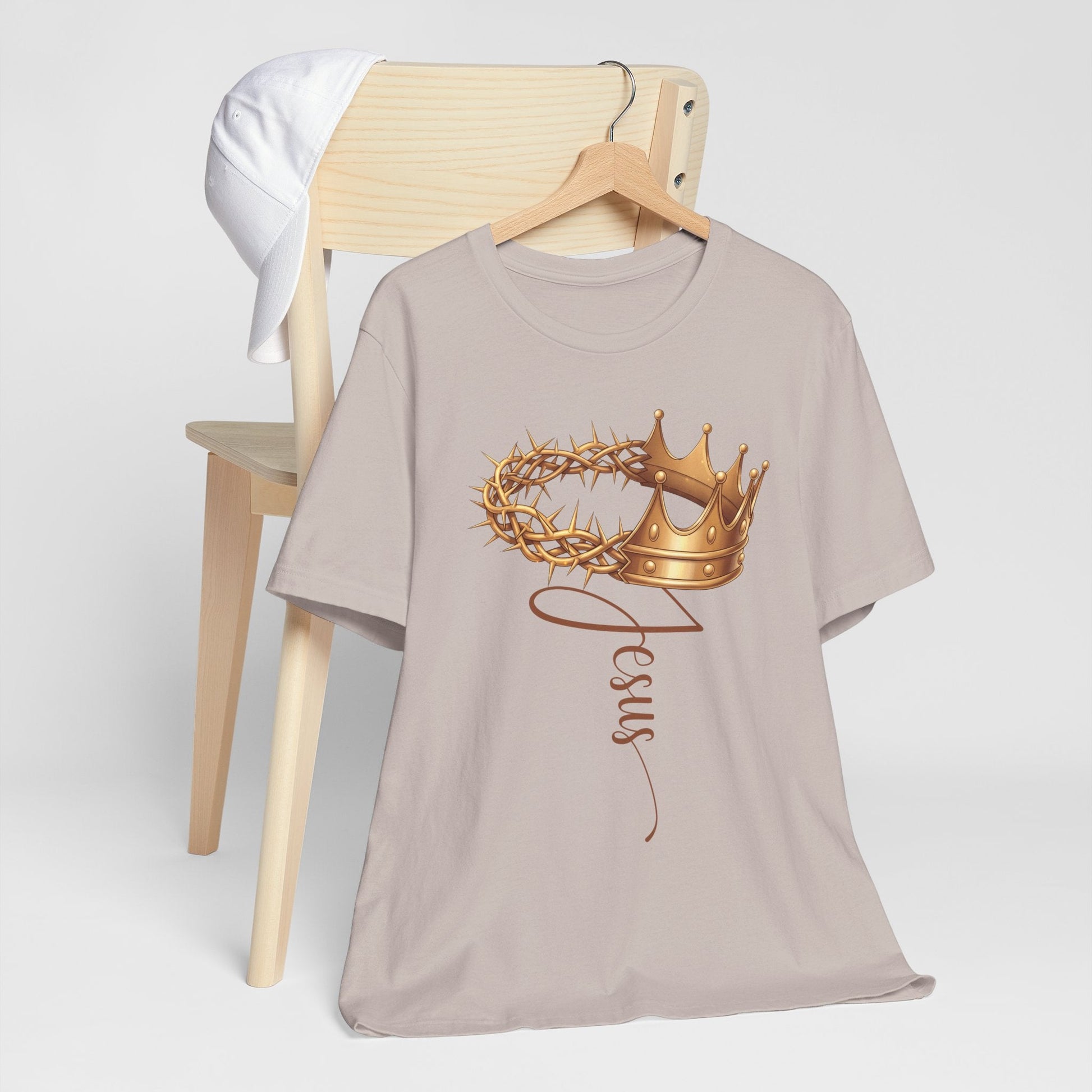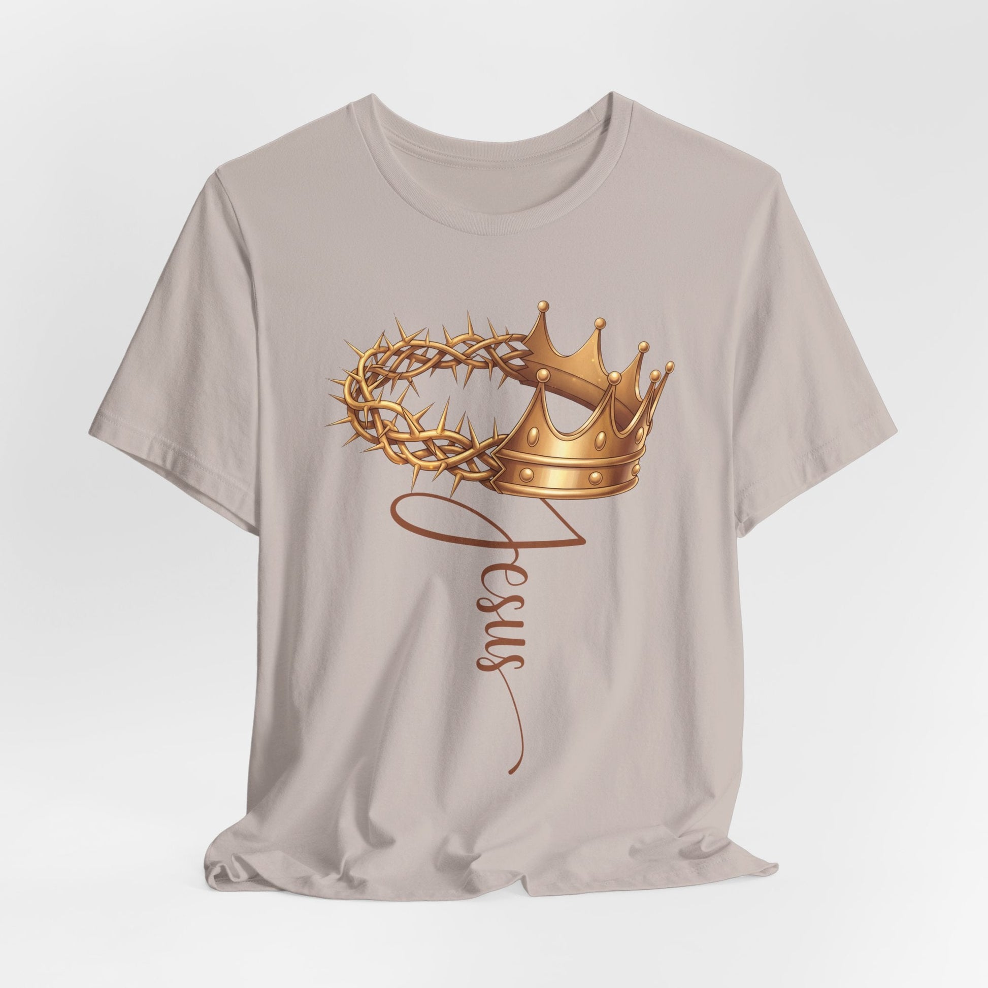 This striking T-shirt features a powerful illustration of the Crown of Thorns and a Golden Crown resting together, symbolizing both Christ's sacrifice and His eternal kingship. The elegant script "Jesus" beneath completes this deeply meaningful design — perfect for believers who want to wear their faith boldly. ✨