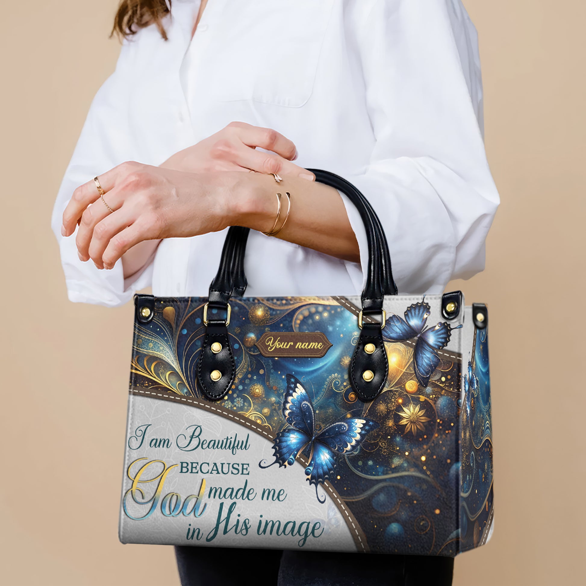HB75-✨ Custom Christian Handbag for Women – God Made Me in His Image – Faith Butterfly Purse – Inspirational Gift – Religious Tote Bag