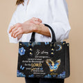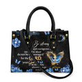 Carry bold faith and beauty with you every day. This stunning Christian handbag features glowing butterflies, deep blue florals, and the inspiring Bible verse from Joshua 1:9. Personalize it with your name to make it a powerful expression of strength, encouragement, and unwavering trust in God.
