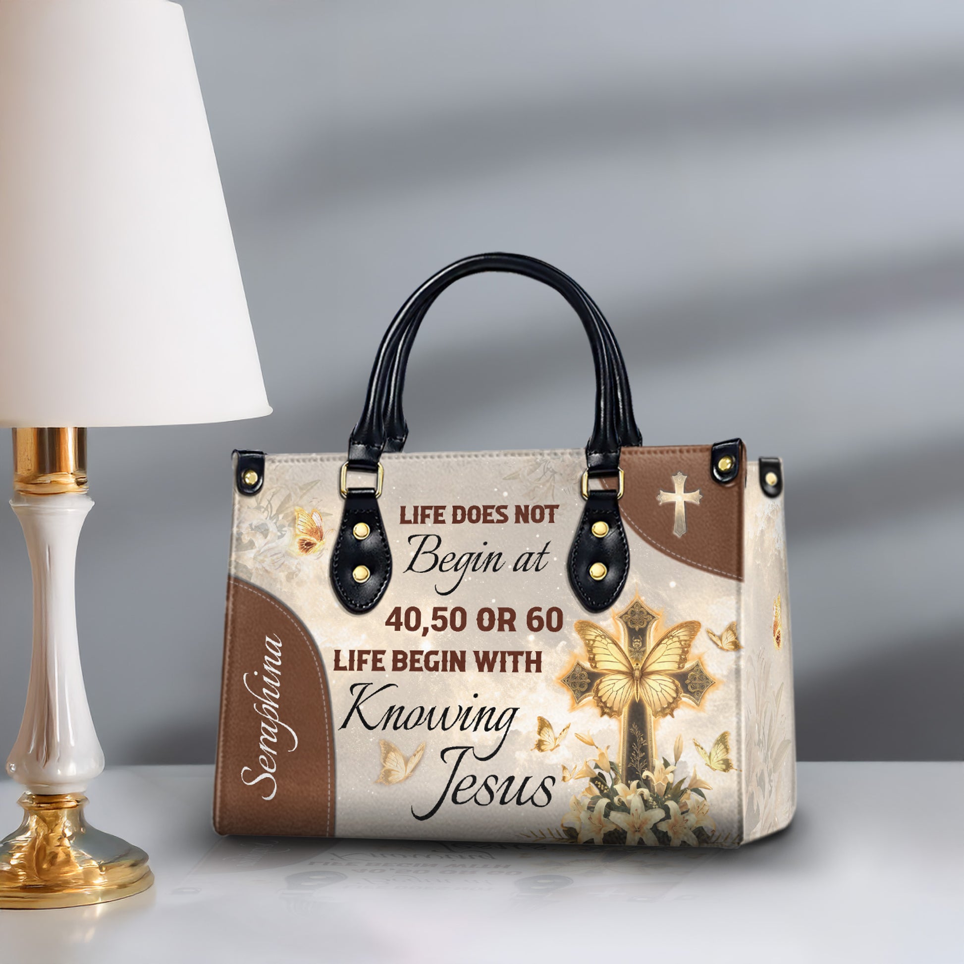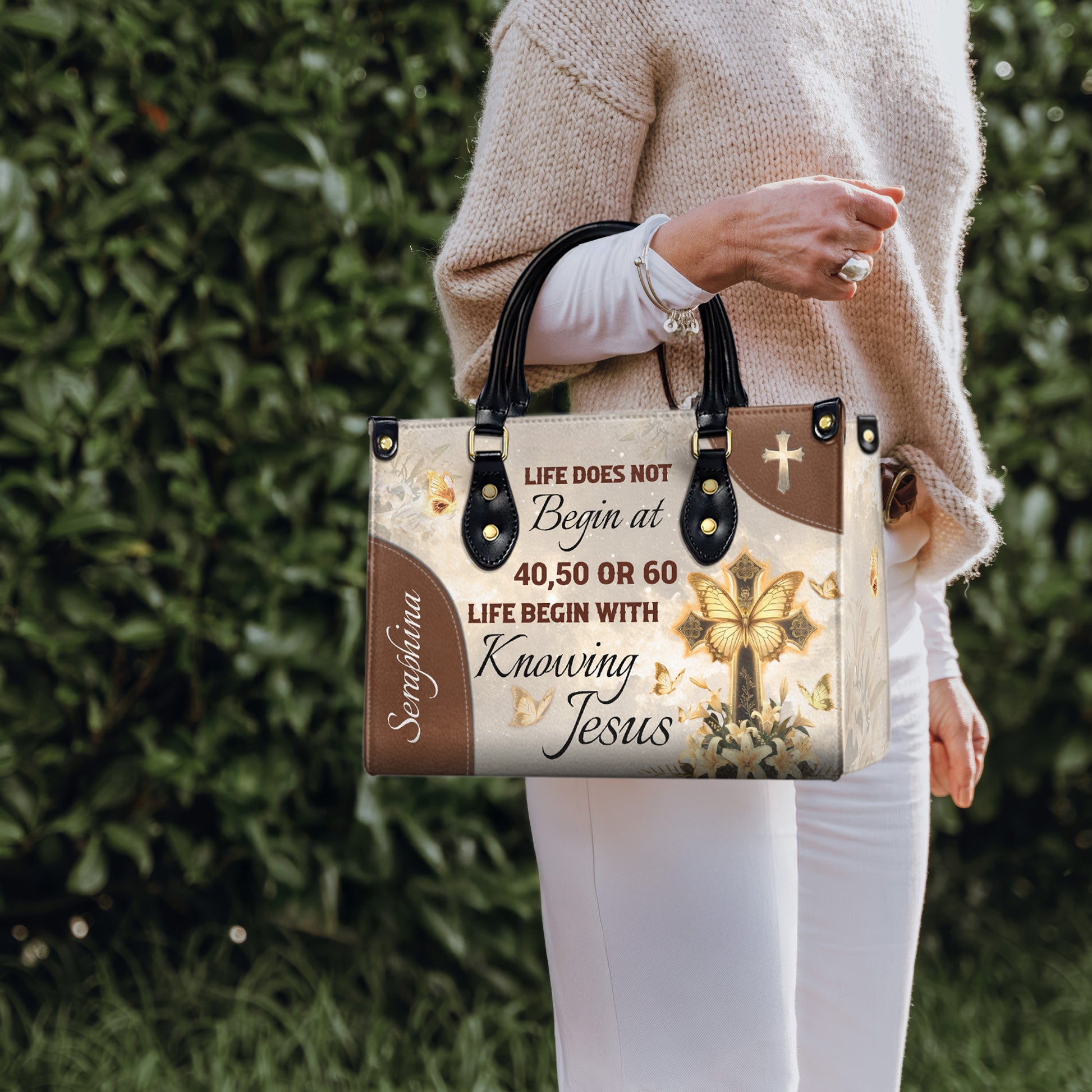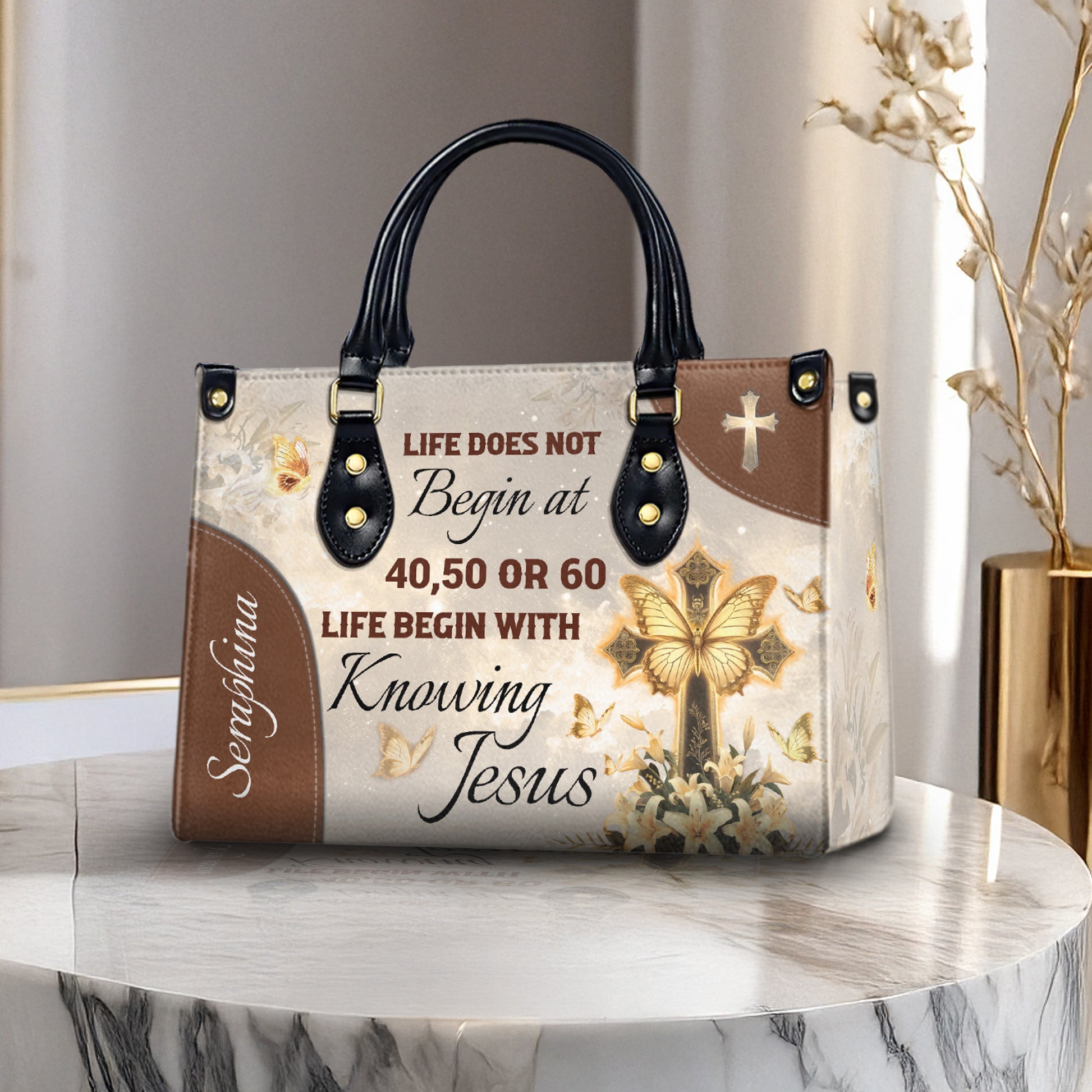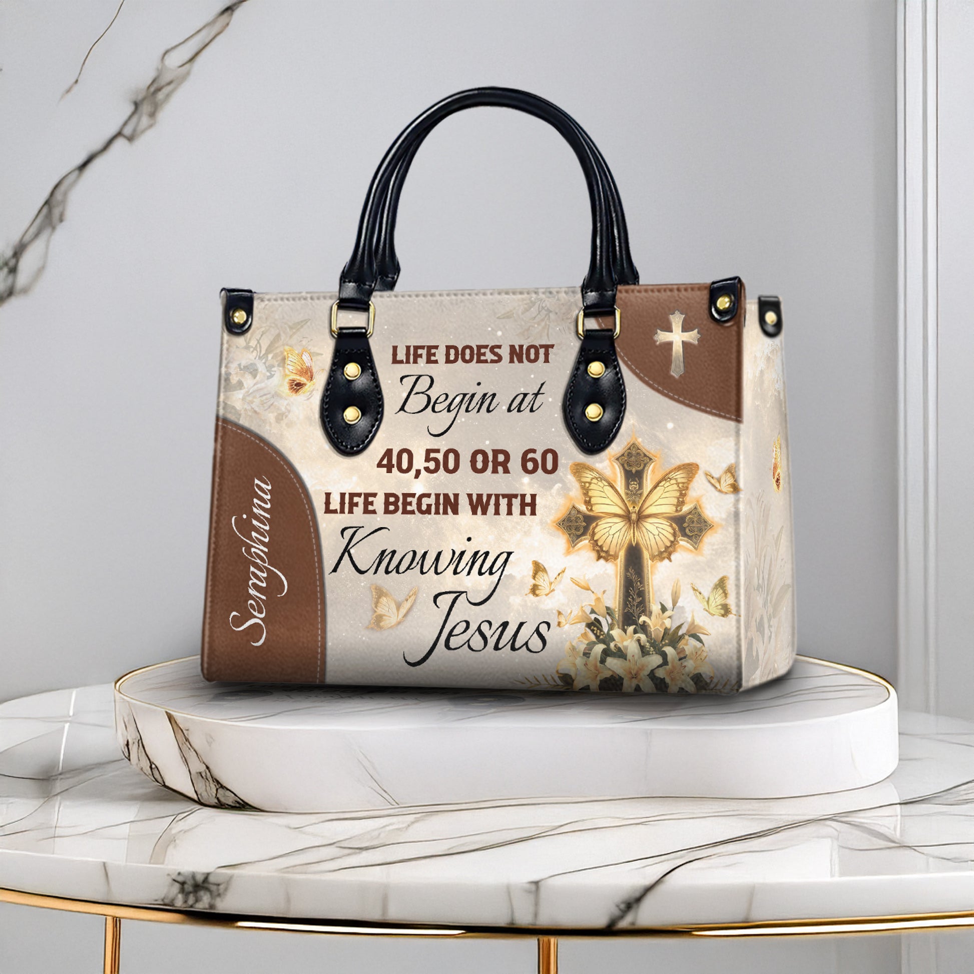 HB14-Custom Name Christian Leather Handbag – "Life Begins with Knowing Jesus" Religious Purse, Personalized Faith-Based Gift for Women
