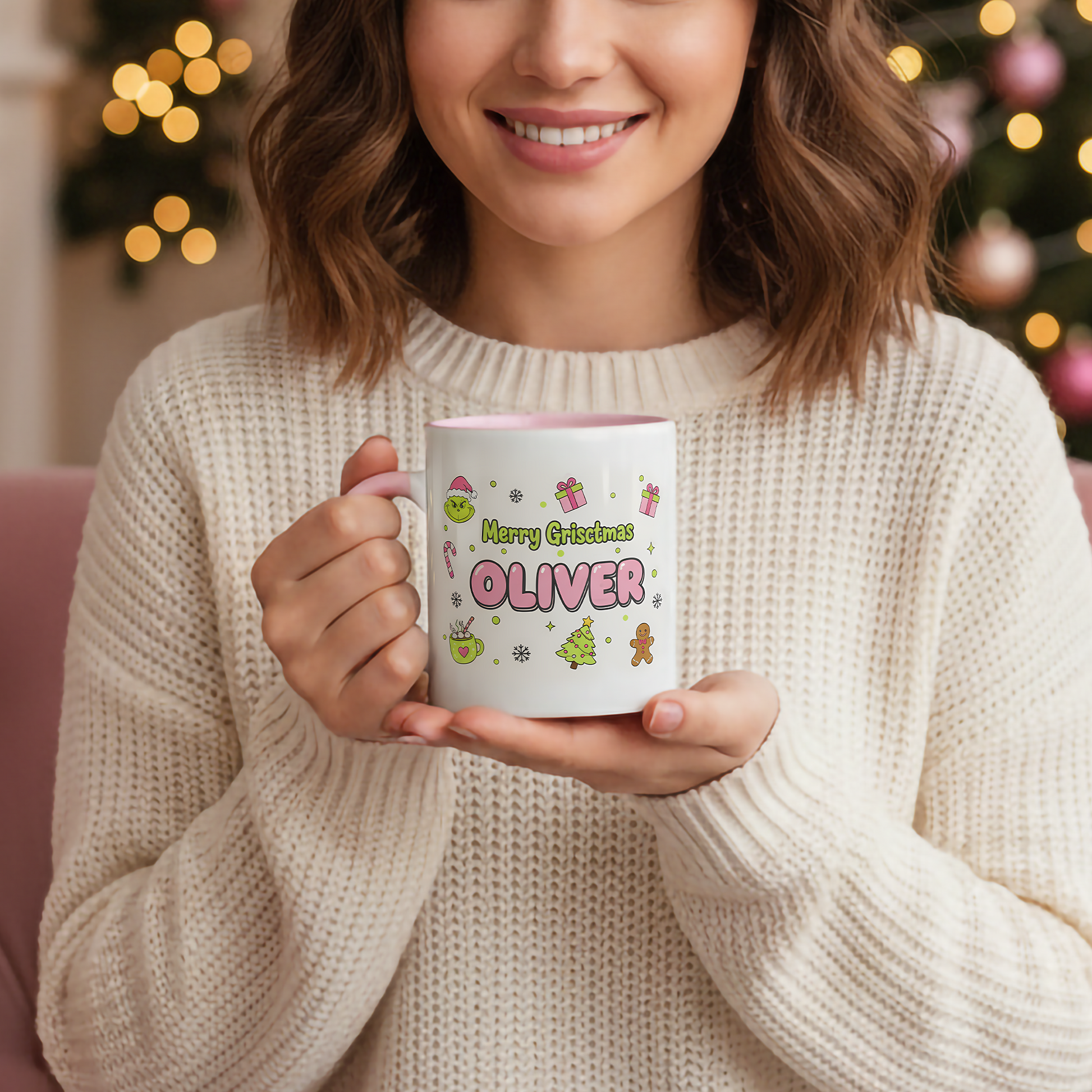 Personalized Merry Grinchmas Mug for Kids – Custom Name Christmas Cup, Cute Holiday Gift, Grinch Coffee Mug, Pink Handle Festive Mug| Mug 04