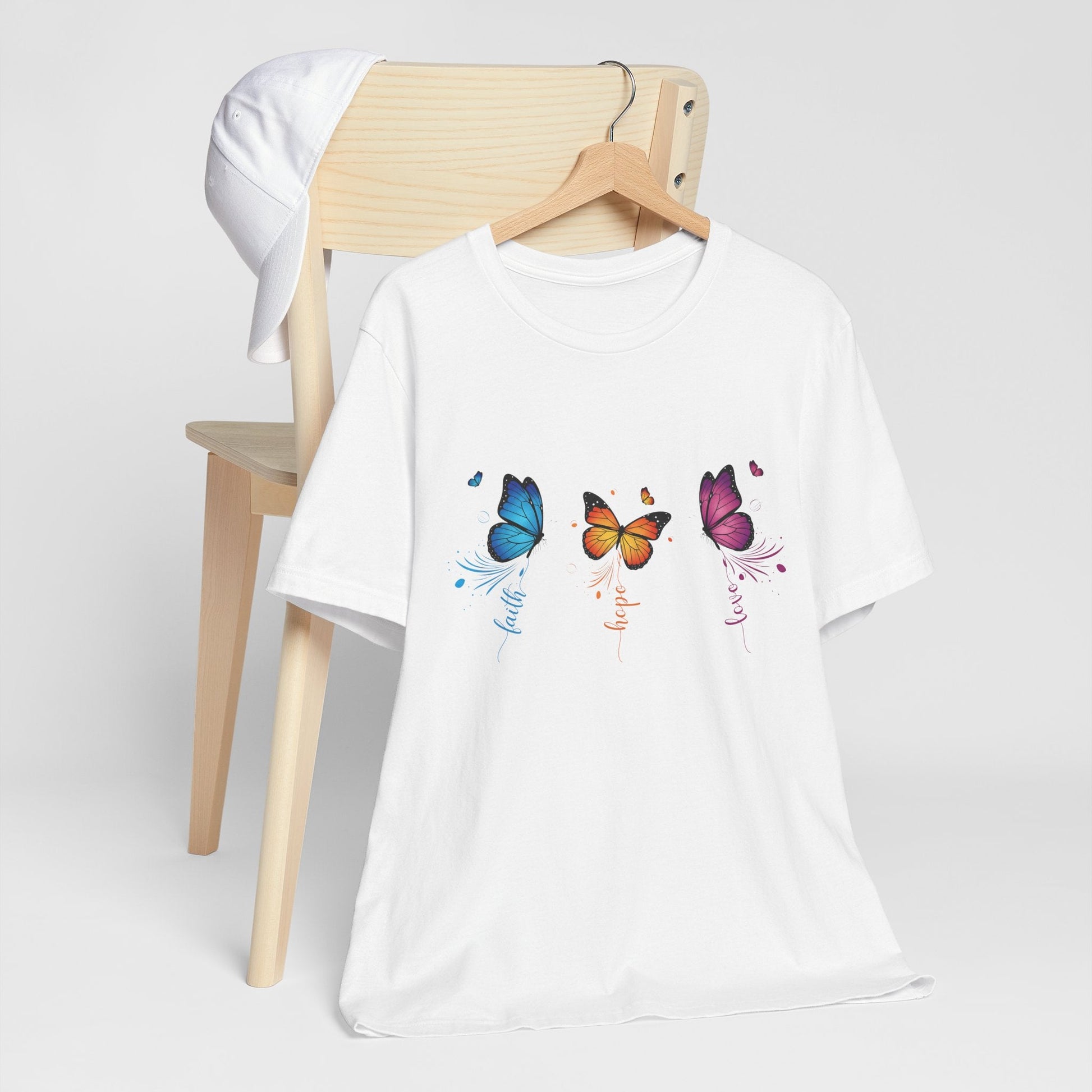 Let your outfit speak truth and inspiration with this beautiful butterfly-themed t-shirt featuring the powerful trio: Faith, Hope, Love. Each vibrant butterfly represents a core Christian value—designed to uplift your spirit and brighten anyone’s day.