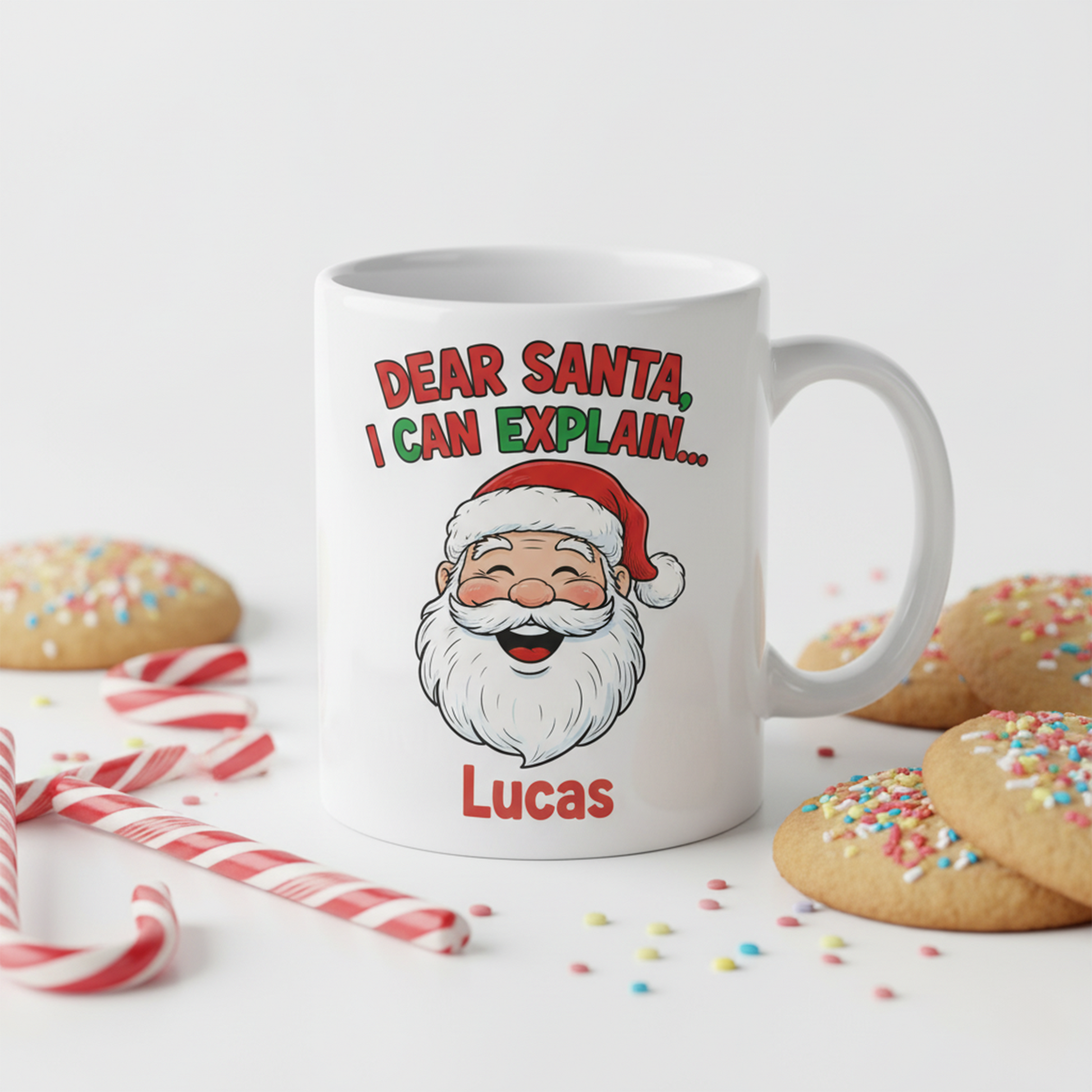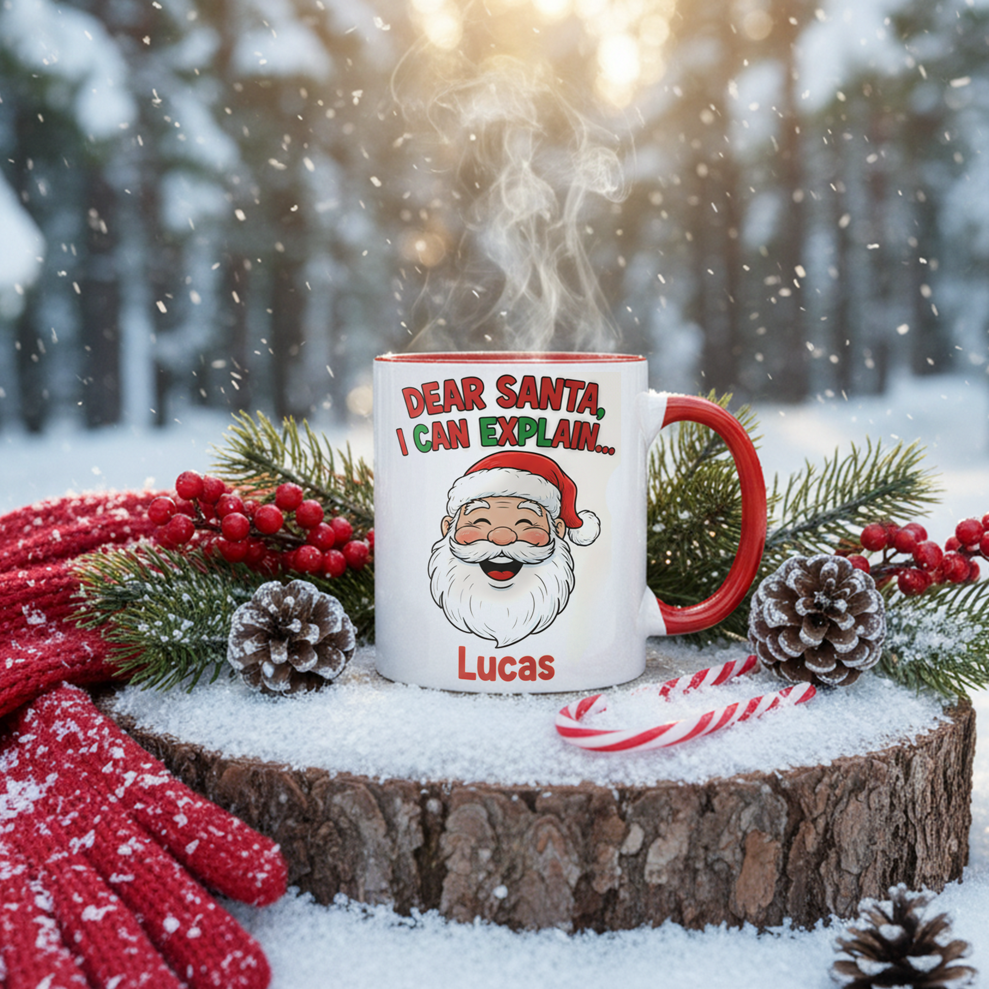 Imagine your little one sipping warm cocoa, proudly holding a mug with their very own name and the phrase: “Dear Santa, I can explain…”
