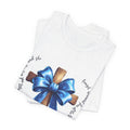 Celebrate your inner strength and dignity with this beautifully designed Christian t-shirt featuring a rustic wooden cross adorned with a radiant blue bow. Surrounding the design is the uplifting verse from Proverbs 31:25: "She is clothed with strength and dignity, and she laughs without fear of the future." 🌟 This shirt is a daily reminder of God's promises and your God-given grace.
