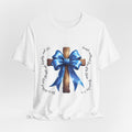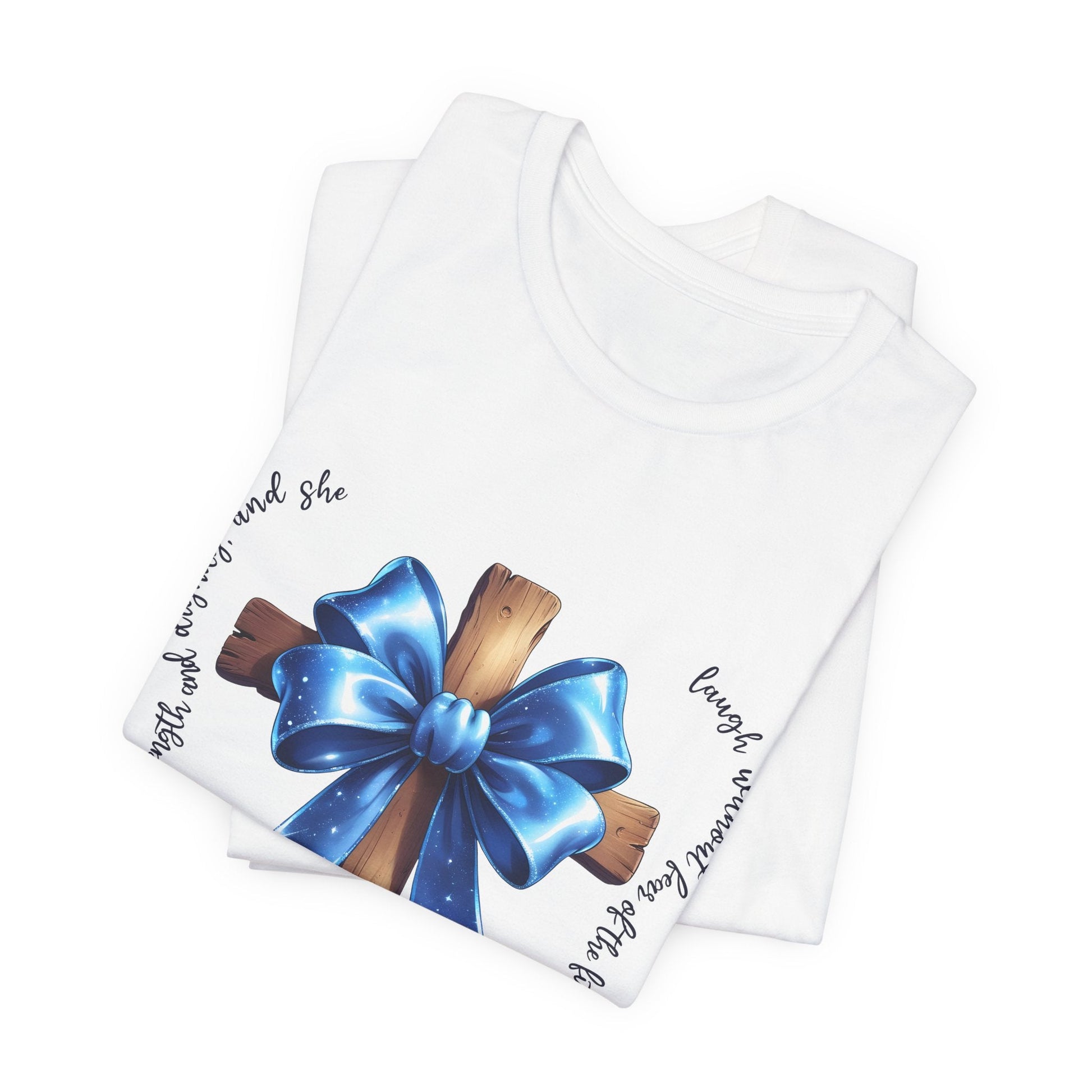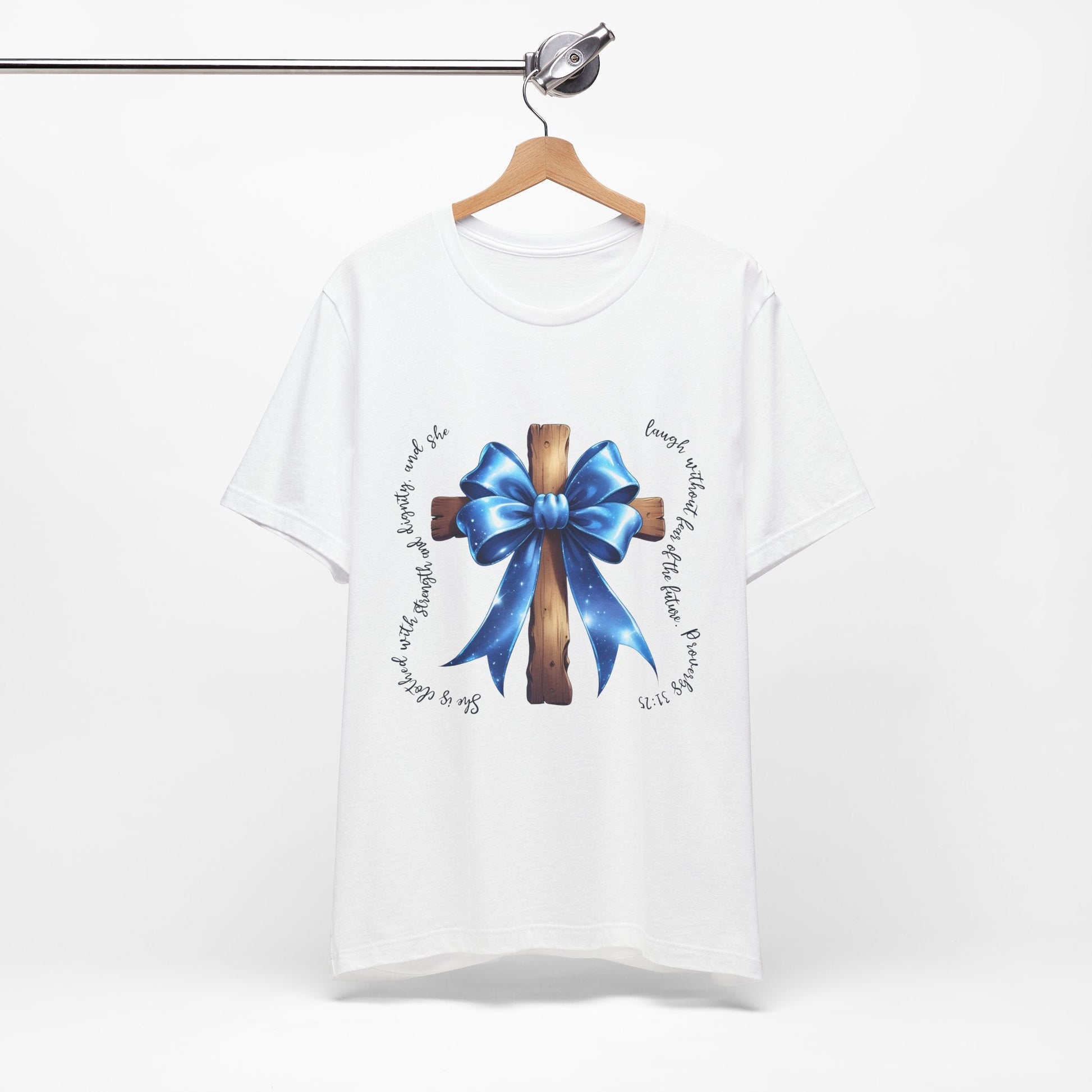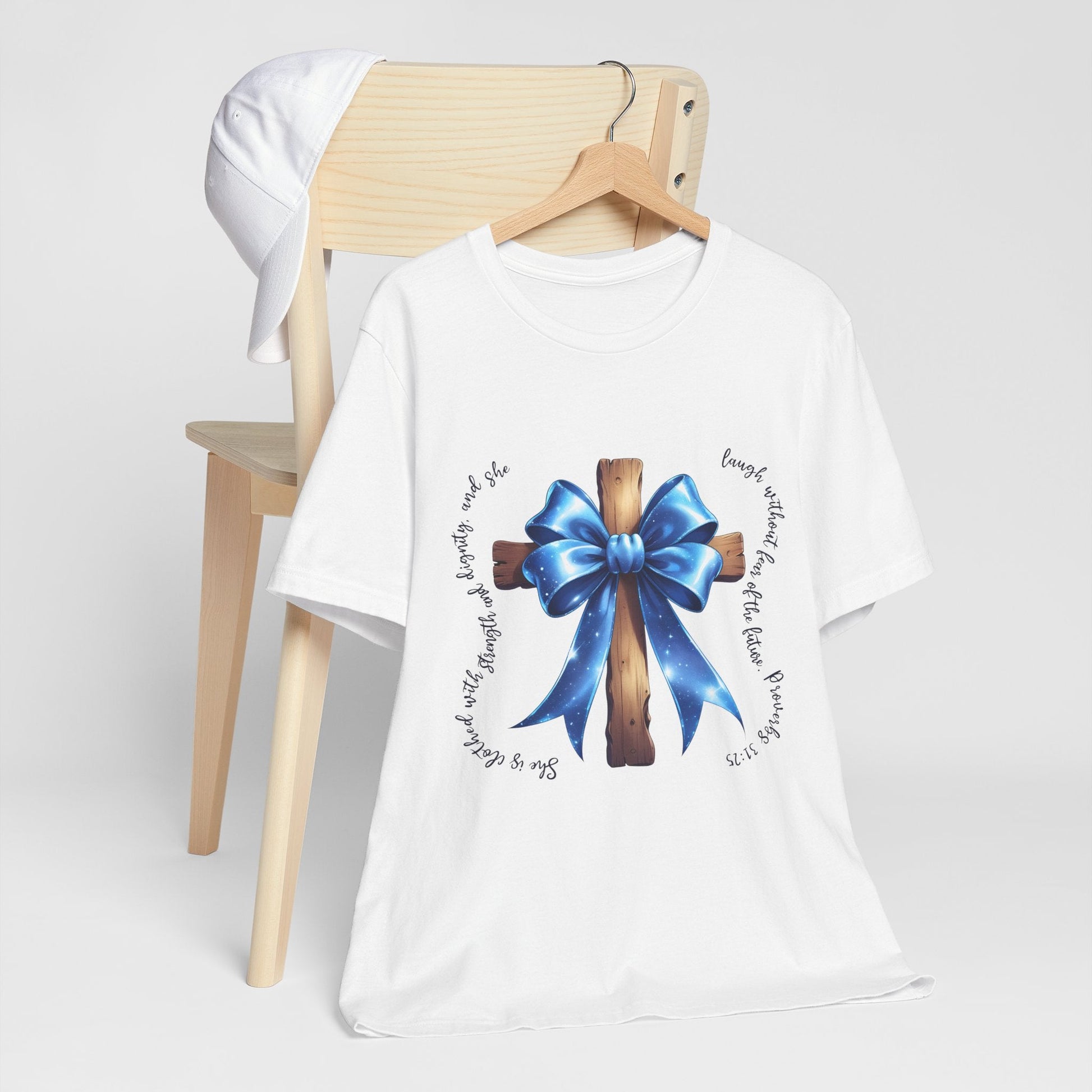 Proverbs 31:25 Christian Shirt with Blue Bow Cross, She is Clothed in Strength and Dignity Bible Verse Tee, Faith Unisex T-Shirt
