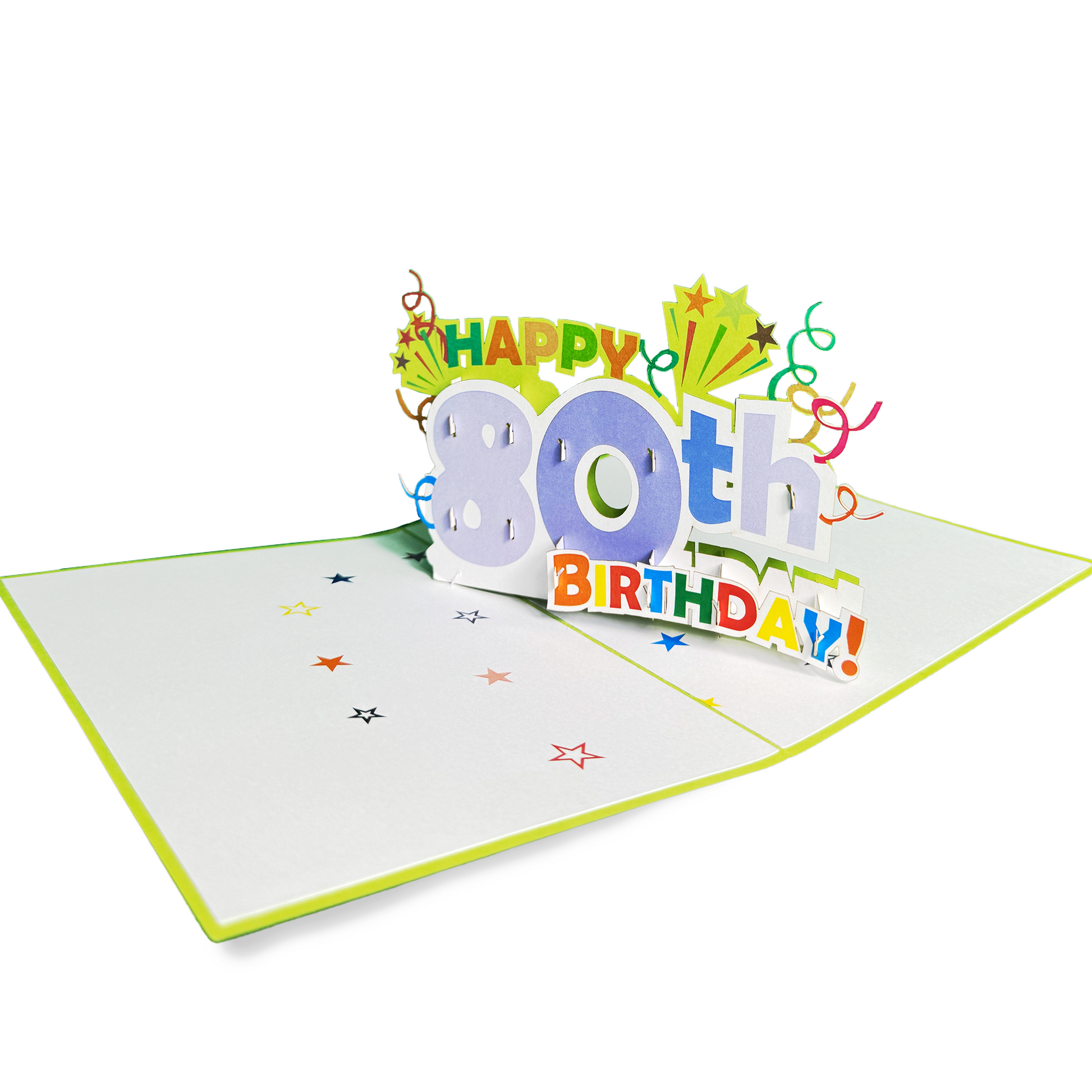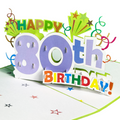Open the card to reveal a delightful pop-up surprise bursting with color, confetti, and the words “Happy 80th Birthday!” in bold, playful lettering. It’s the perfect way to make your loved one smile on their special day.