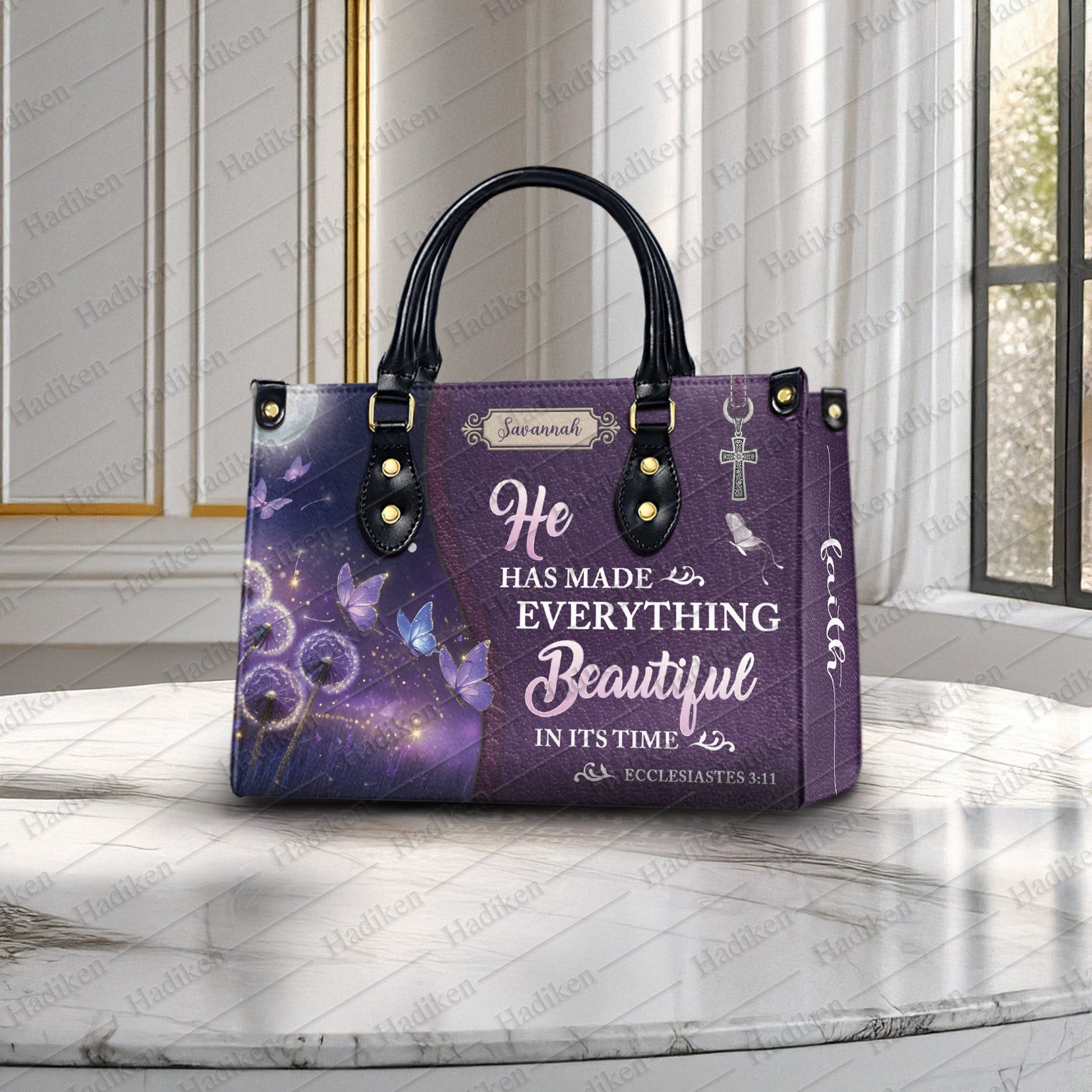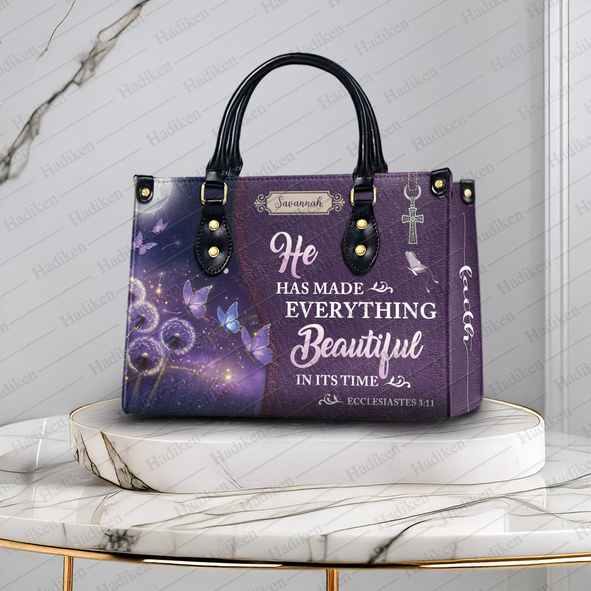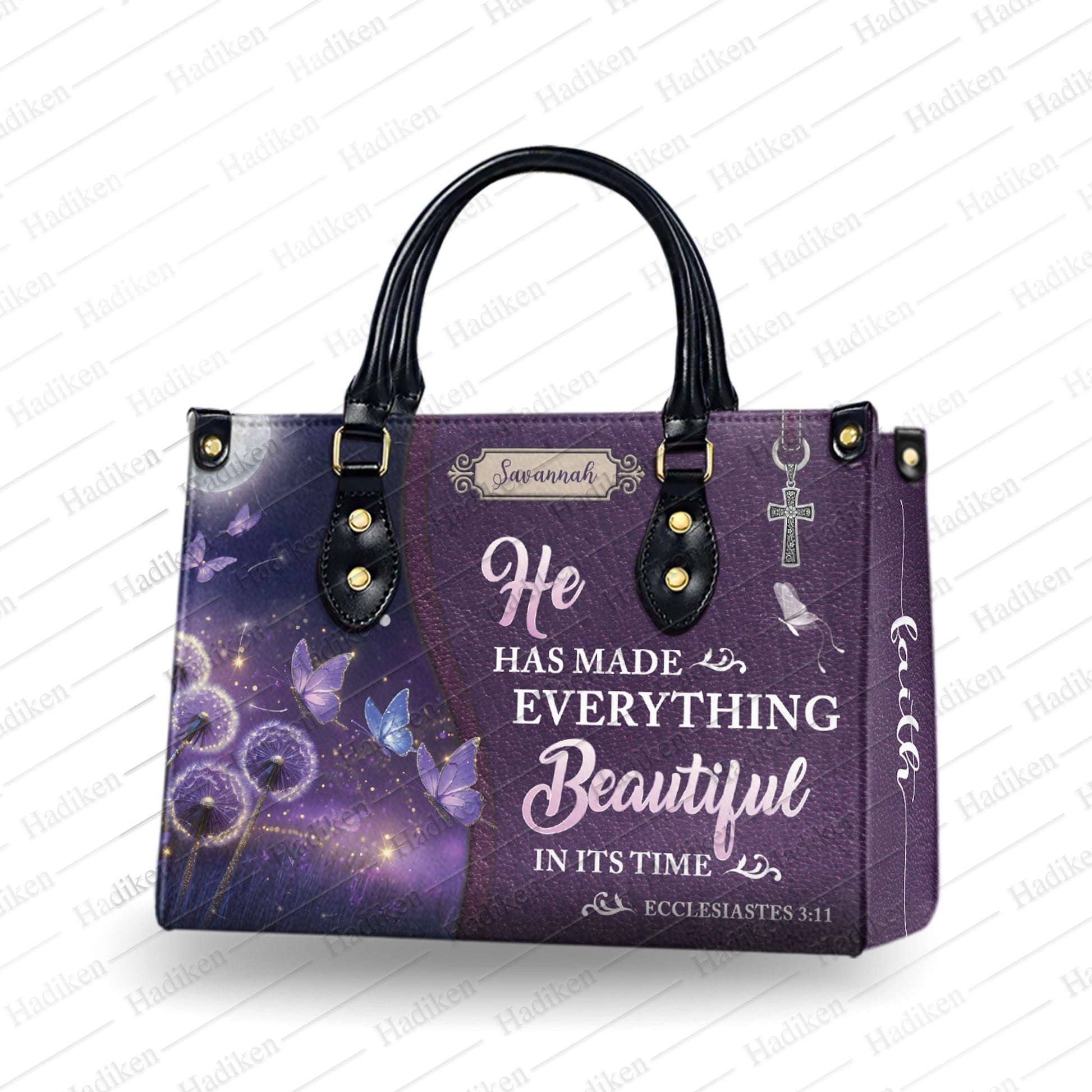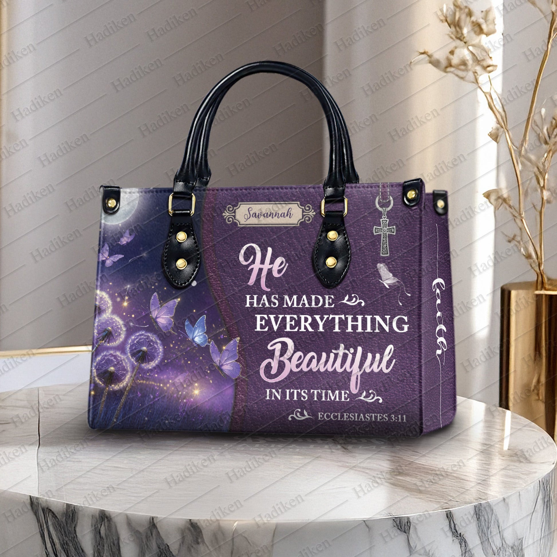 HB103 - Christian Handbag with Ecclesiastes 3:11 Verse, Custom Name Purple Faith Tote, Inspirational Gift for Women of God