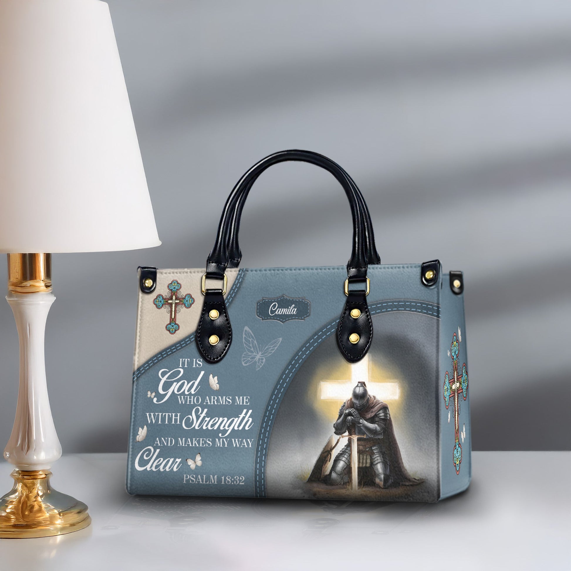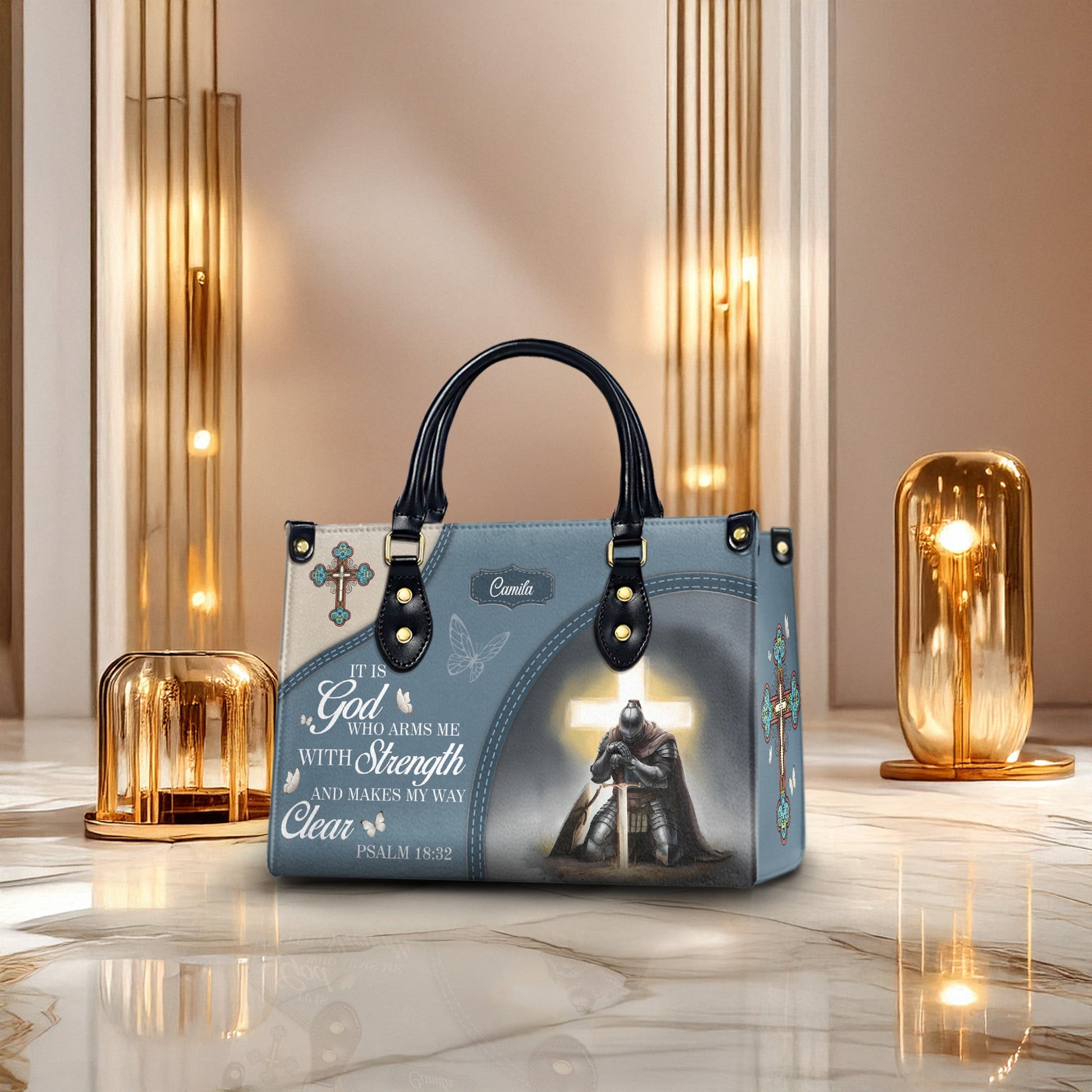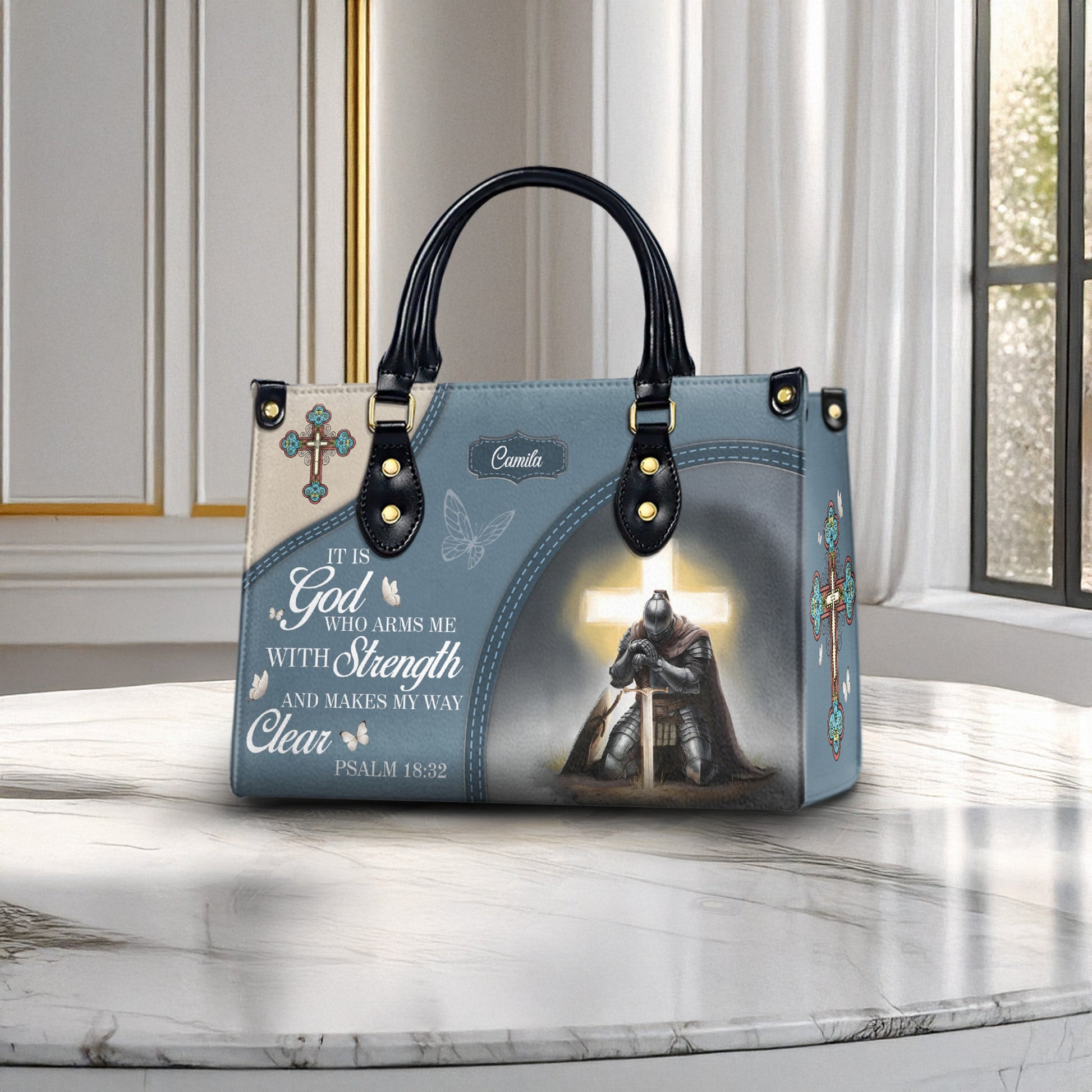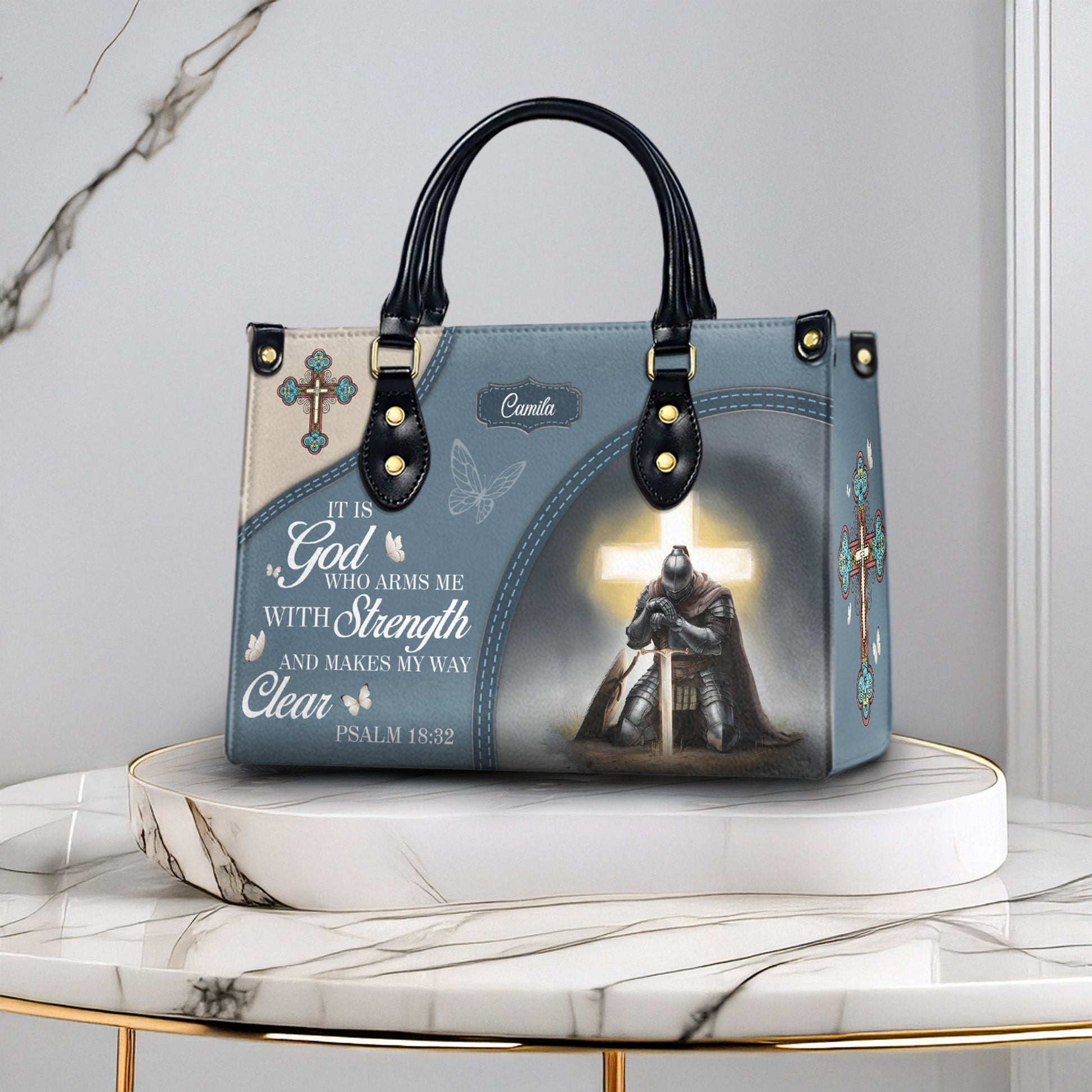 HB105 Psalm 18:32 Christian Handbag – Custom Name Bible Verse Purse with Knight and Cross, Faith Gift for Women