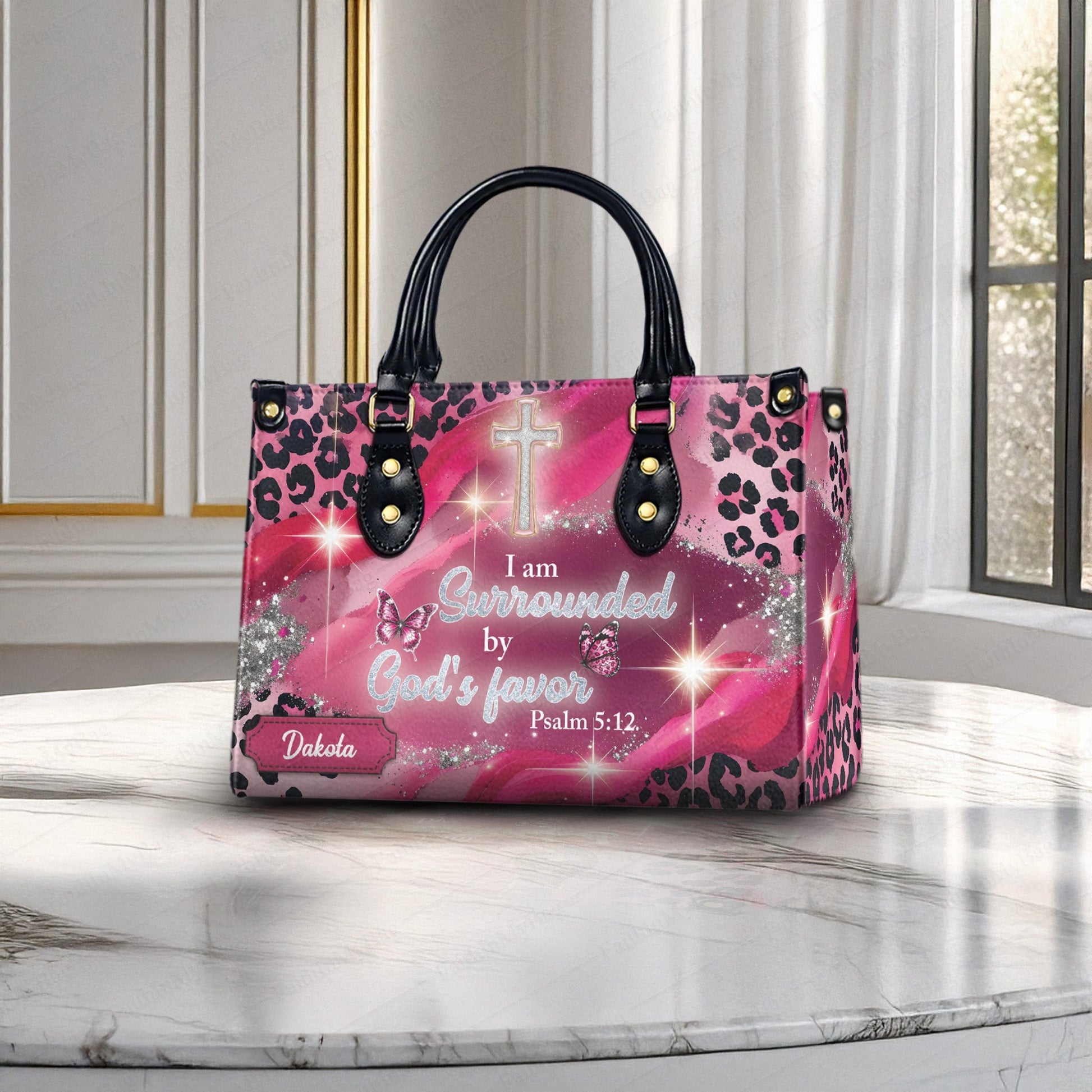 ✨ Surrounded by God’s Favor – Custom Name Christian Handbag with Bible Verse | Faith Inspired Leather Purse