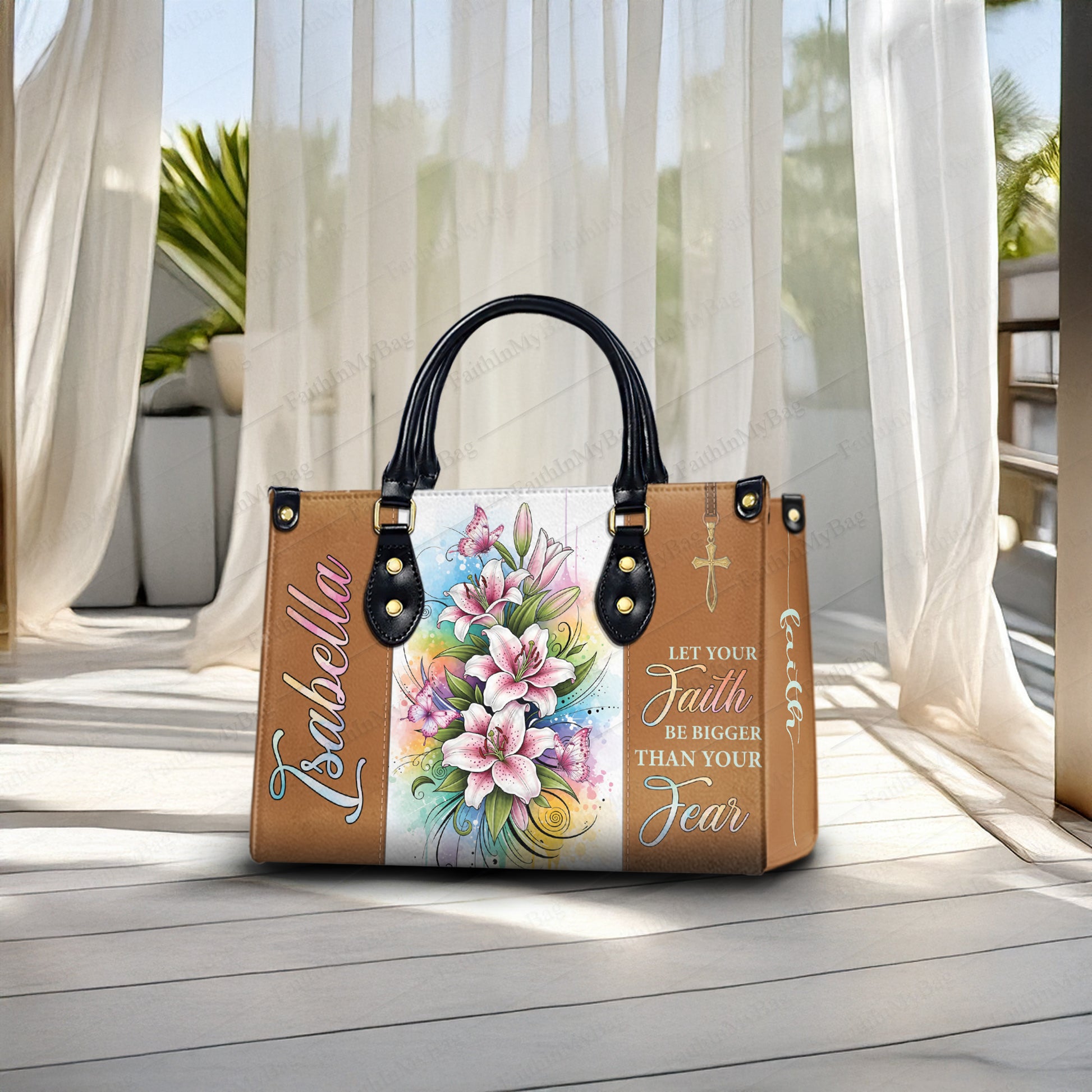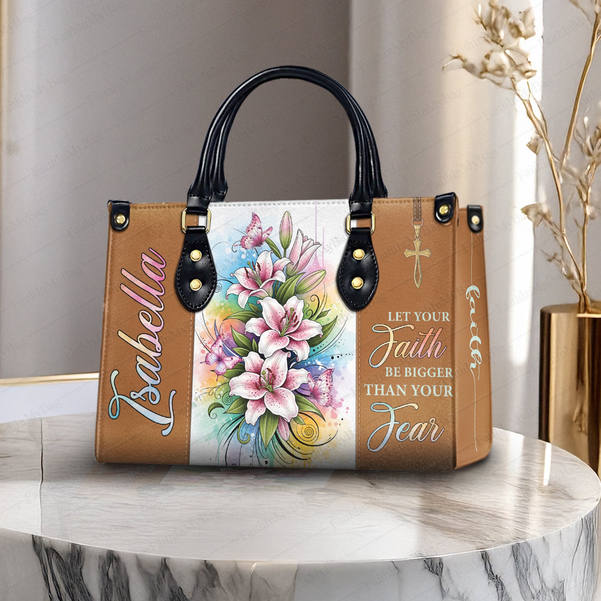 HB130 - Personalized Christian Handbag with Bible Verse – Let Your Faith Be Bigger Than Your Fear – Floral Custom Name Tote Bag