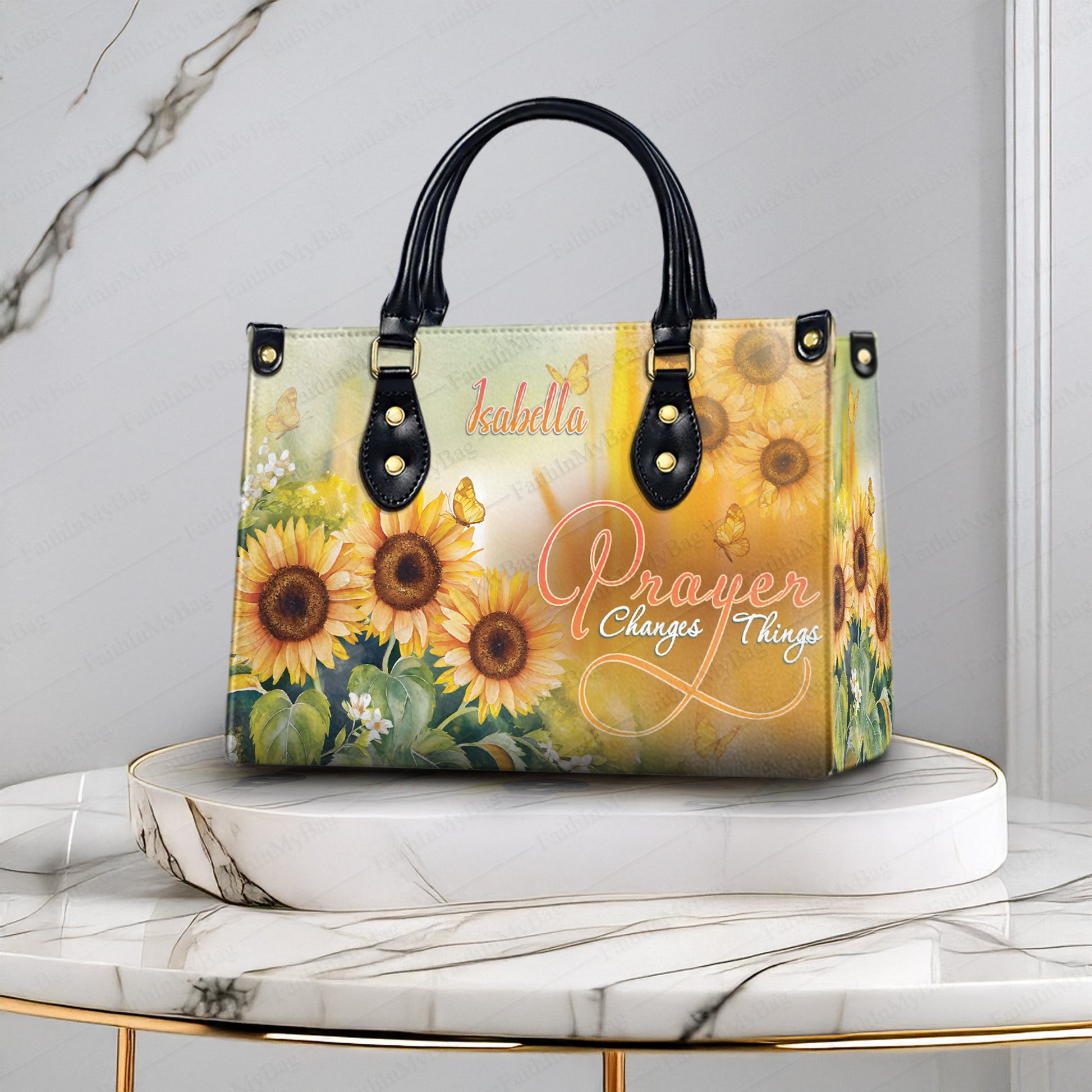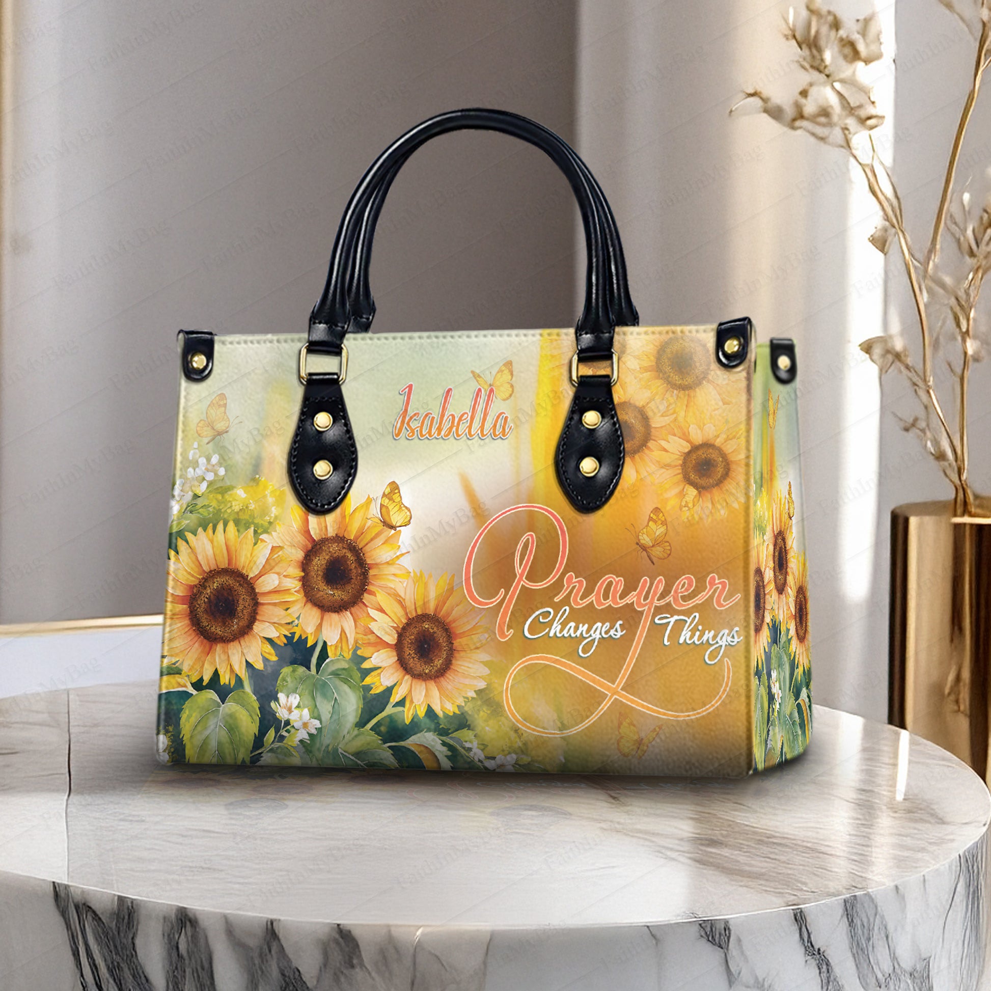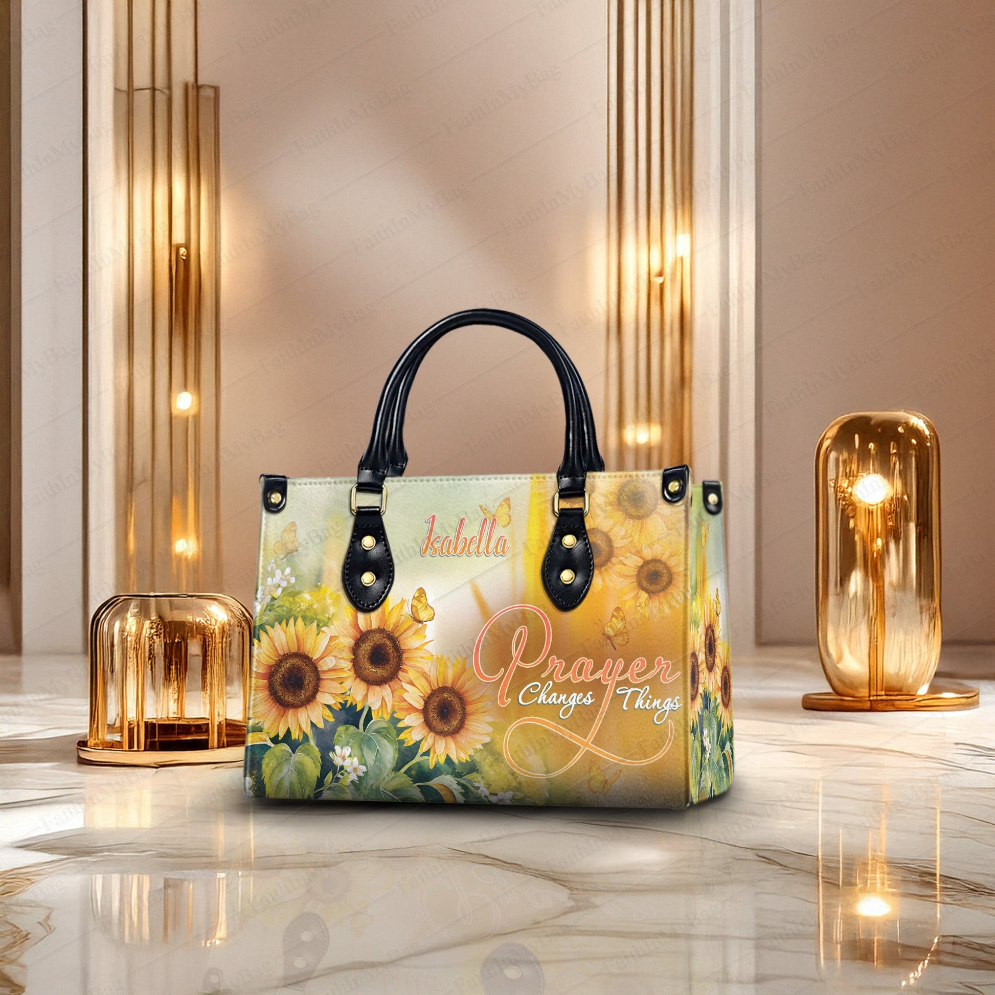 HB117 Custom Name Christian Handbag, Prayer Changes Things Sunflower Purse, Faith Inspired Religious Bag for Women, Personalized Gift