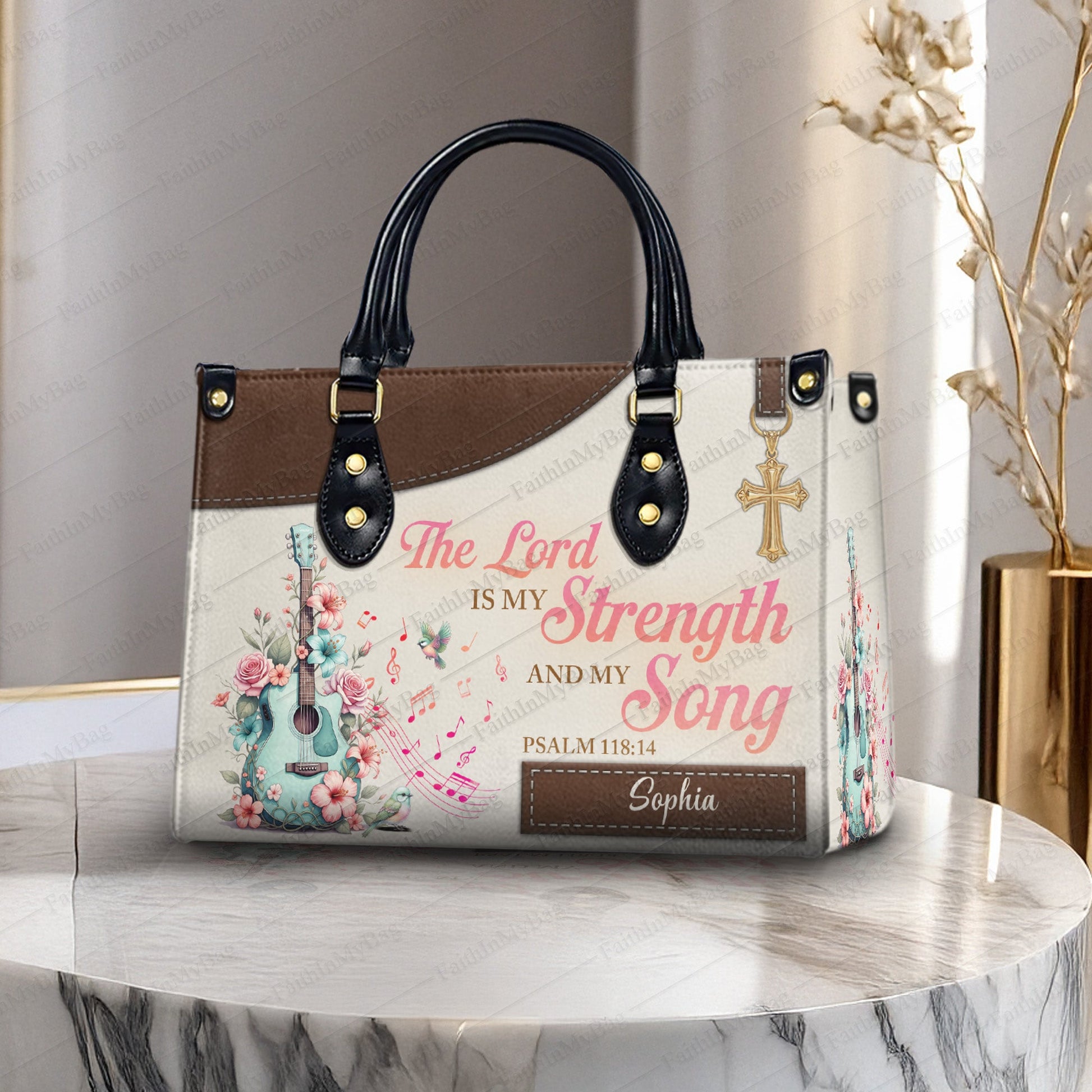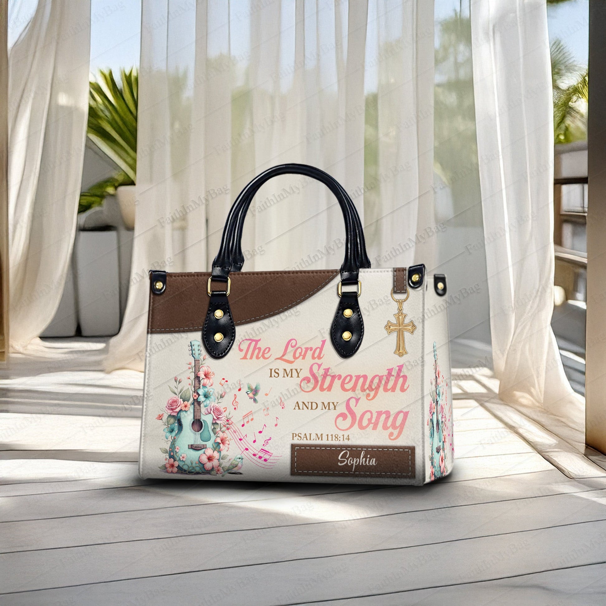HB112 Christian Handbag with Psalm 118:14, Custom Name Purse, The Lord Is My Strength and Song, Faith Inspired Leather Bag Gift