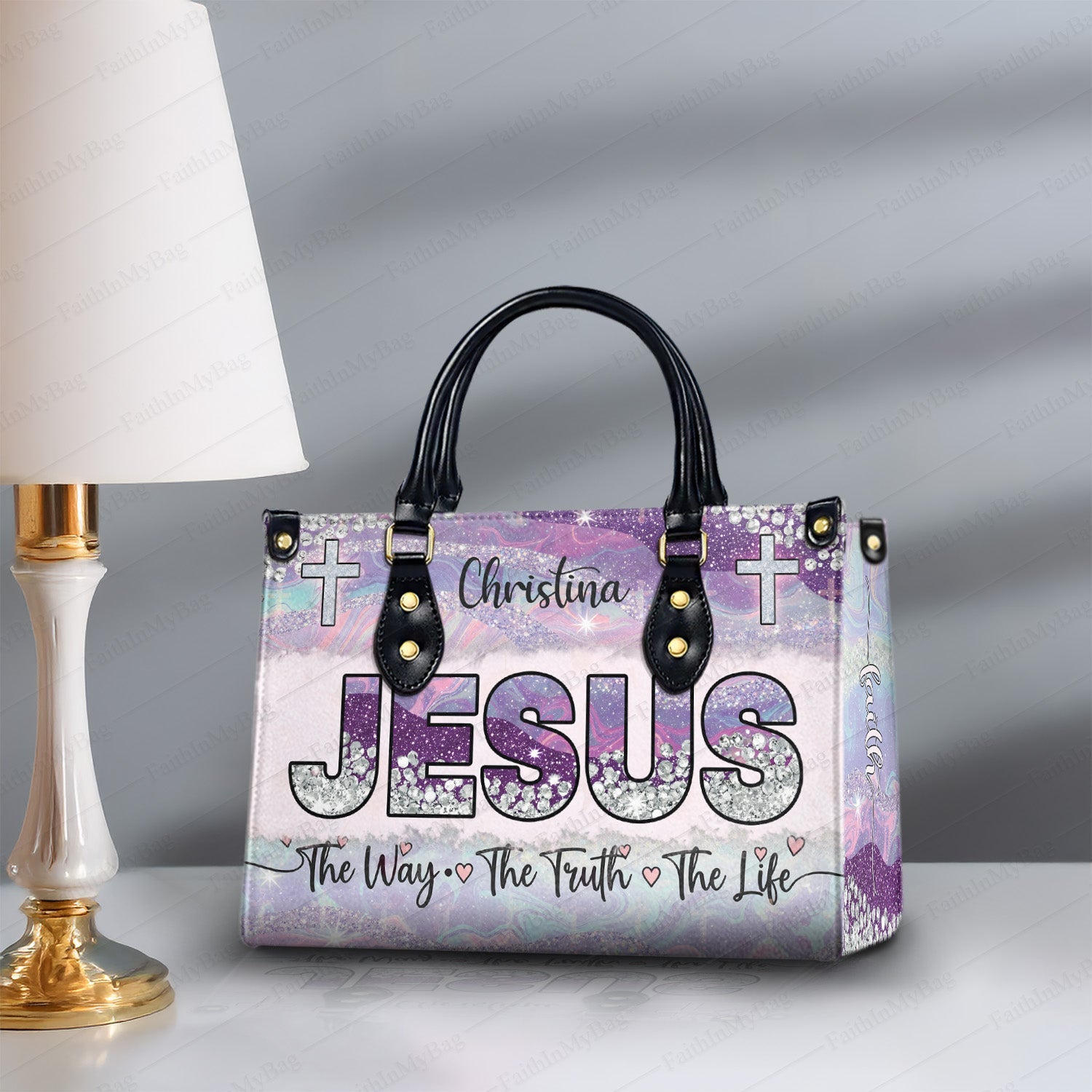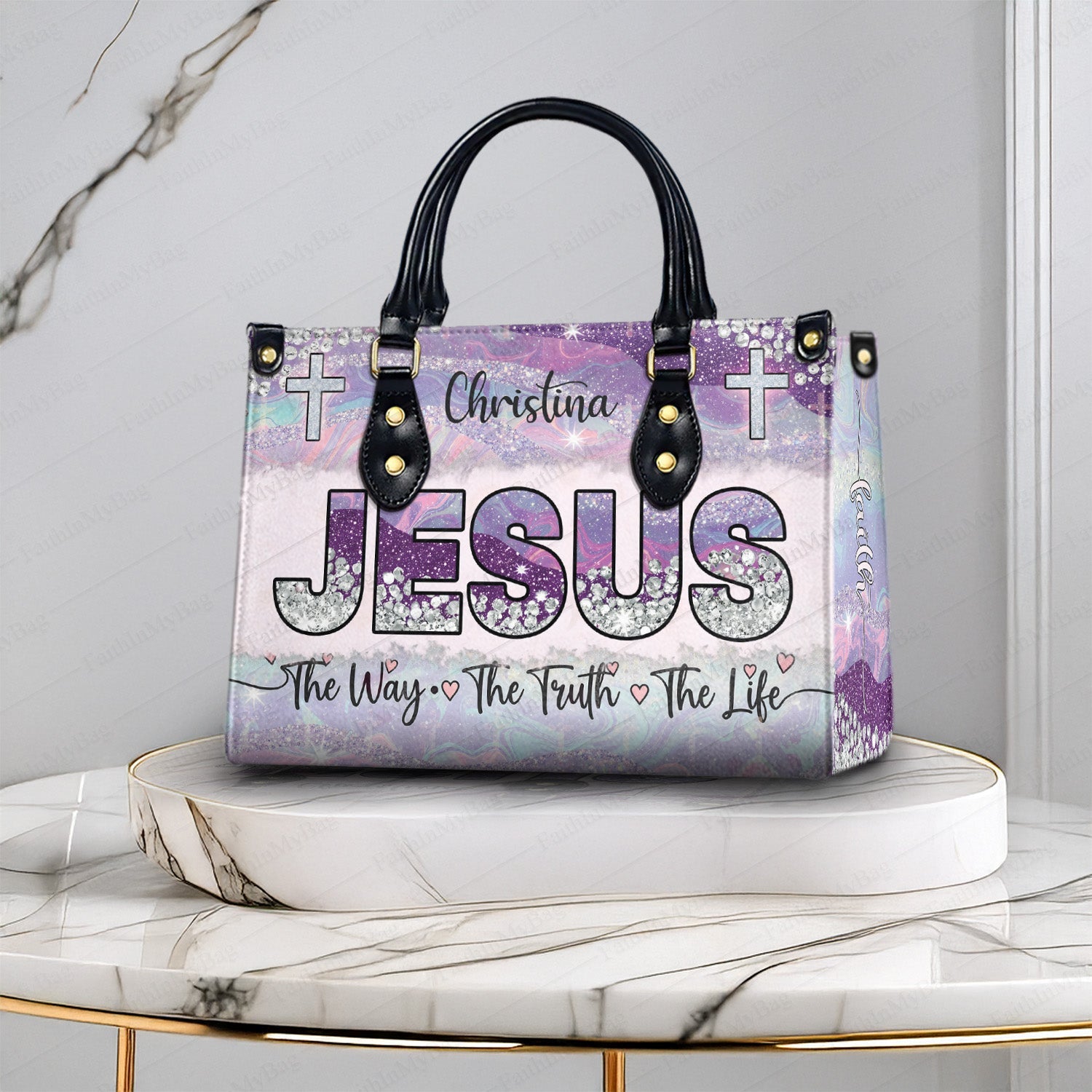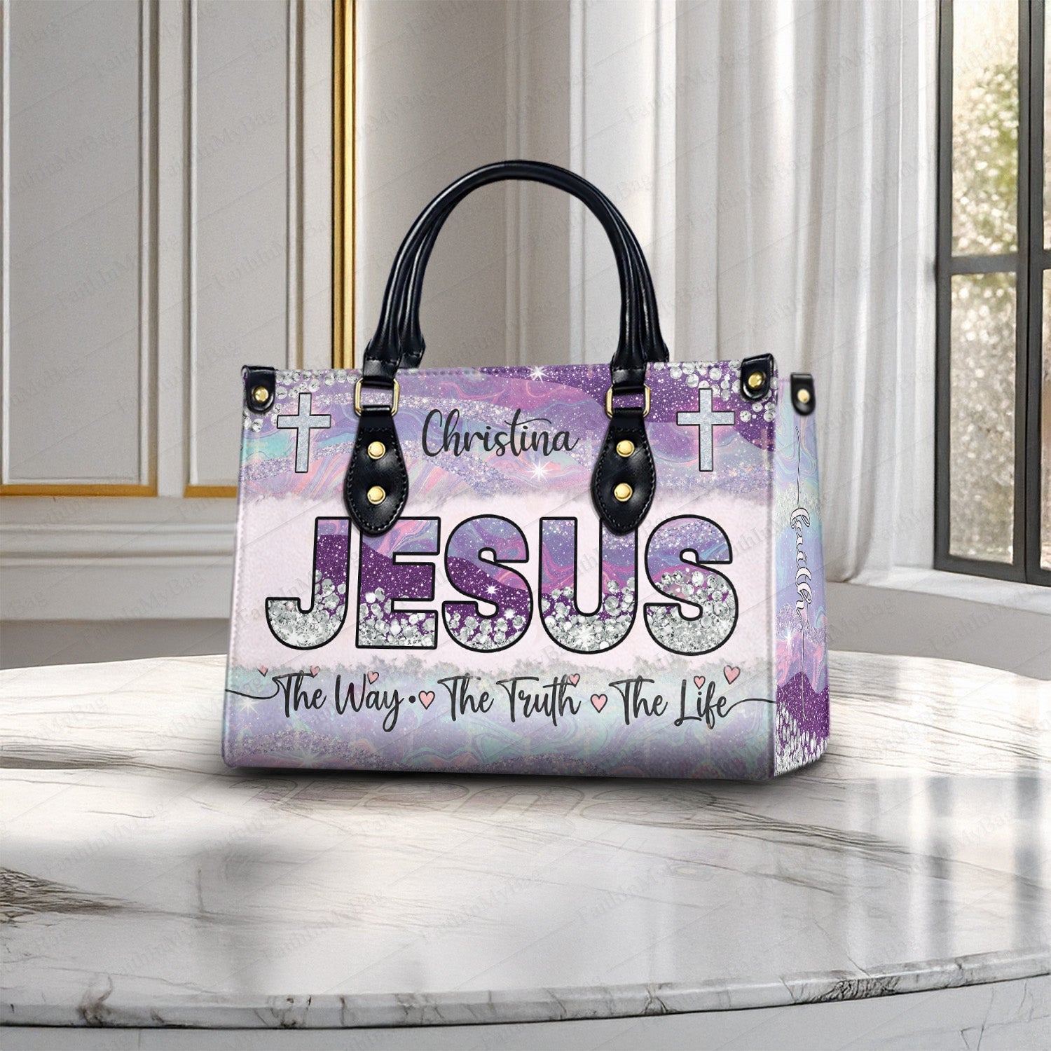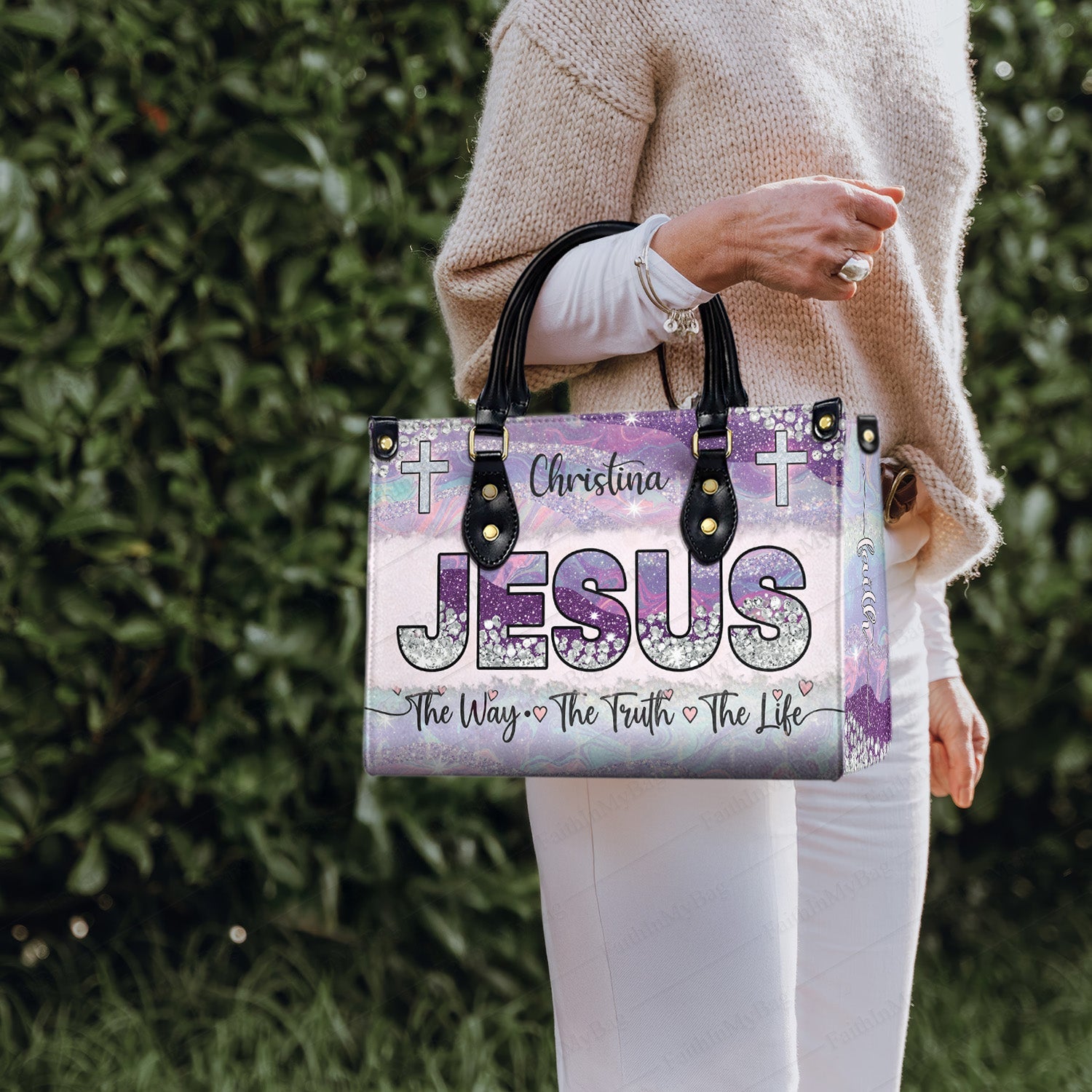 HB120 Custom Name Christian Handbag – Jesus The Way The Truth The Life Bag for Women – Religious Gift Purse – Faith-Based Tote with Cross Design