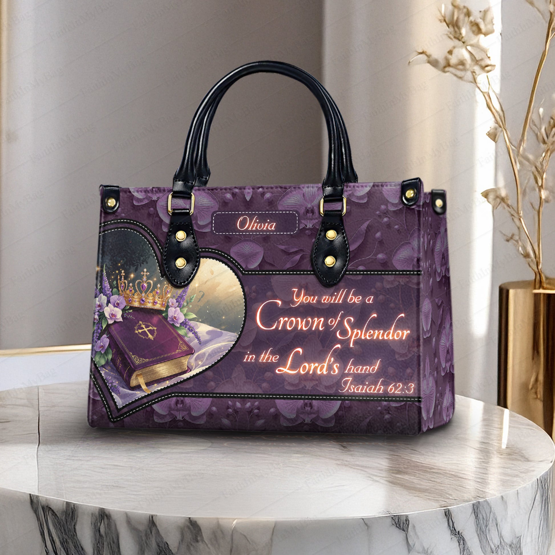 HB111 - Personalized Christian Handbag – Isaiah 62:3 Bible Verse Leather Tote – Custom Name Faith Gift for Women