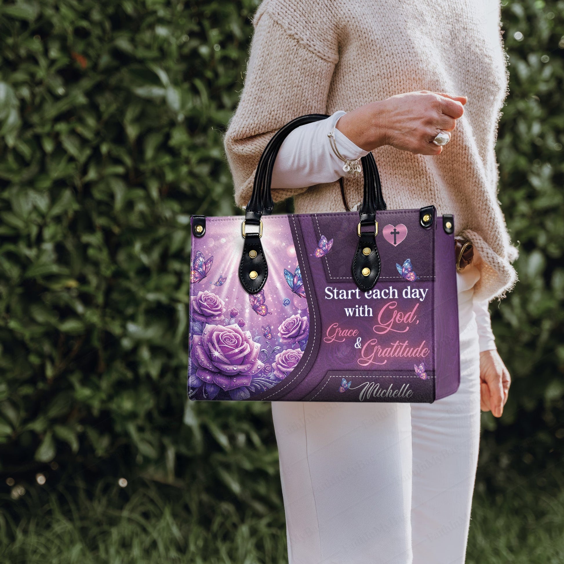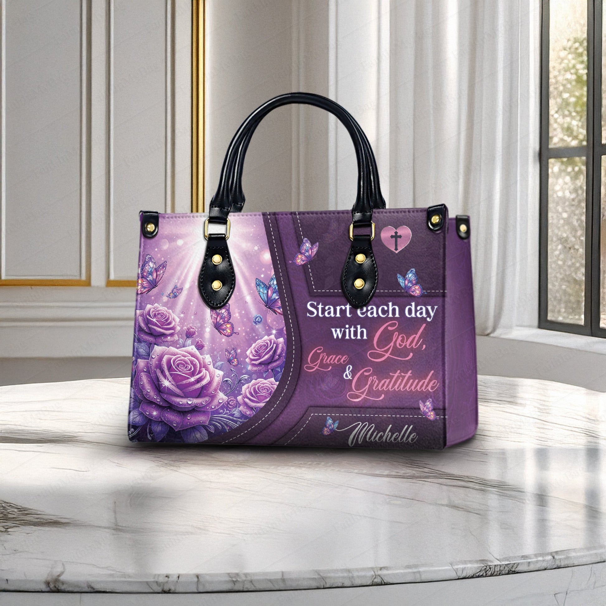HB142 - Custom Name Christian Handbag β Grace and Gratitude Bible Verse Purse β Faith Inspired Leather Bag for Women