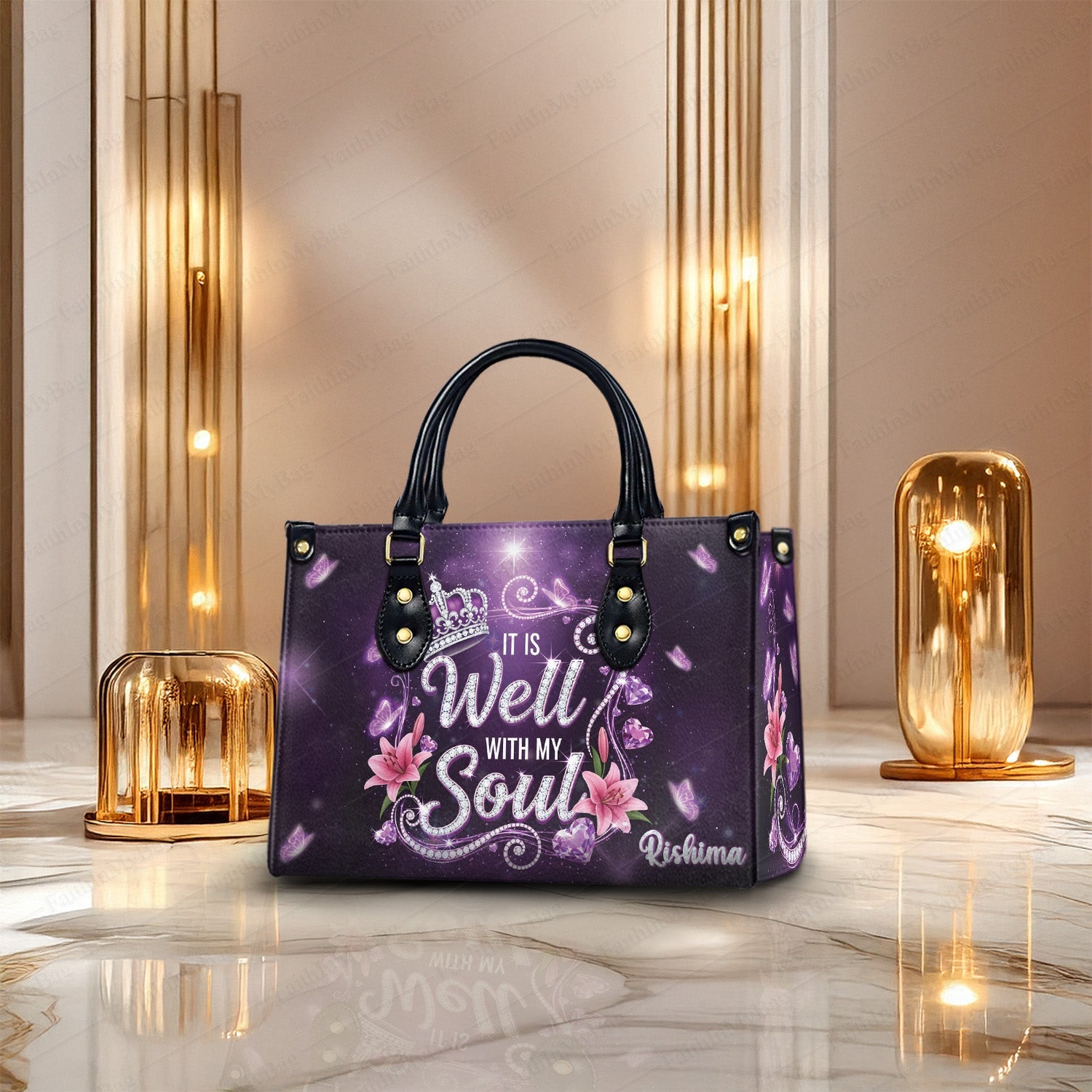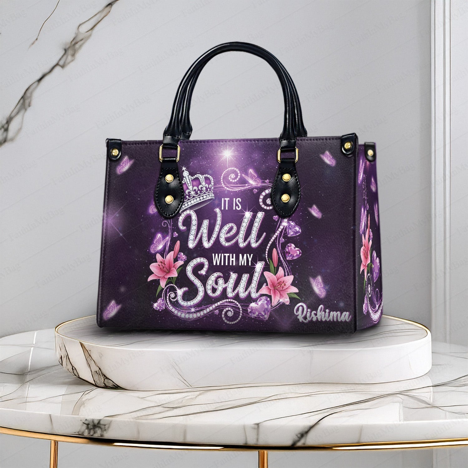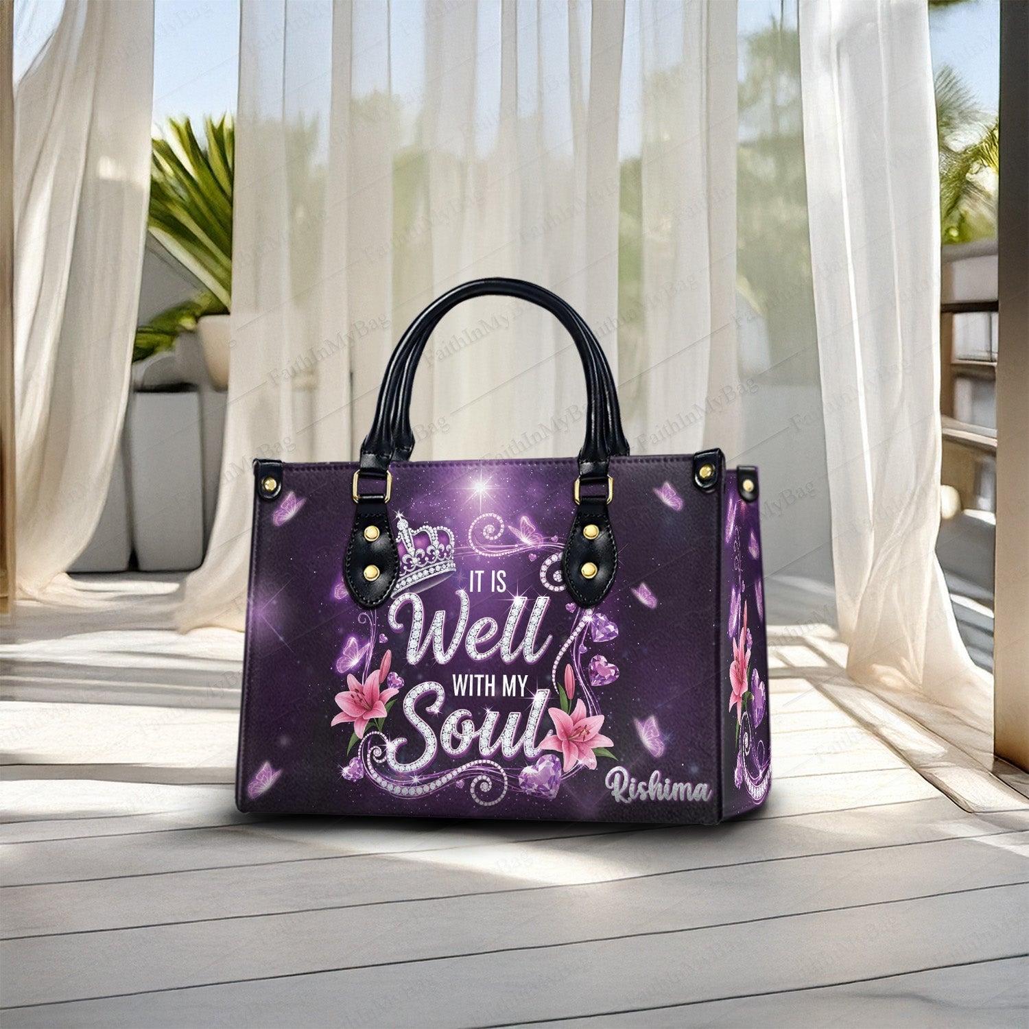 HB107 -It Is Well With My Soul, Christian Handbag, Custom Name, Faith Inspired Leather Purse, Crown and Floral Design