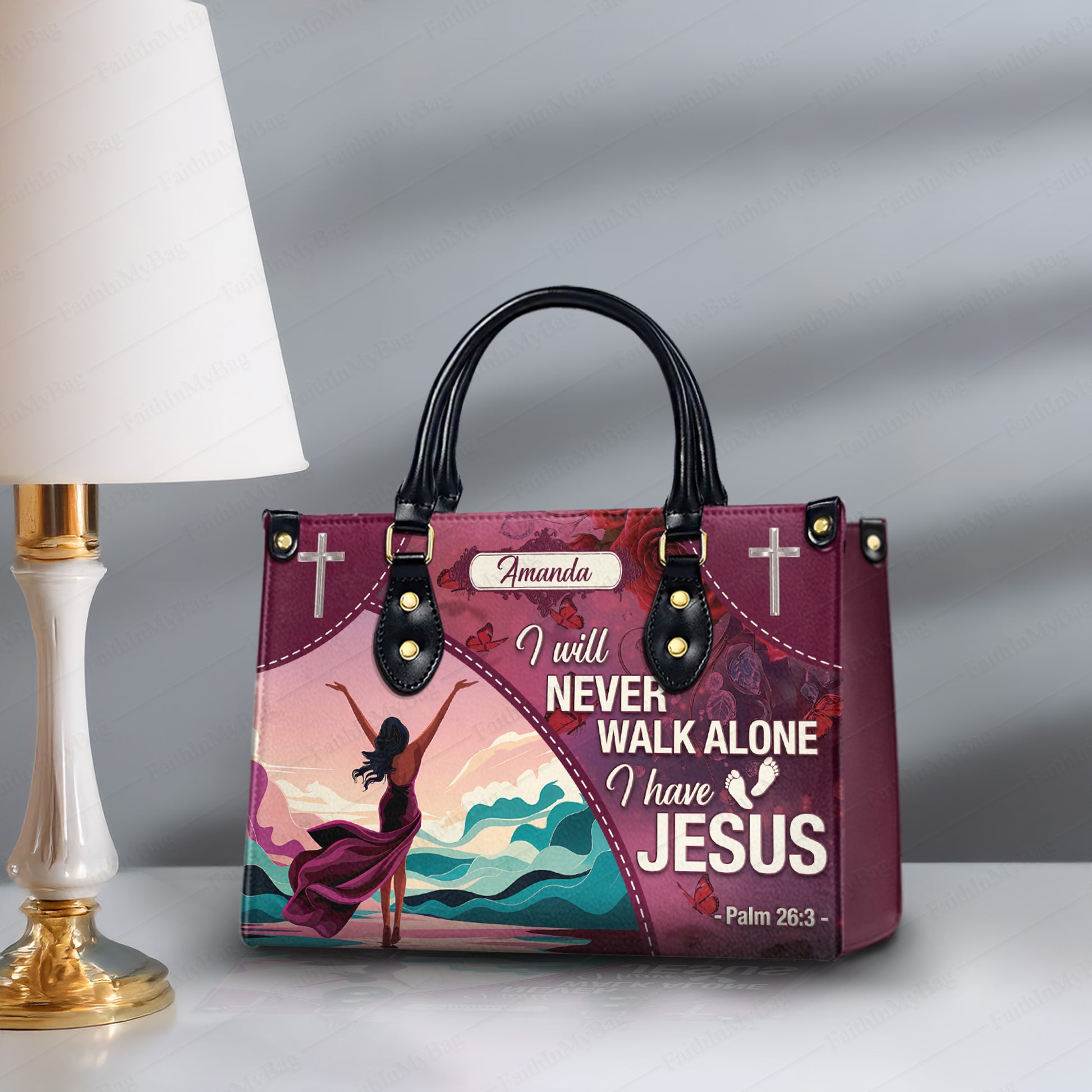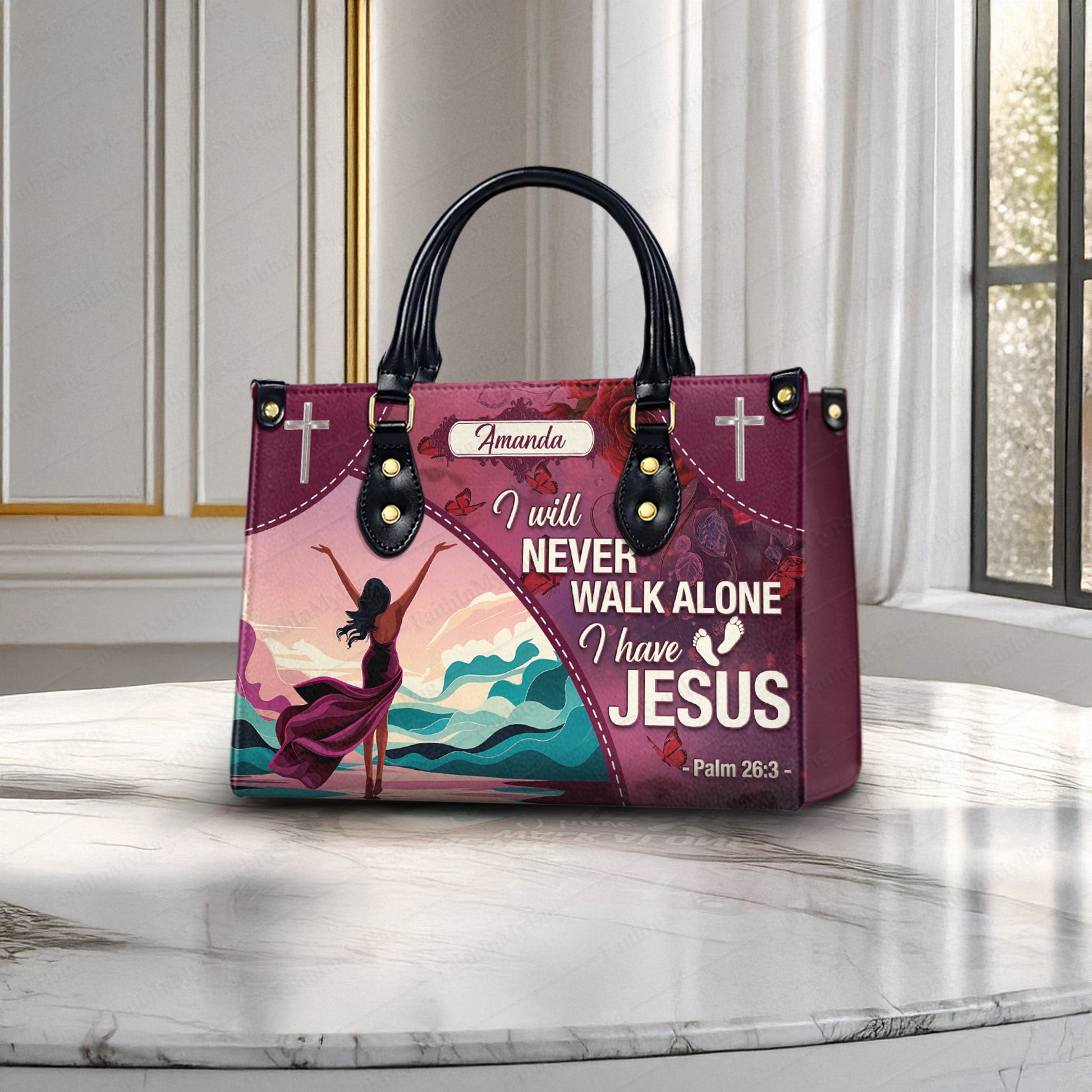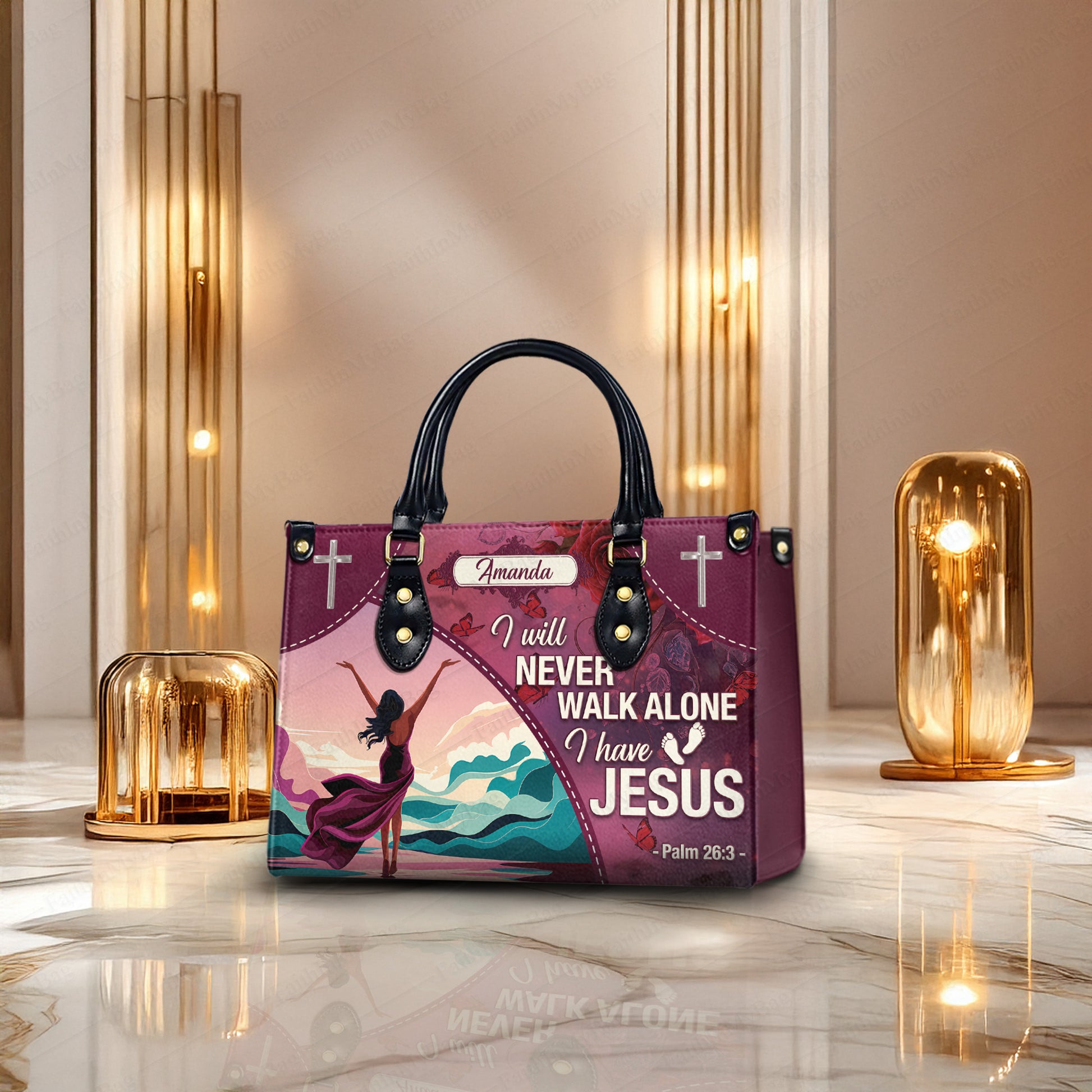 HB131 - Custom Name Christian Handbag – I Will Never Walk Alone I Have Jesus – Bible Verse Purse Psalm 26:3 Faith Gift for Women