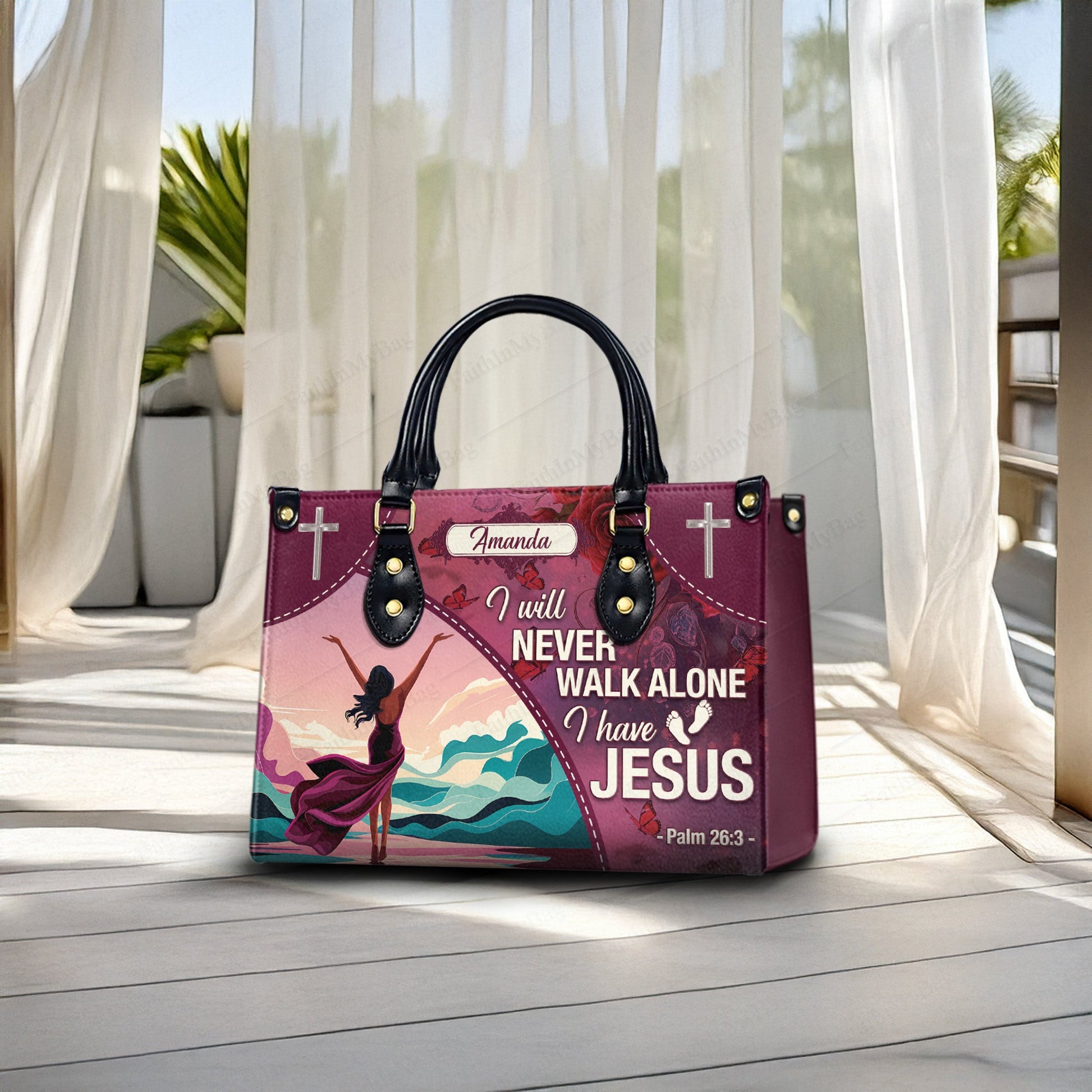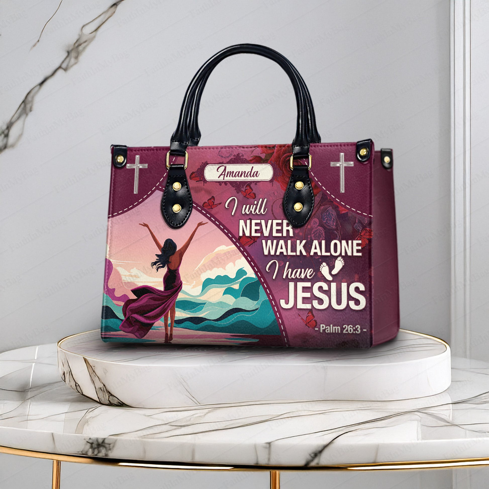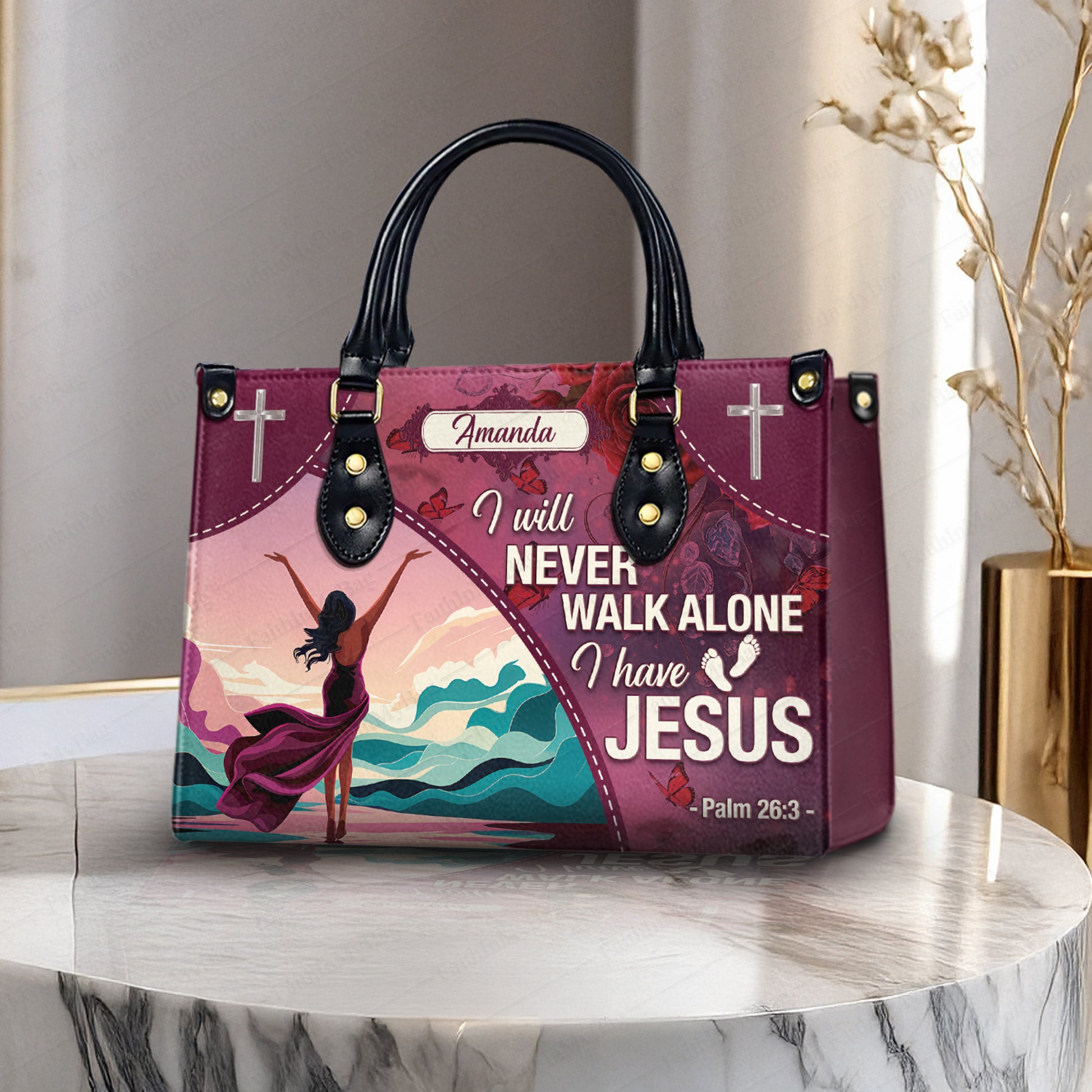HB131 - Custom Name Christian Handbag – I Will Never Walk Alone I Have Jesus – Bible Verse Purse Psalm 26:3 Faith Gift for Women