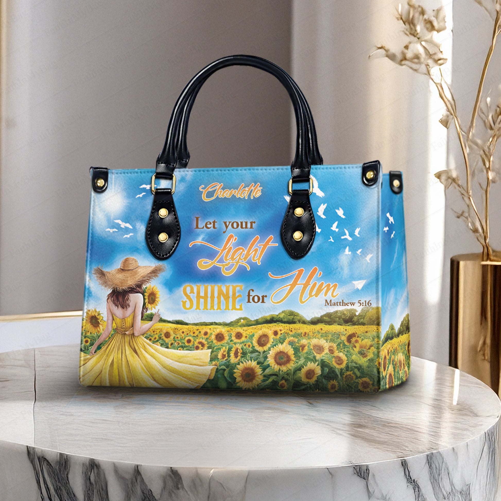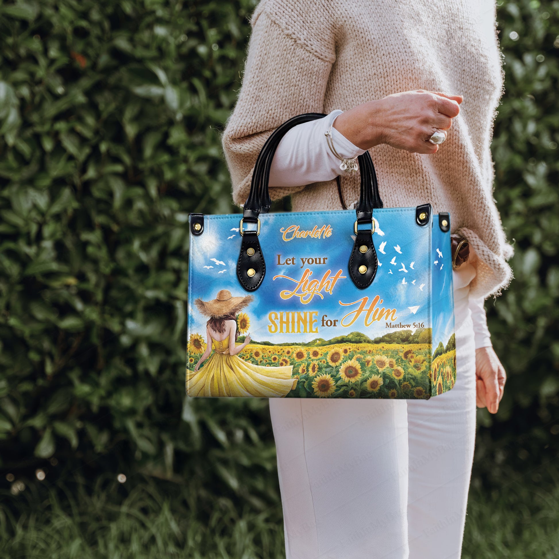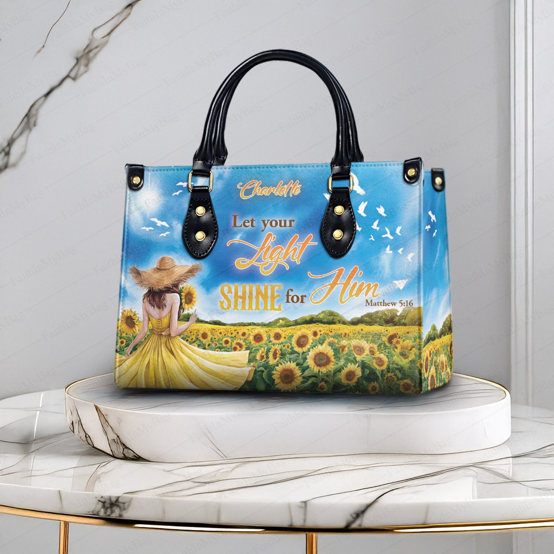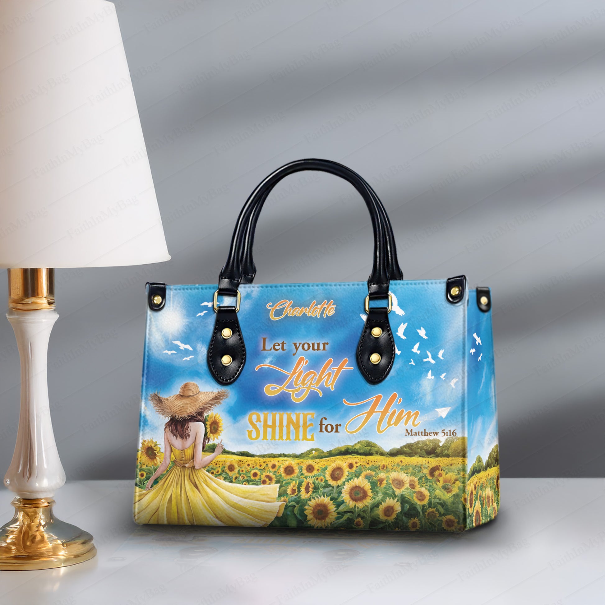 HB138 - Custom Name Christian Handbag – Let Your Light Shine For Him Purse – Matthew 5:16 Bible Verse Bag – Faith Inspired Gift for Women
