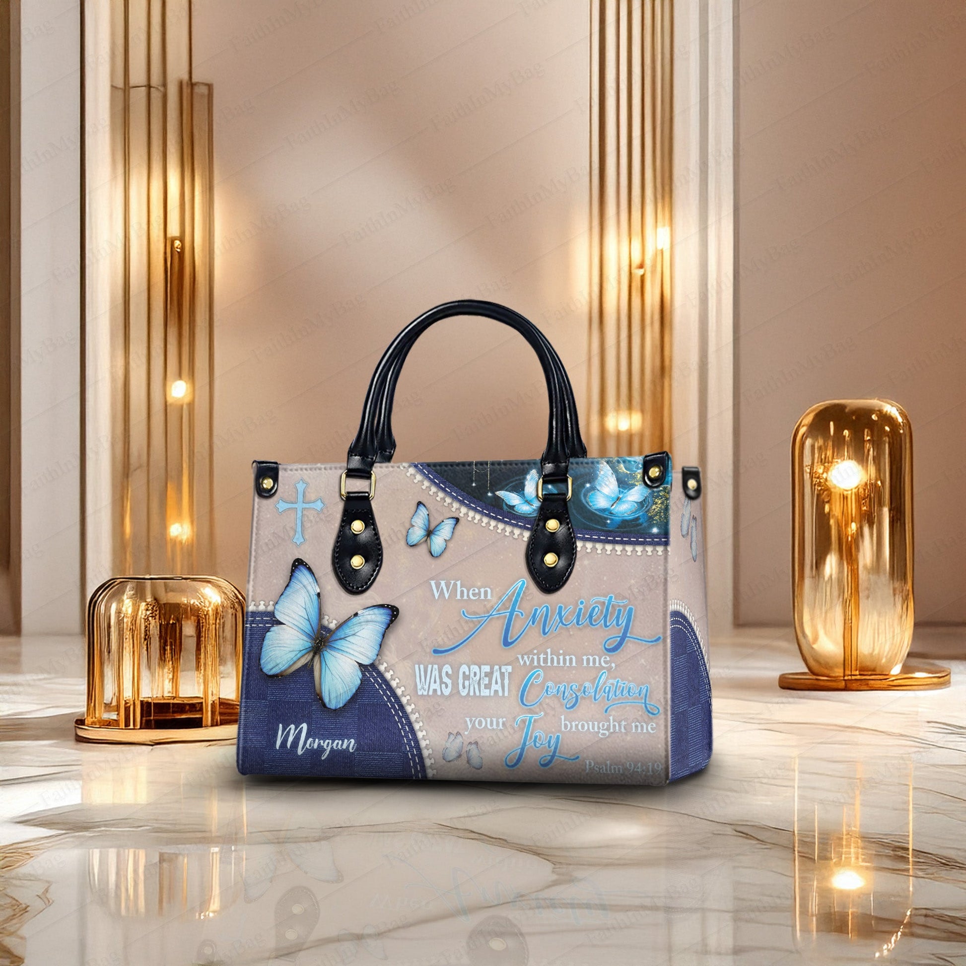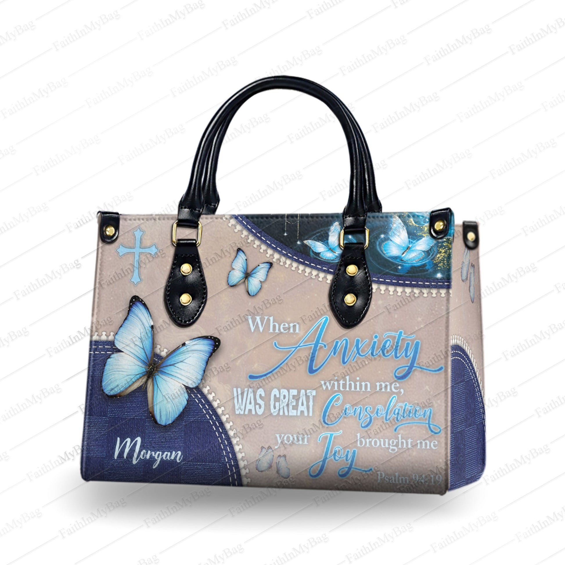 HB128 - Personalized Christian Handbag β Psalm 94:19 Bible Verse Butterfly Purse, Custom Name Faith Bag for Women, Scripture Gift Idea
