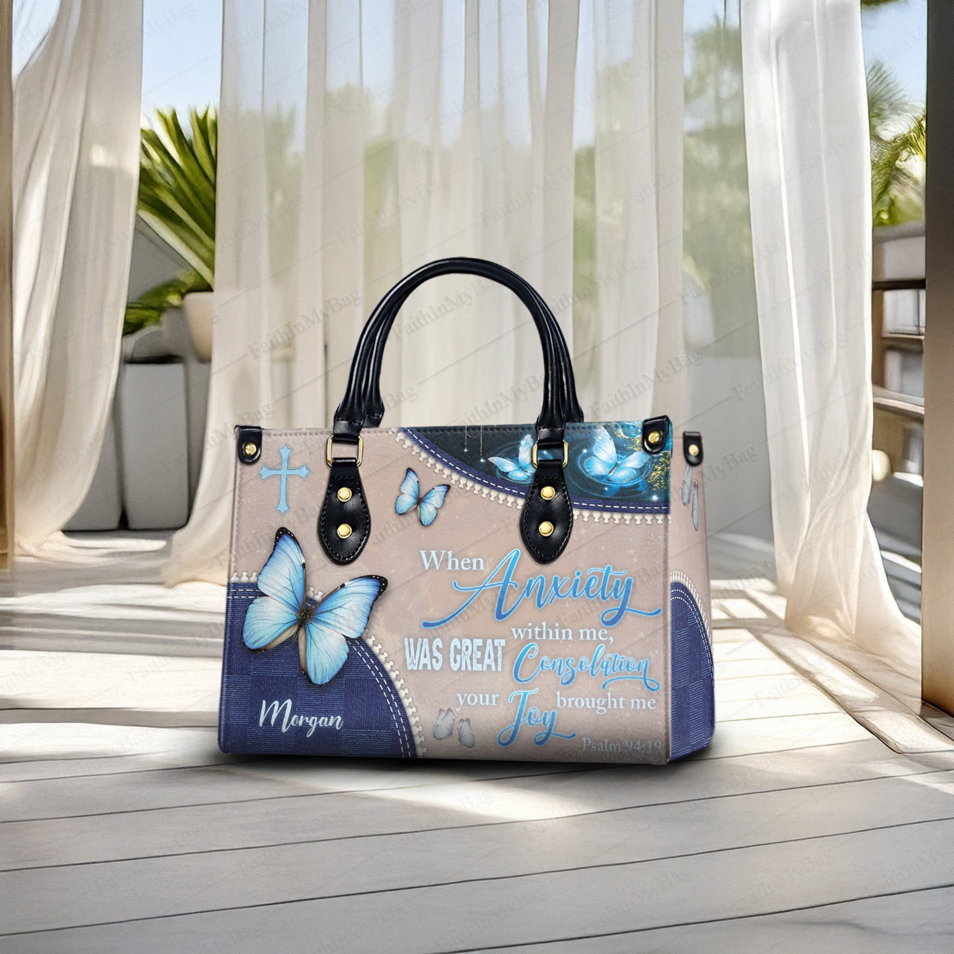 HB128 - Personalized Christian Handbag – Psalm 94:19 Bible Verse Butterfly Purse, Custom Name Faith Bag for Women, Scripture Gift Idea