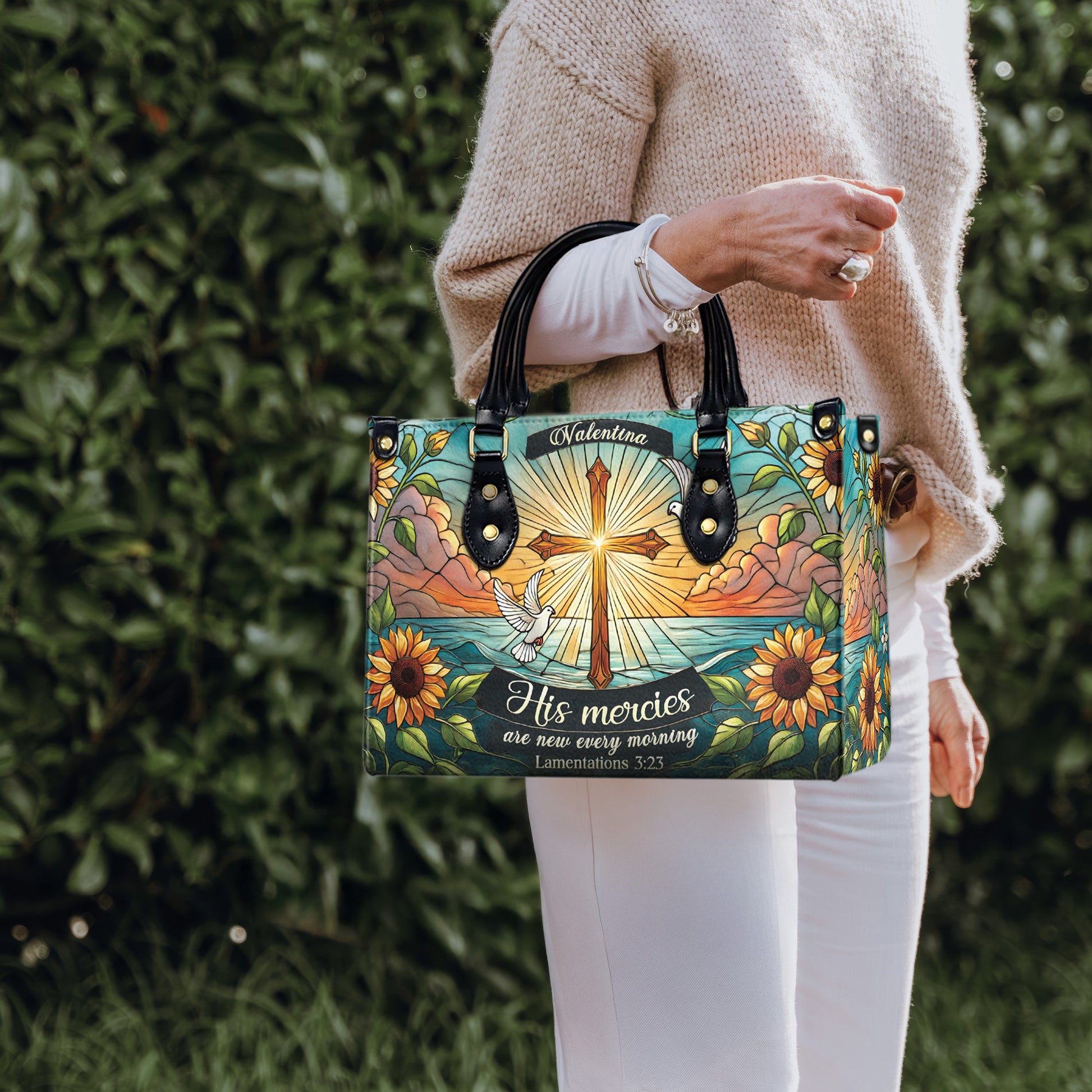 HB05-Personalized Christian Leather Handbag – His Mercies Are New Every Morning, Cross & Dove PU Leather Purse, Faith-Based Gift for Women