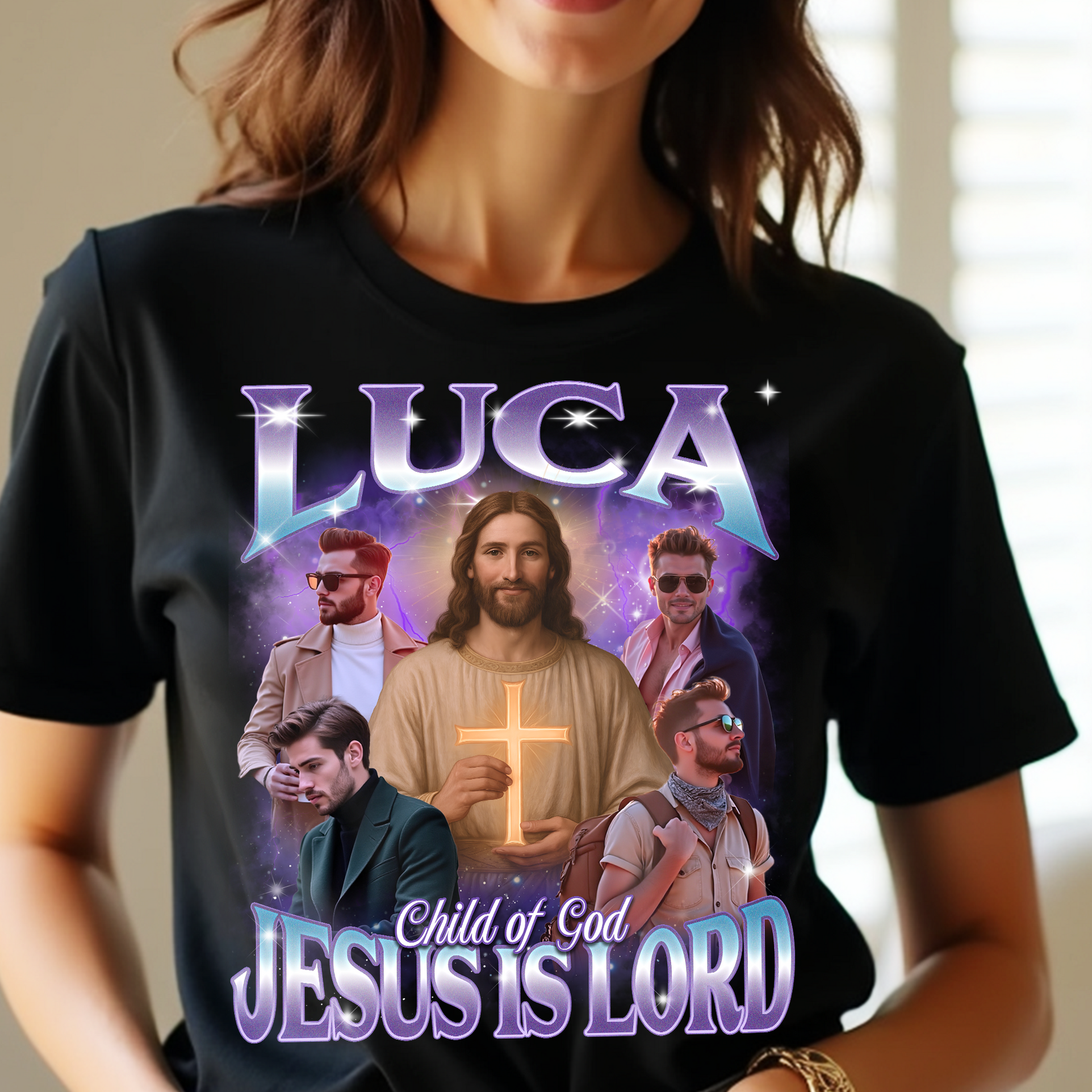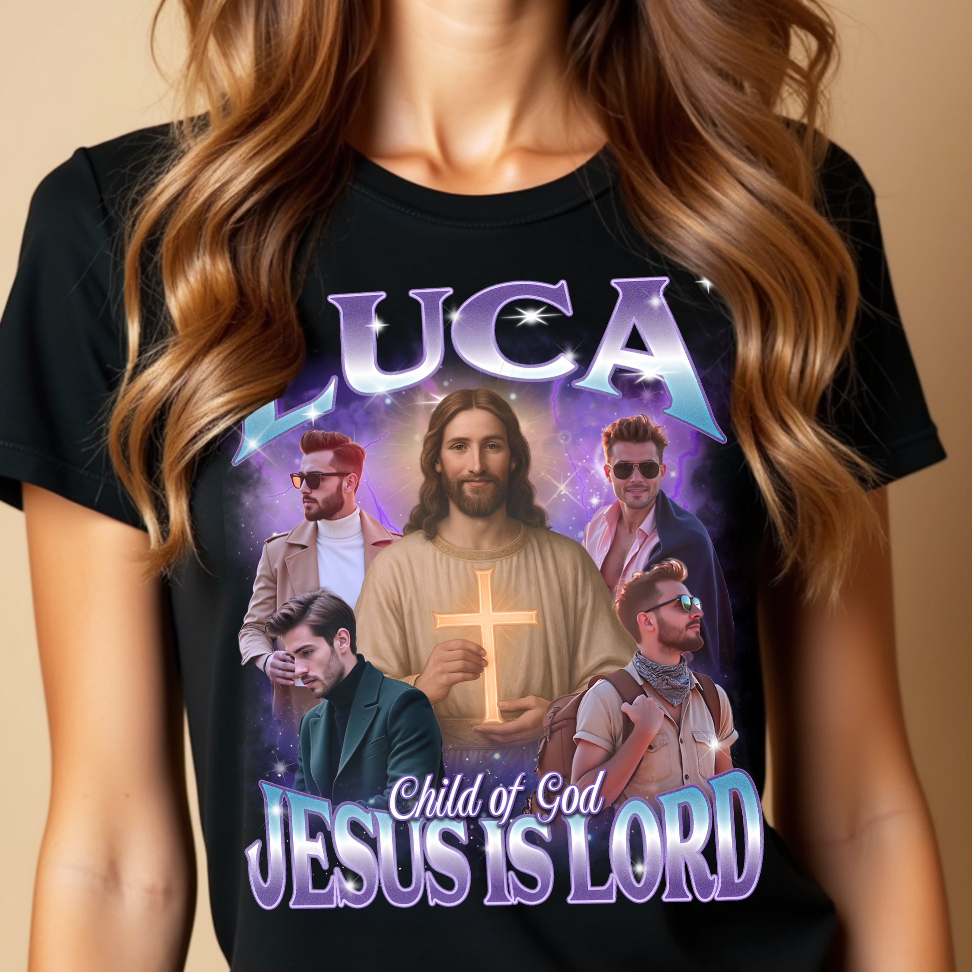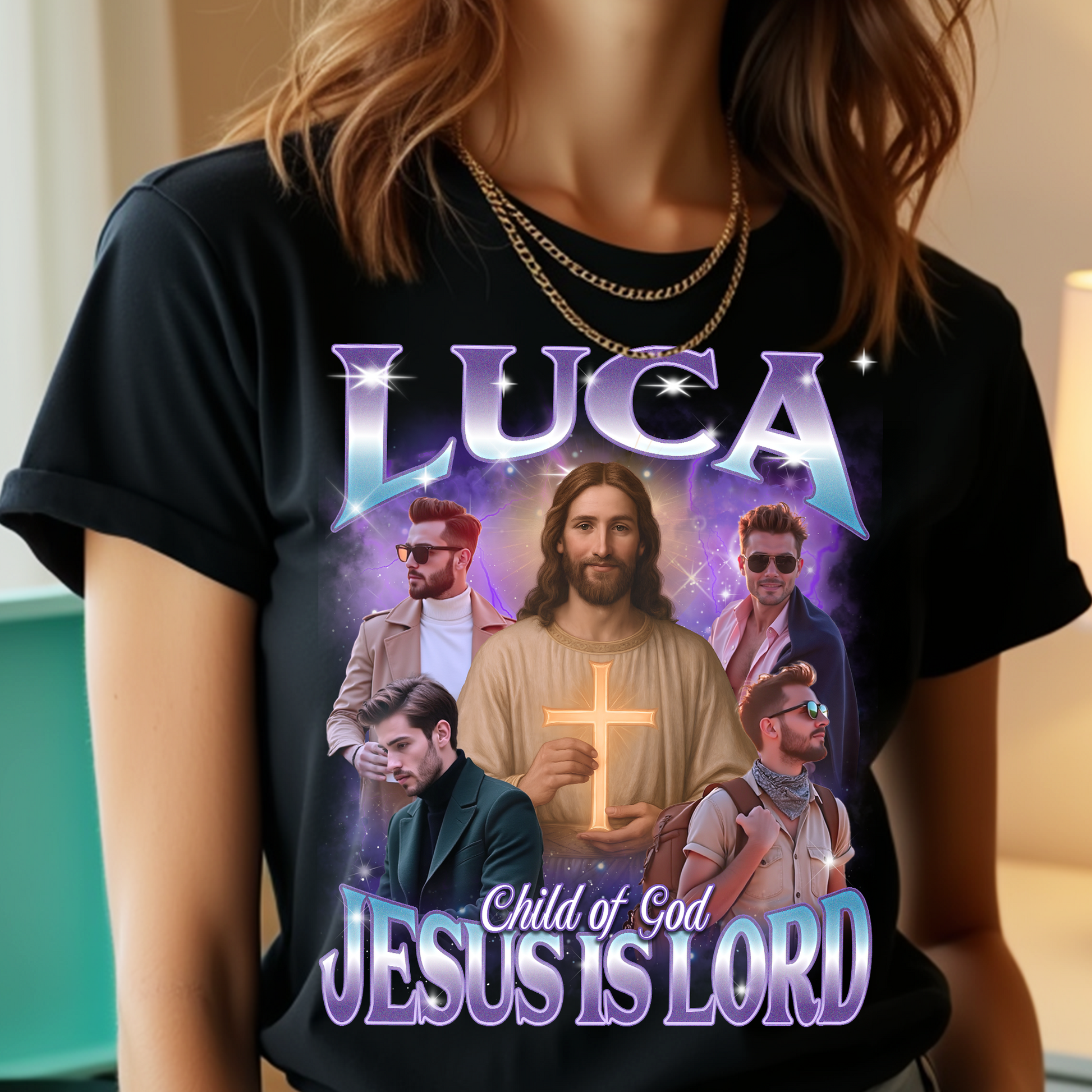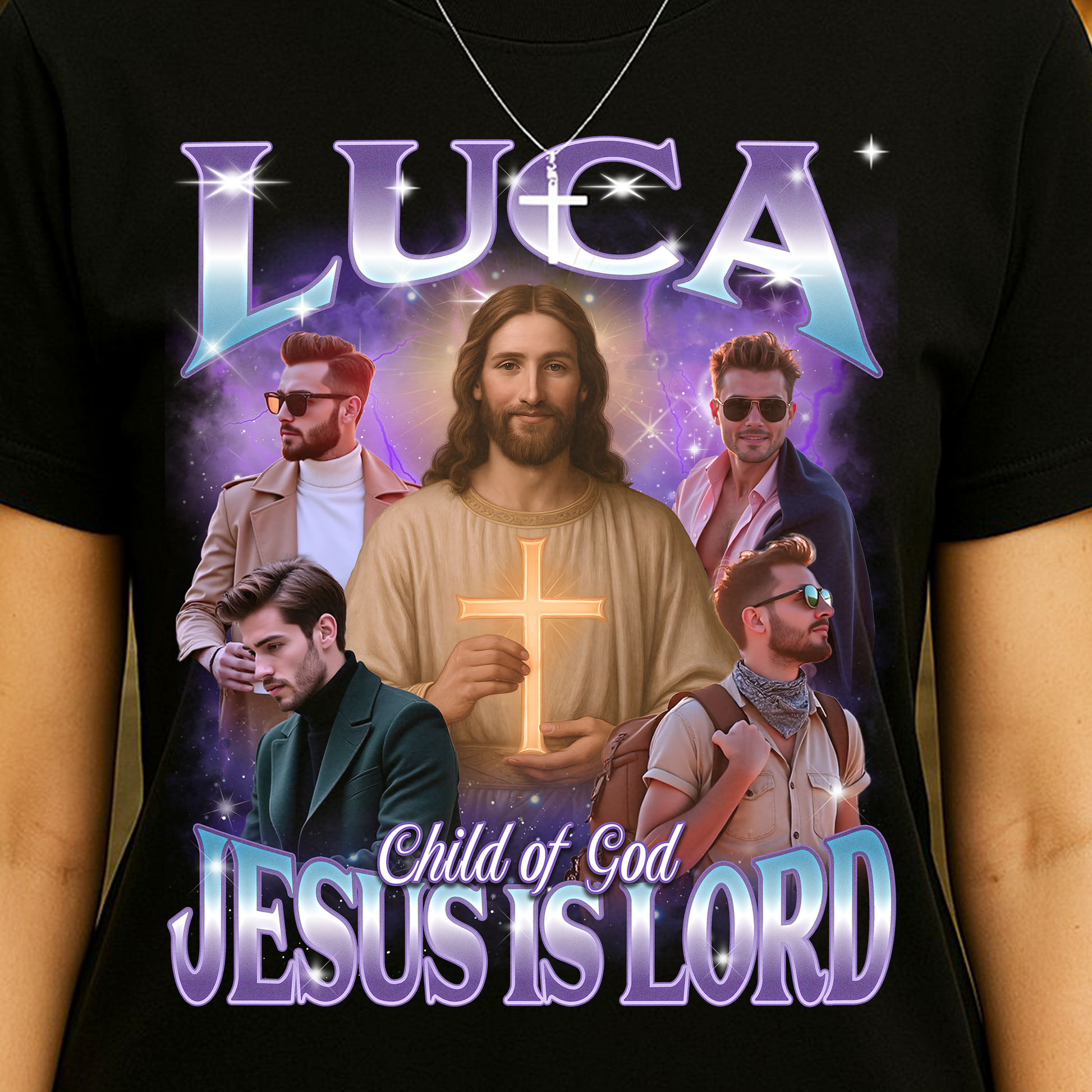 Declare your faith loud and proud with our eye-catching “Jesus Is Lord” custom tee or sweater – a bold, stylish design that blends heavenly inspiration with personal identity. This unique shirt features a powerful image of Jesus holding the cross, surrounded by glowing light and a modern faith-filled vibe. Add your name or the name of a loved one to create a one-of-a-kind garment that speaks from the soul.