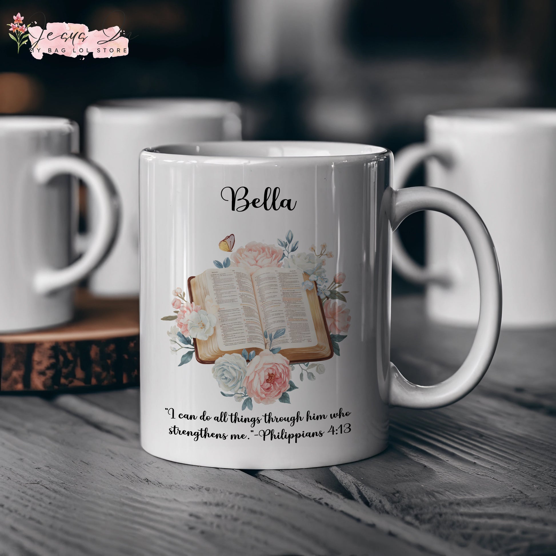 Personalized Bible Verse Mug for Her – Philippians 4:13 Christian Gift, Floral Scripture Coffee Cup, Faith Mug for Women