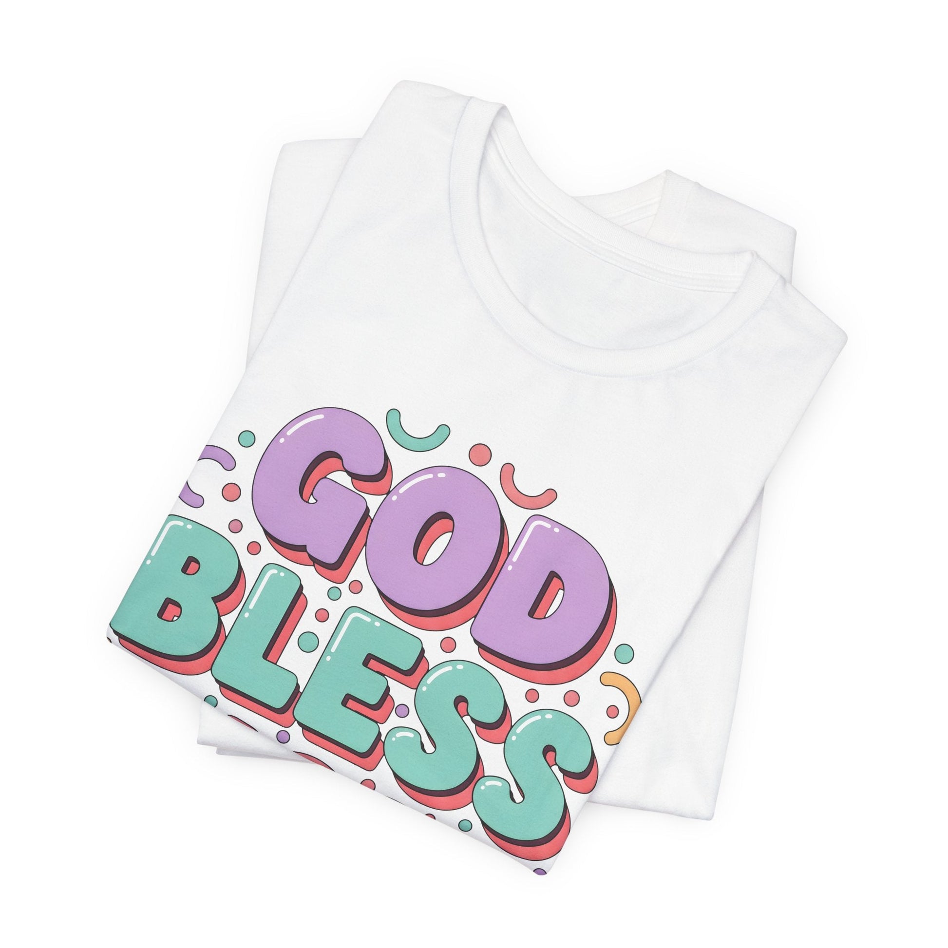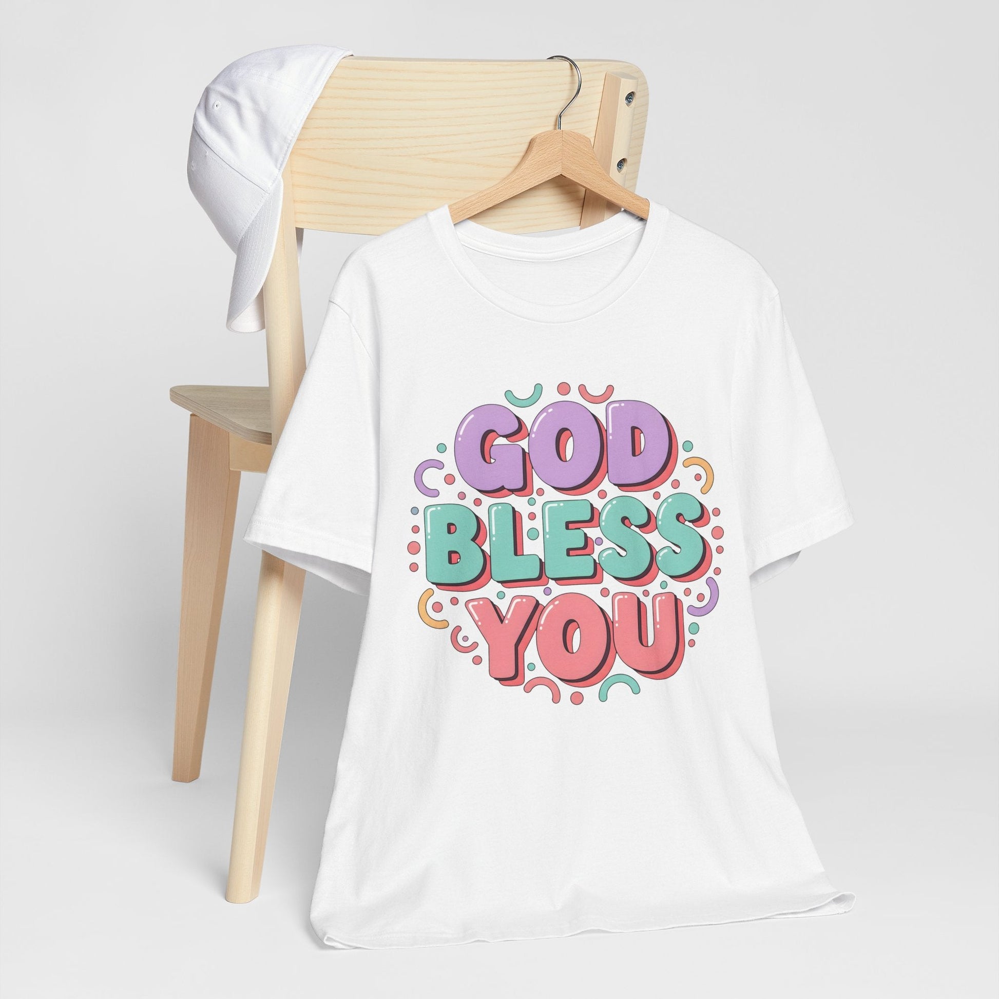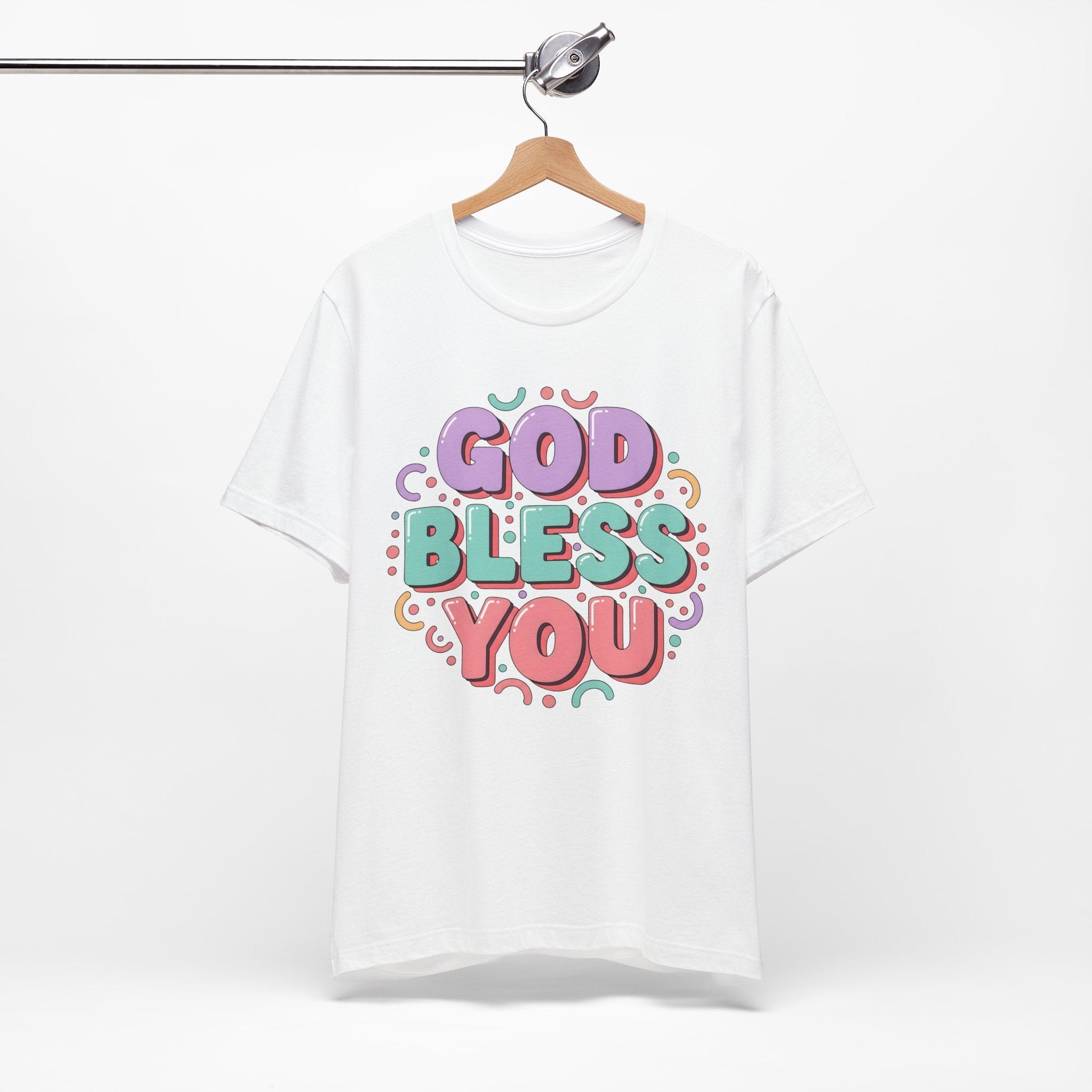 Shine with joy and encouragement in this cheerful “God Bless You” t-shirt! Featuring playful, colorful letters and a vibrant confetti-style design, this shirt is a sweet reminder of God's blessings — perfect for gifting, wearing to church, or brightening someone’s day with your faith and smile.