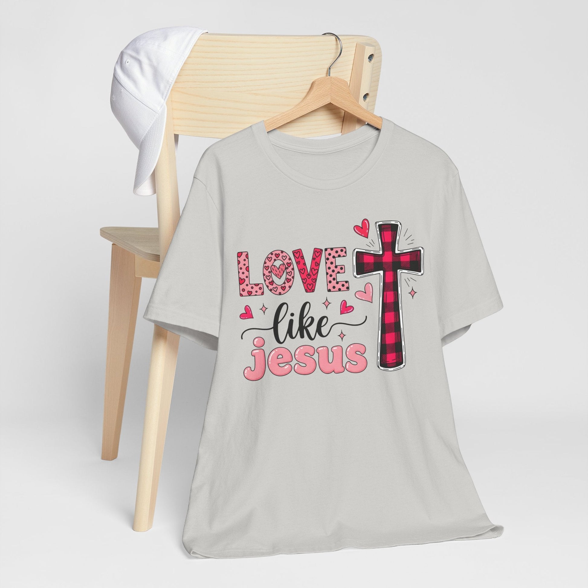 Let your heart shine with our “Love Like Jesus” T-shirt – a vibrant declaration of Christian love and kindness. Featuring adorable fonts, a cross design with playful patterns, and heart accents, this shirt is a reminder to lead with compassion and grace, just like Jesus did. Whether you're at church, out with friends, or relaxing at home, this tee is a beautiful way to wear your faith boldly.