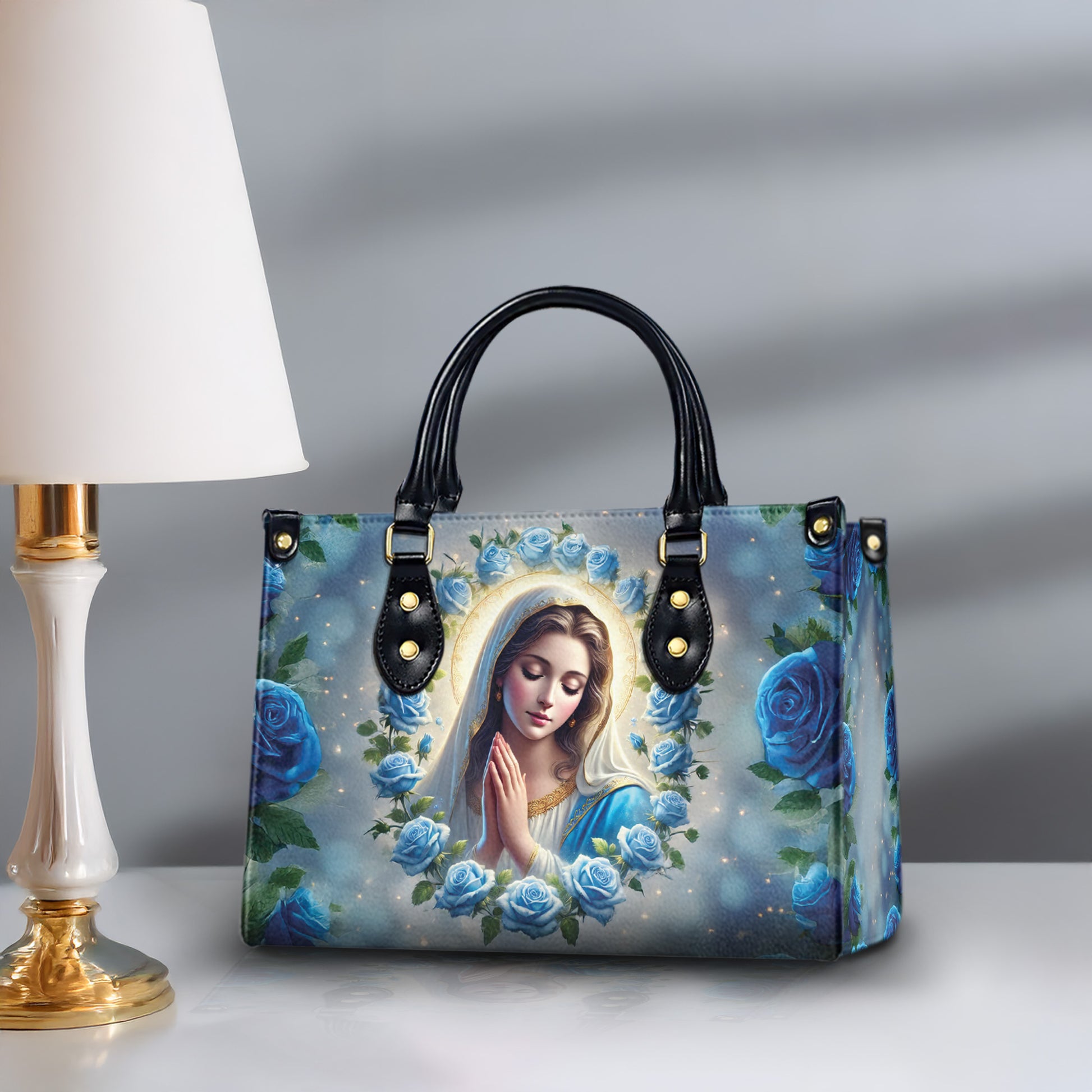 Celebrate your faith in style with this beautifully designed Virgin Mary Handbag. Featuring a serene portrait of Our Lady surrounded by delicate blue roses, this handbag is more than just a fashion accessory β it's a daily reminder of love, hope, and grace.