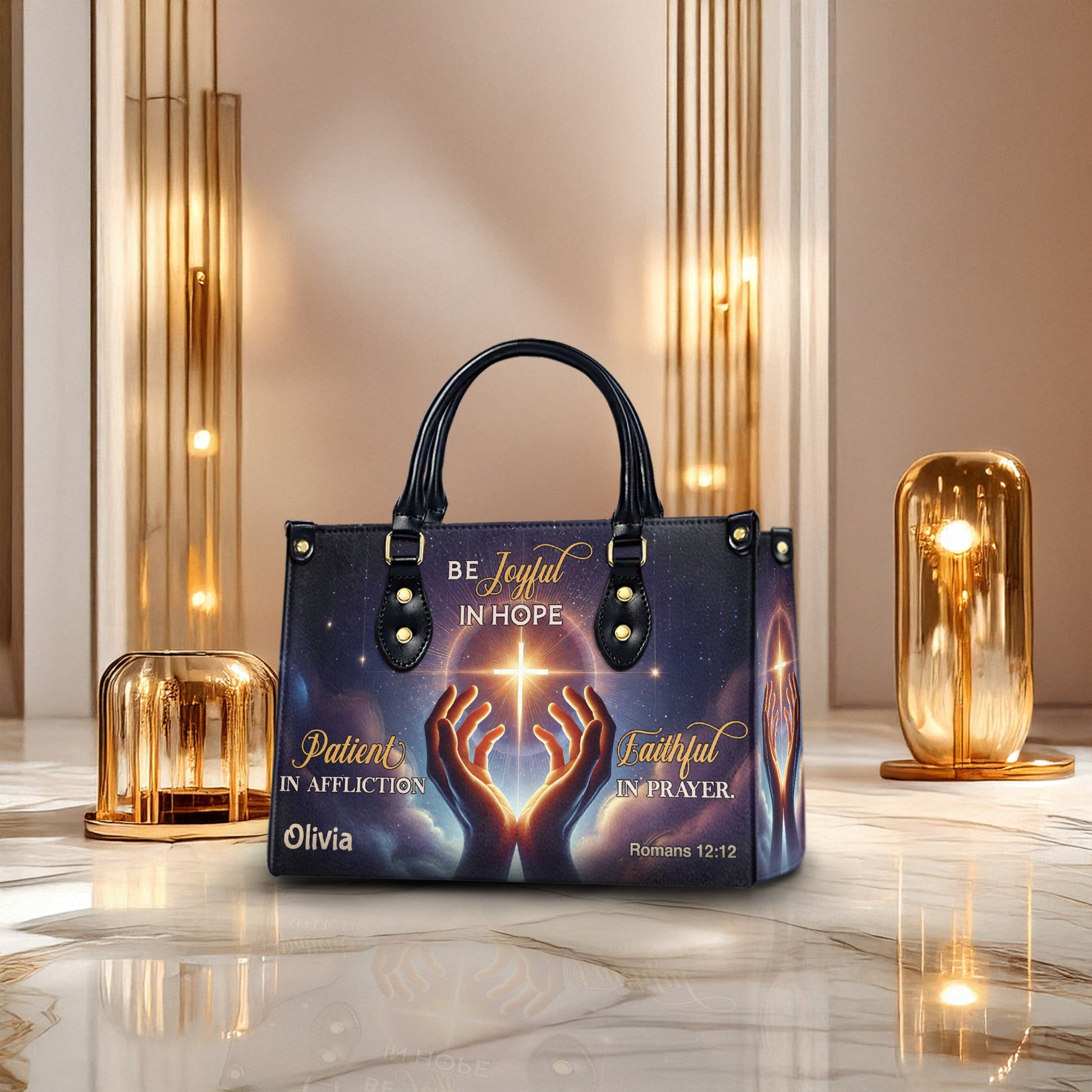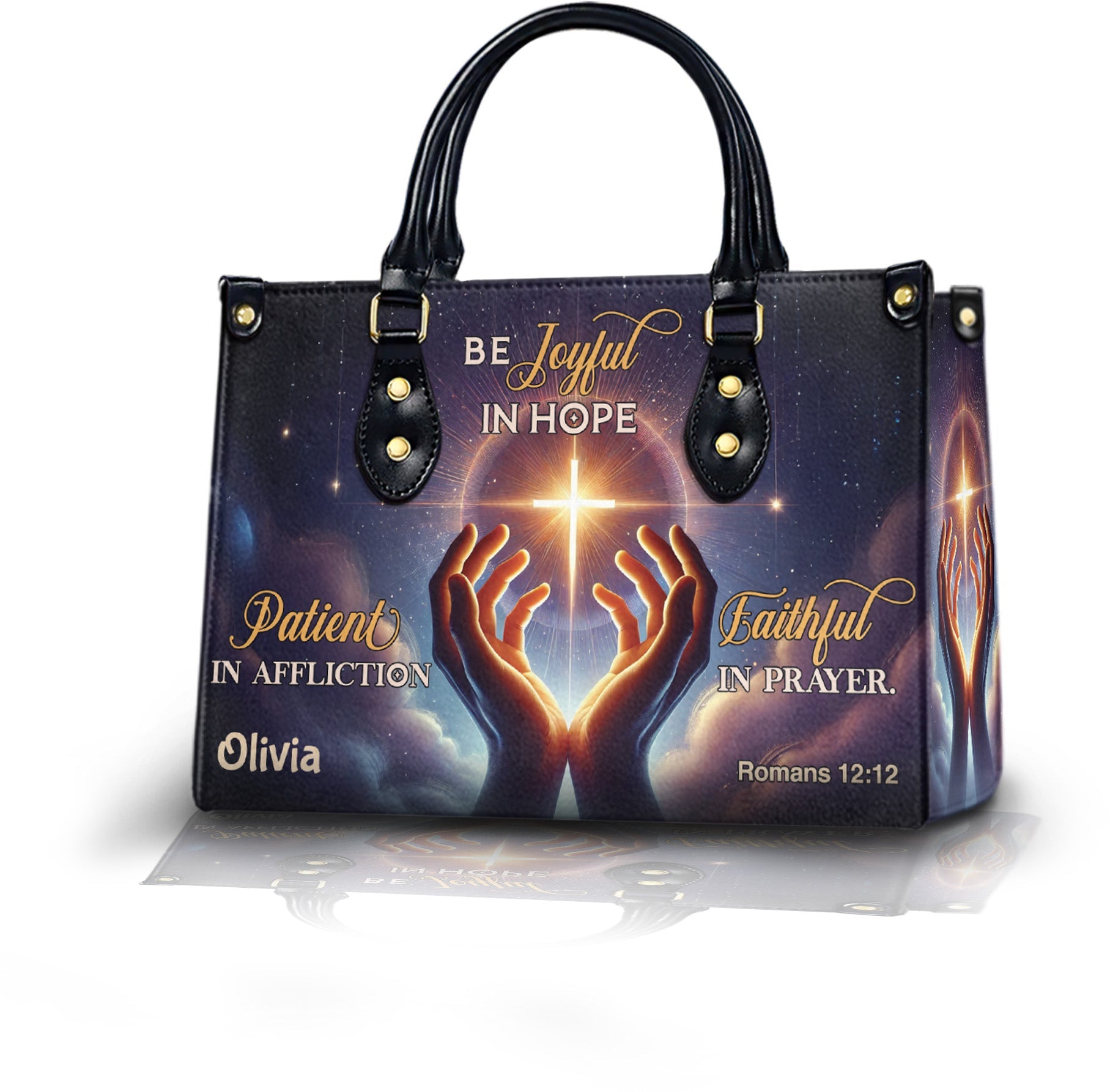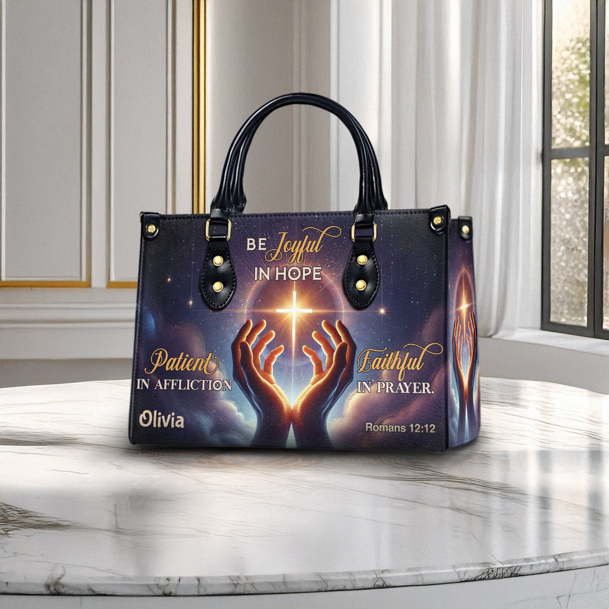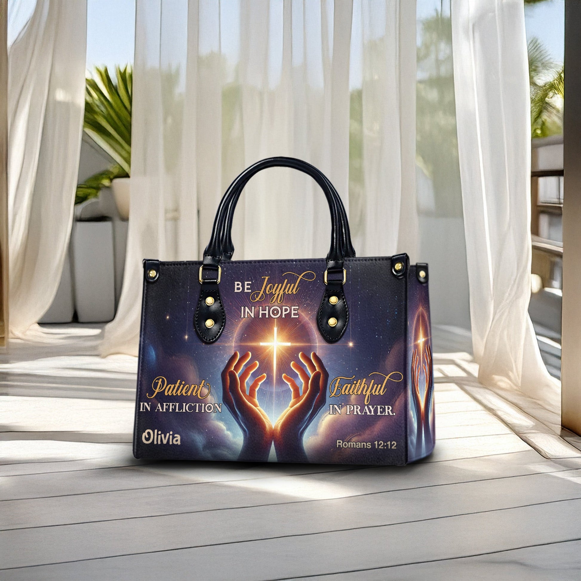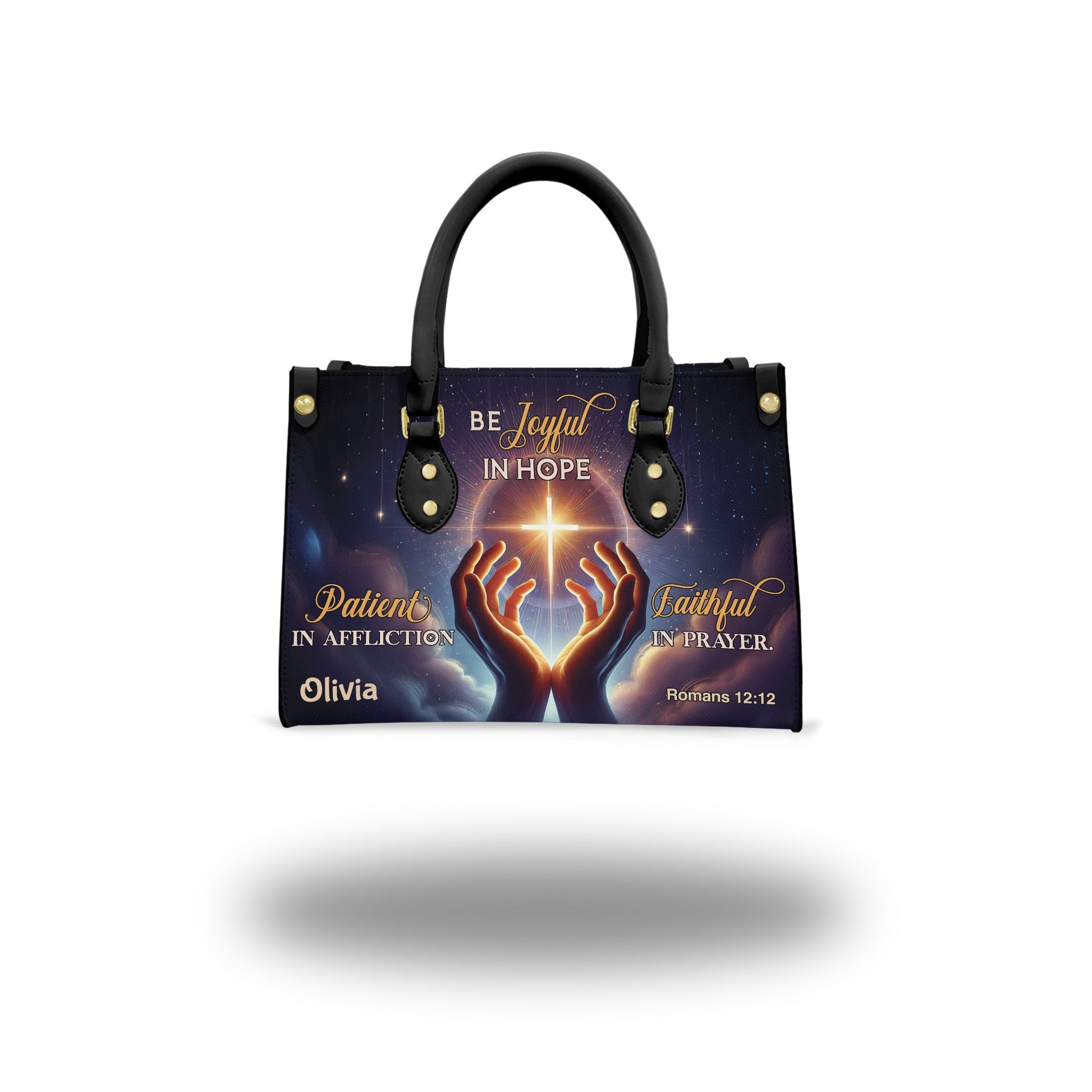 Carry this powerful message of resilience and faith with you each day. This beautifully designed handbag features glowing artwork of praying hands, a radiant cross, and the encouraging scripture from Romans 12:12. Personalize it with your name to make it a unique expression of your spiritual journey.