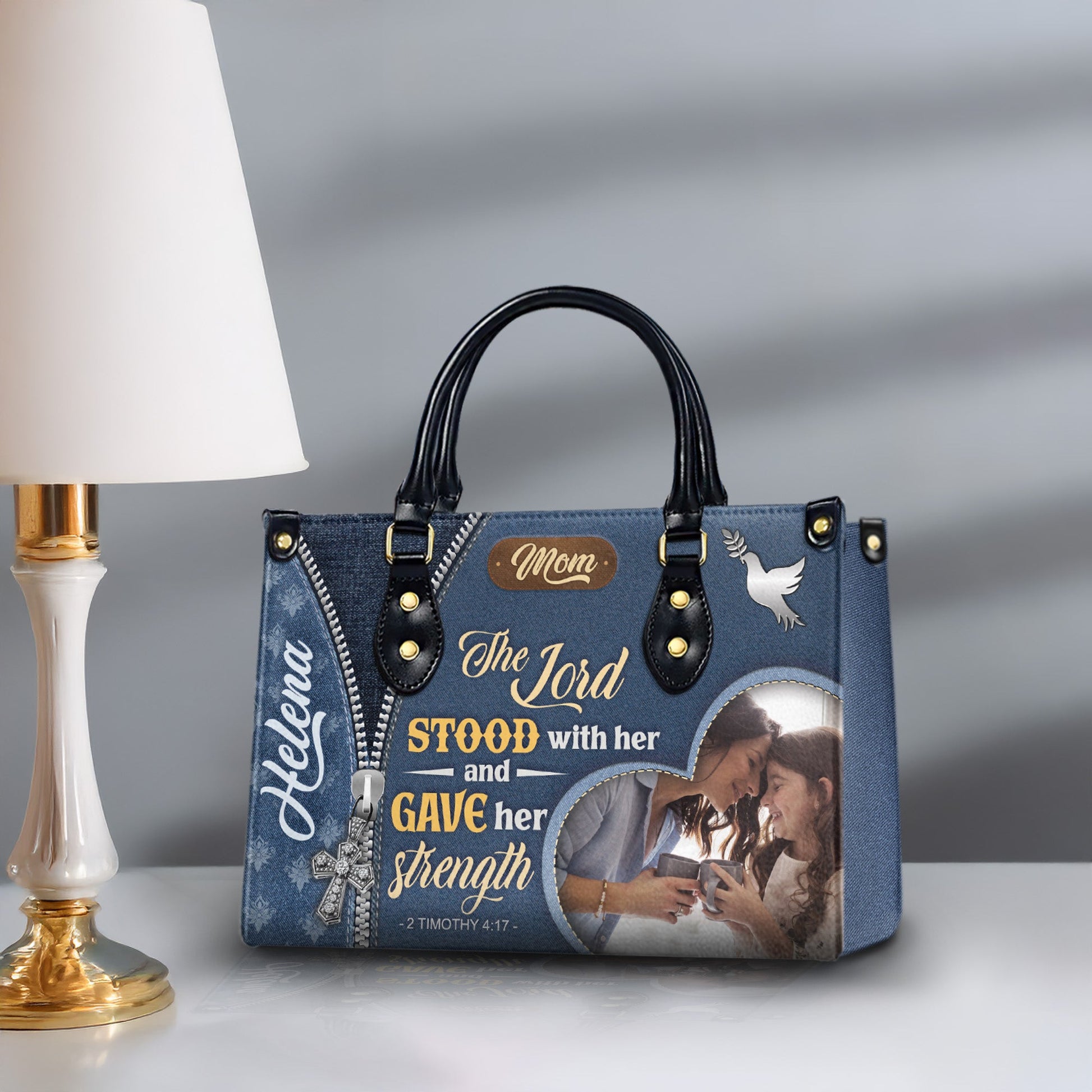 Celebrate a mother’s strength and faith with this heartfelt custom Christian handbag, featuring the powerful Bible verse 2 Timothy 4:17: “The Lord stood with her and gave her strength.” With personalized touches like her name and a cherished photo, this faith-filled purse is more than just an accessory—it’s a daily reminder of God’s love and her unwavering spirit.