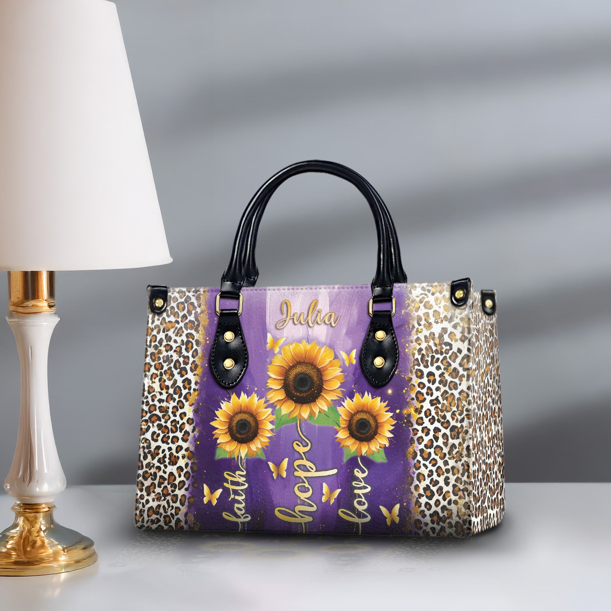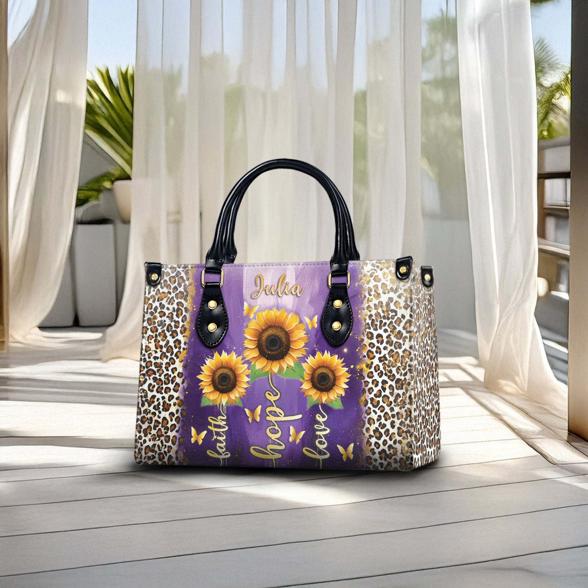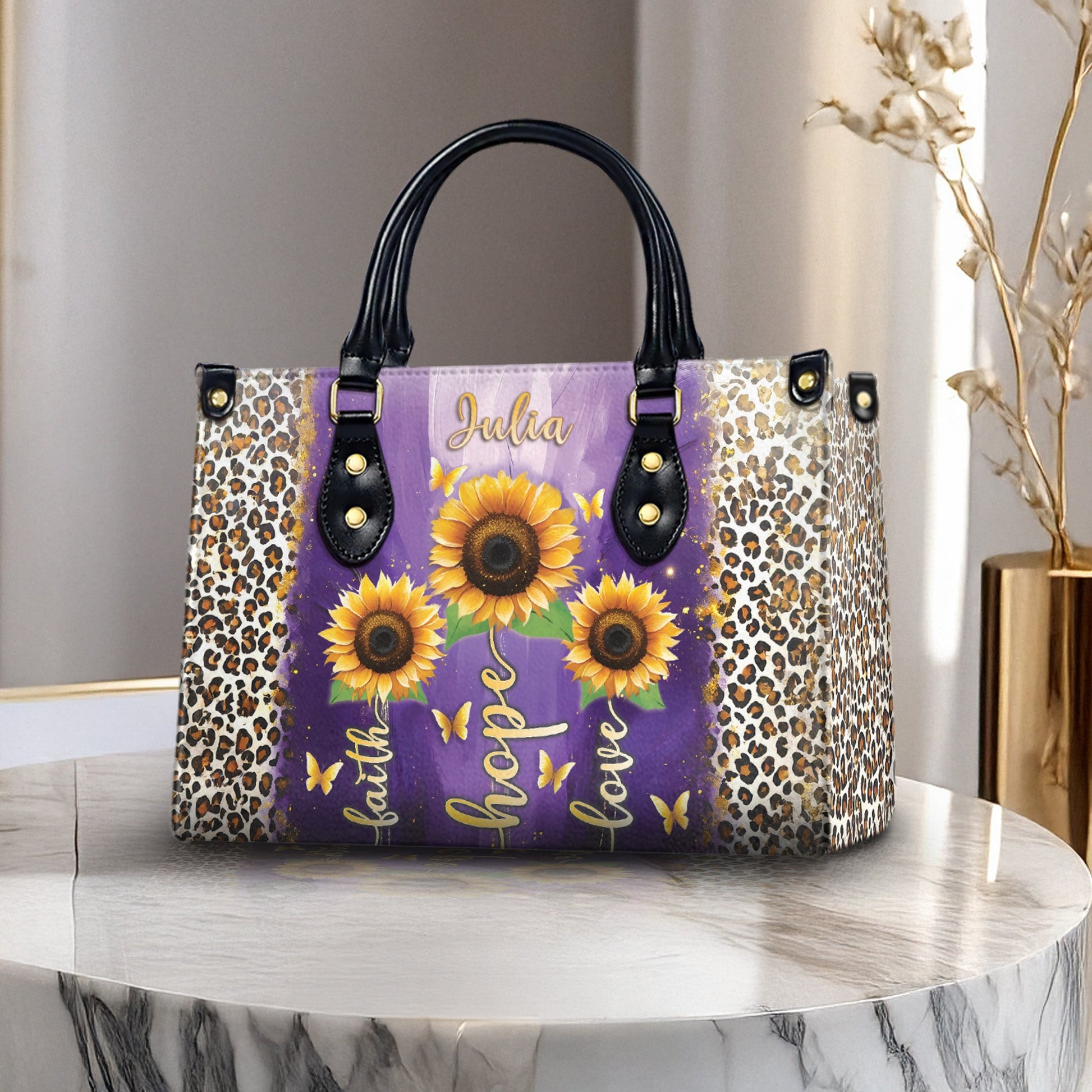 HB19-Personalized Christian Handbag – Faith Hope Love Tote – Purple Sunflower Leopard Purse – Inspirational Gift for Women