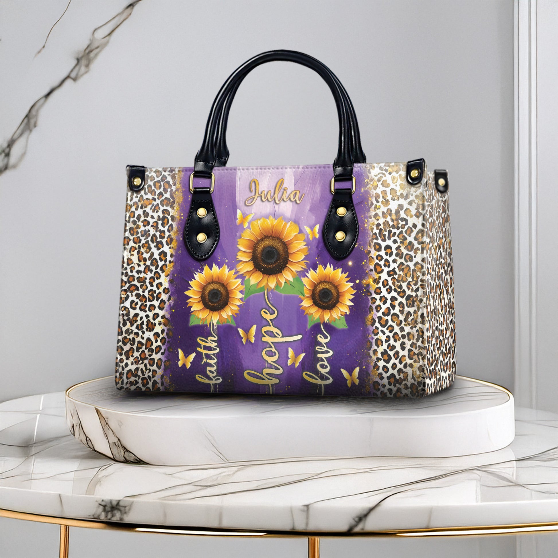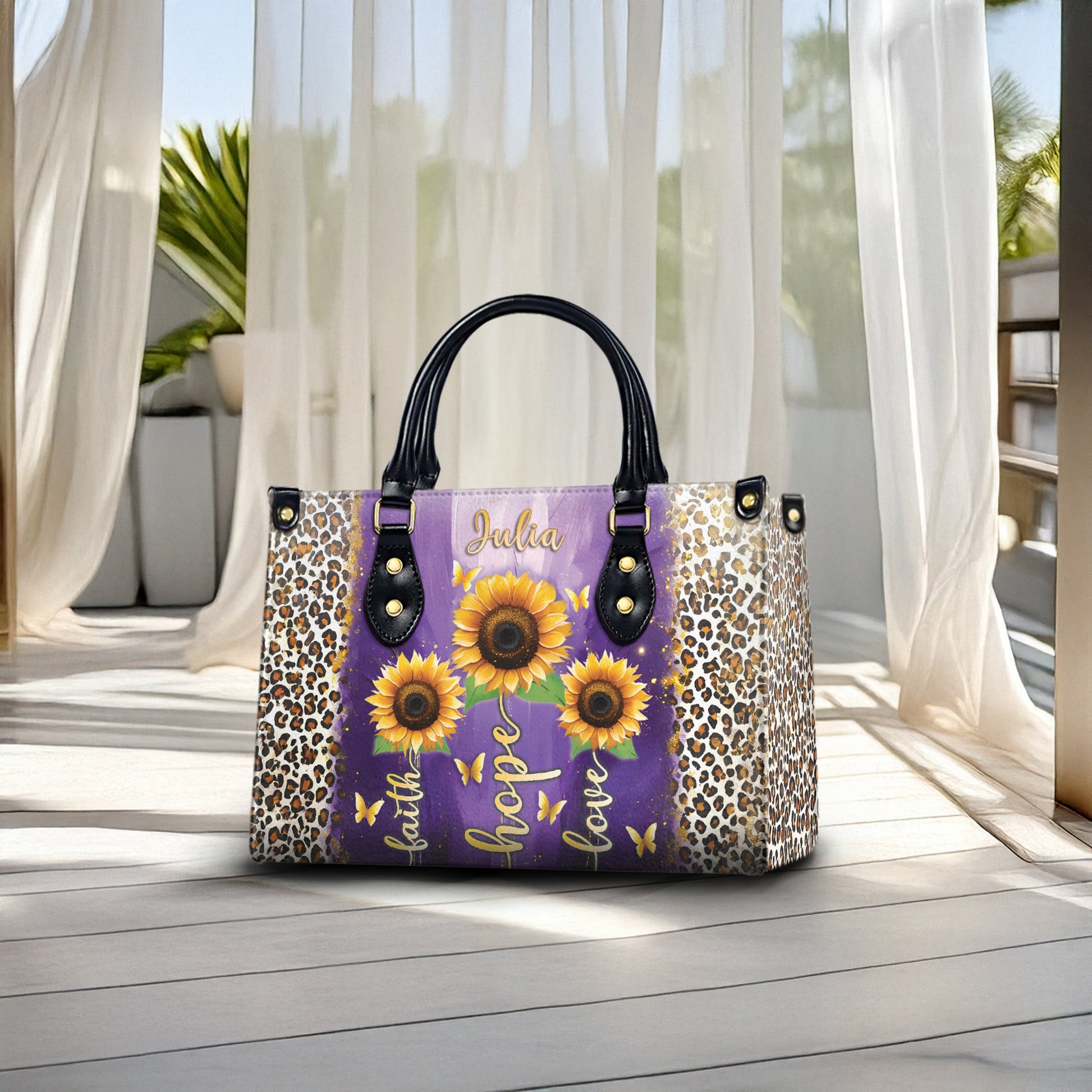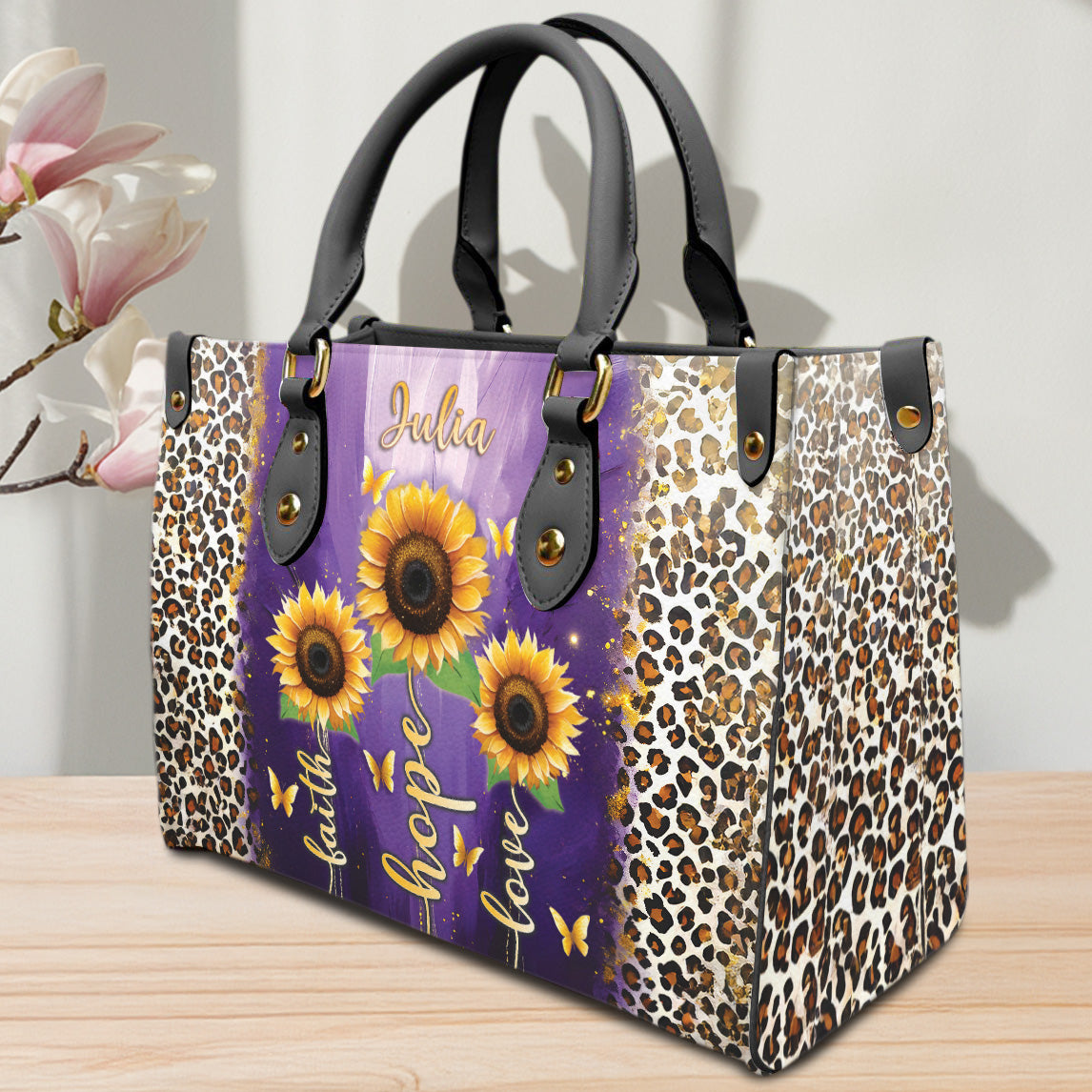 Express your style and your faith with this Personalized Christian Handbag, featuring stunning sunflower artwork, elegant leopard print accents, and the timeless message: Faith – Hope – Love. Add your name to make it truly yours — or gift it to someone special!