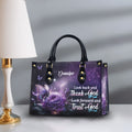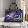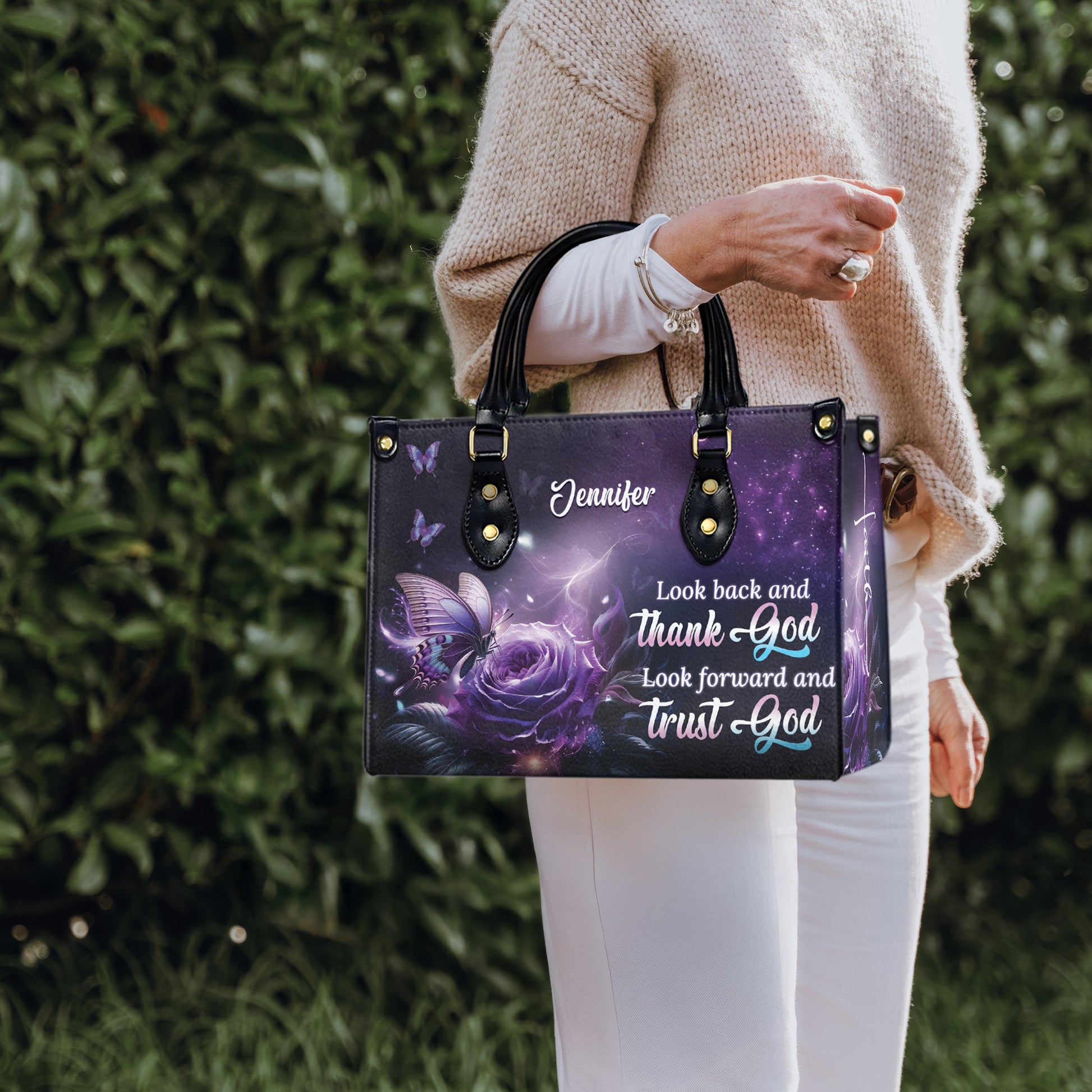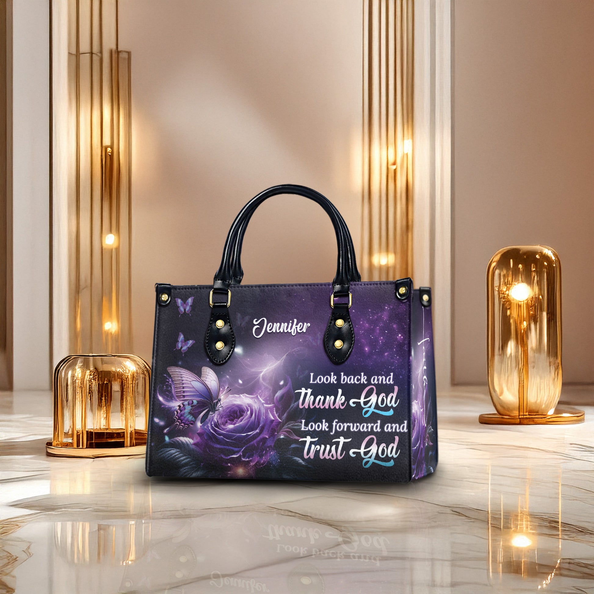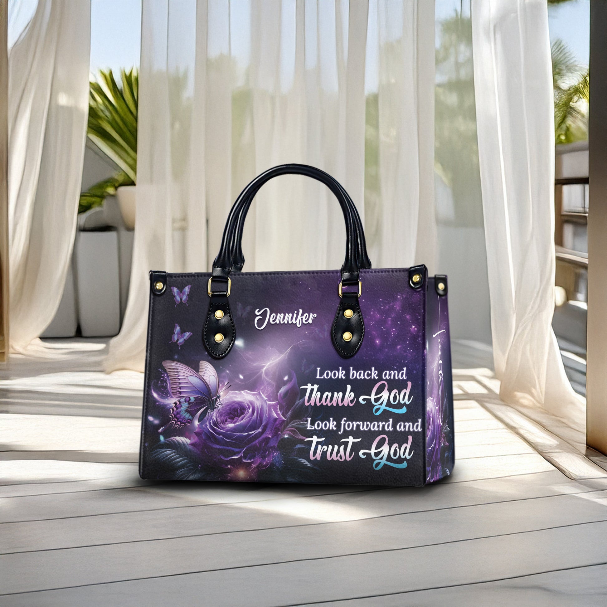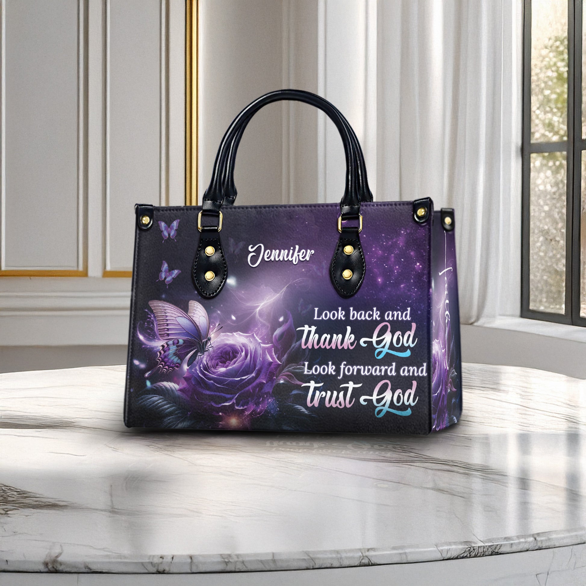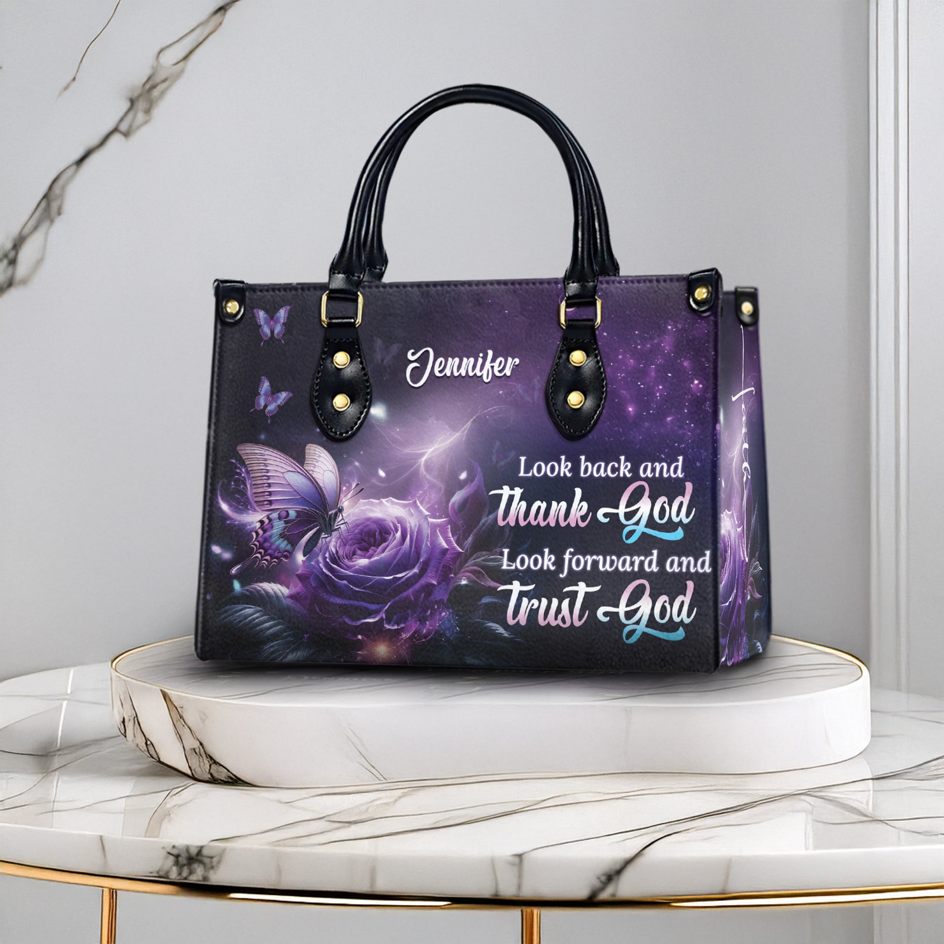 HB18-Personalized Christian Handbag - Thank God & Trust God Tote - Purple Butterfly Rose Purse - Faith Inspirational Gift for Women