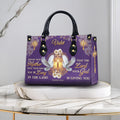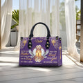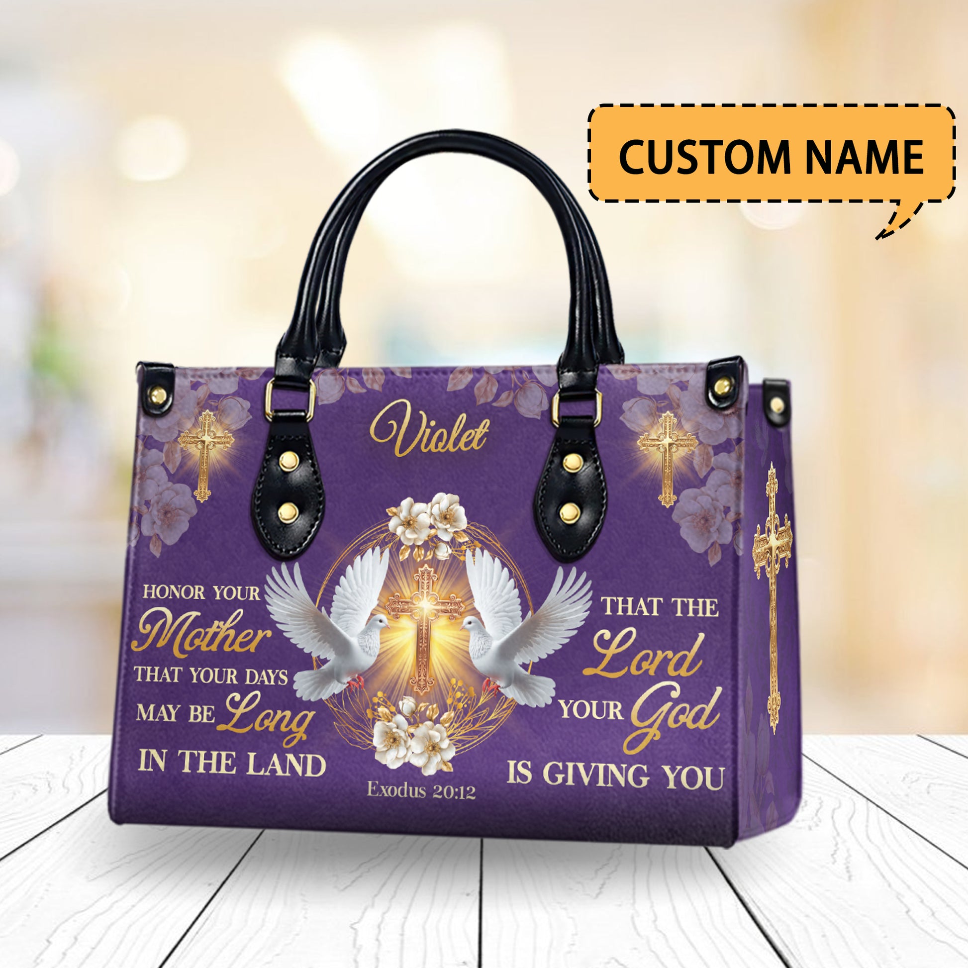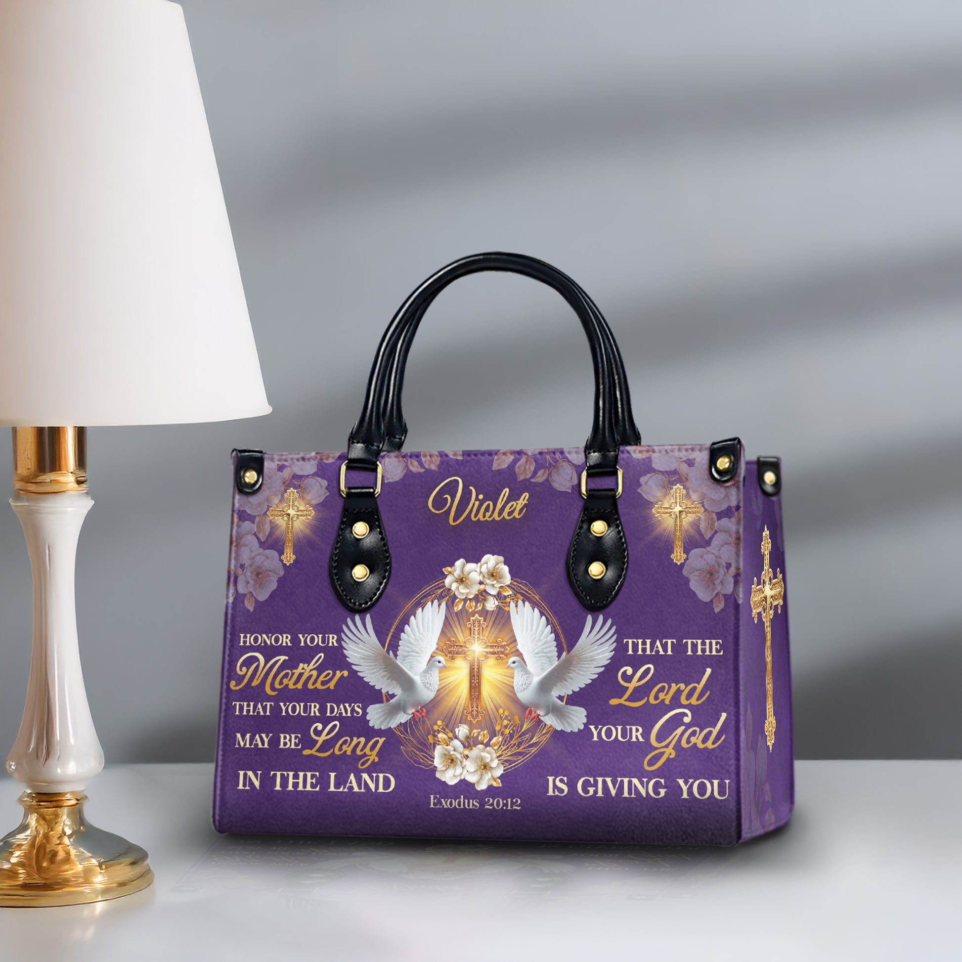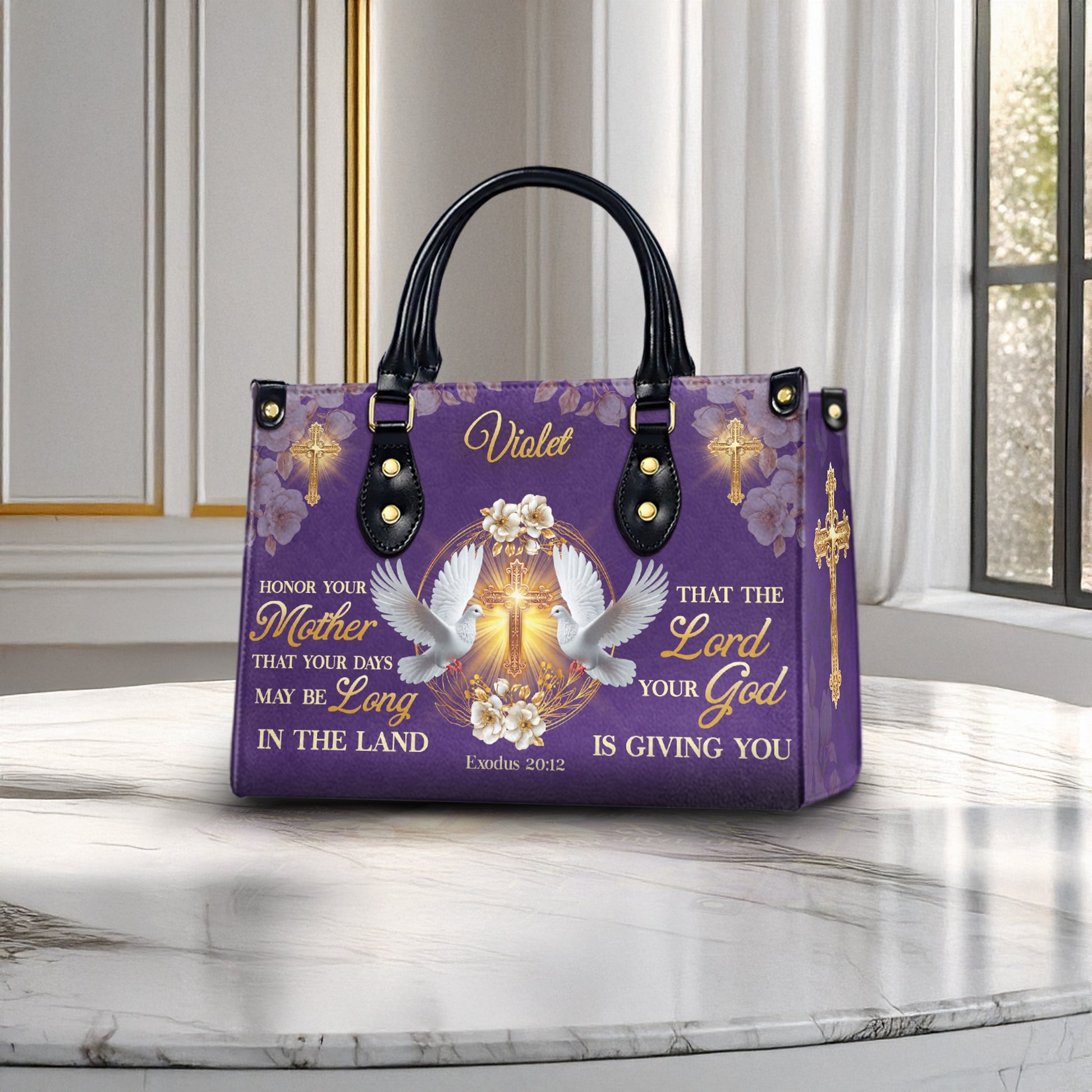 Honor your faith and celebrate motherhood with this elegant Christian PU leather handbag, beautifully adorned with a golden cross, peaceful doves, and floral accents on a royal purple background. The bag features the powerful Bible verse from Exodus 20:12: