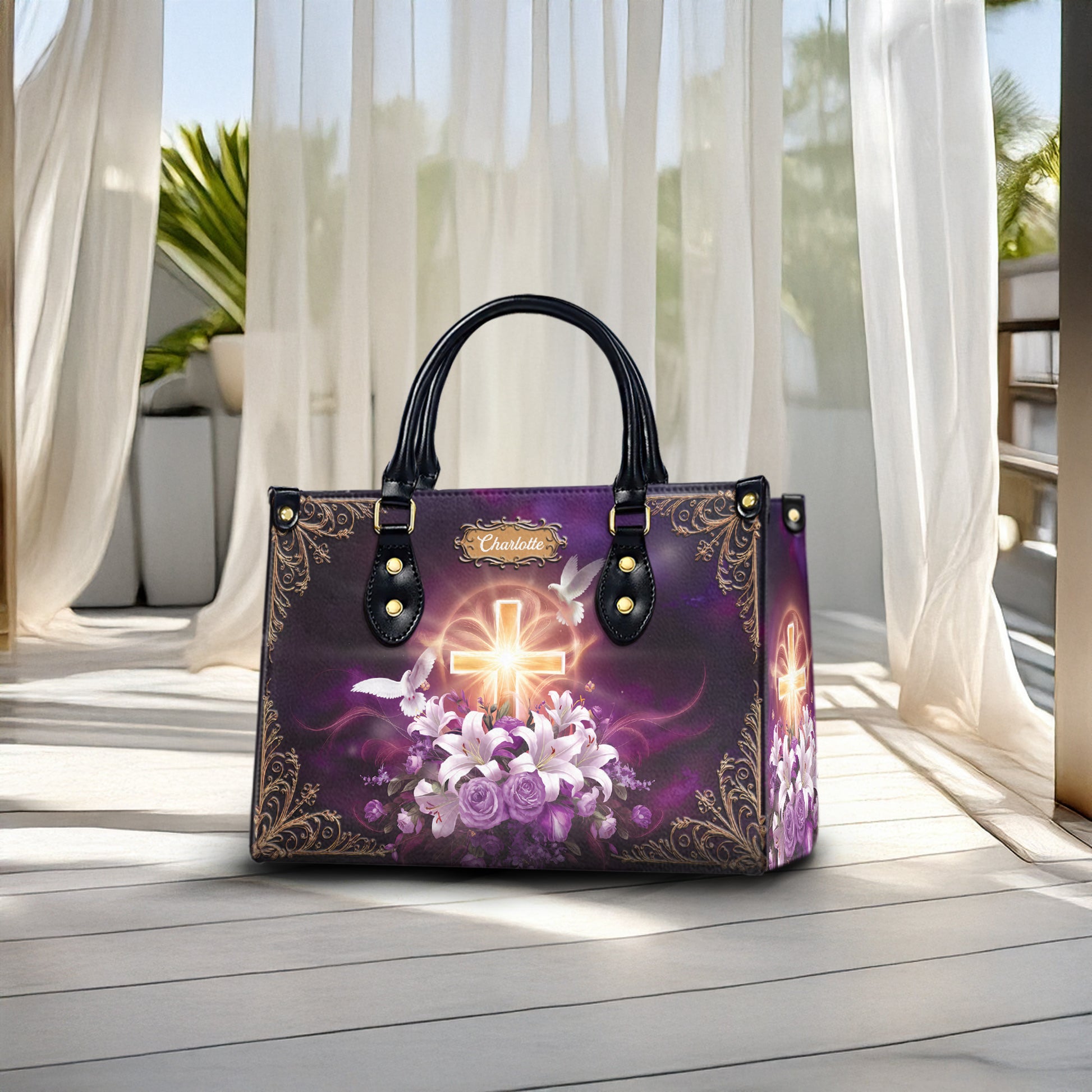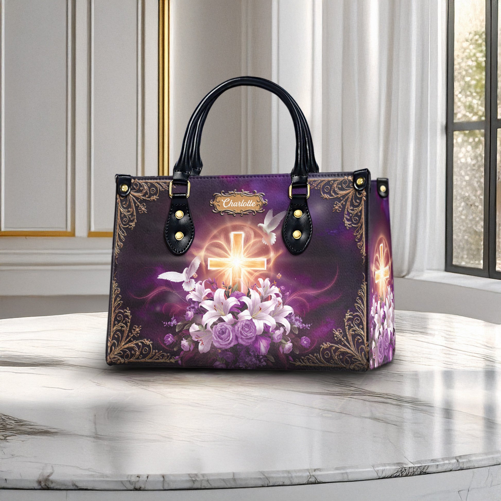 Celebrate your faith with this stunning personalized Christian handbag, featuring a glowing cross, elegant floral bouquet, and white doves—symbols of peace and divine love. Customized with your name, this faith-based purse blends spiritual meaning with everyday elegance.