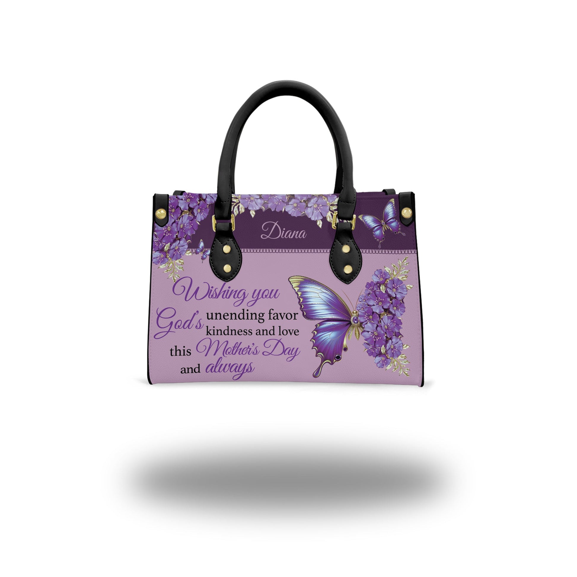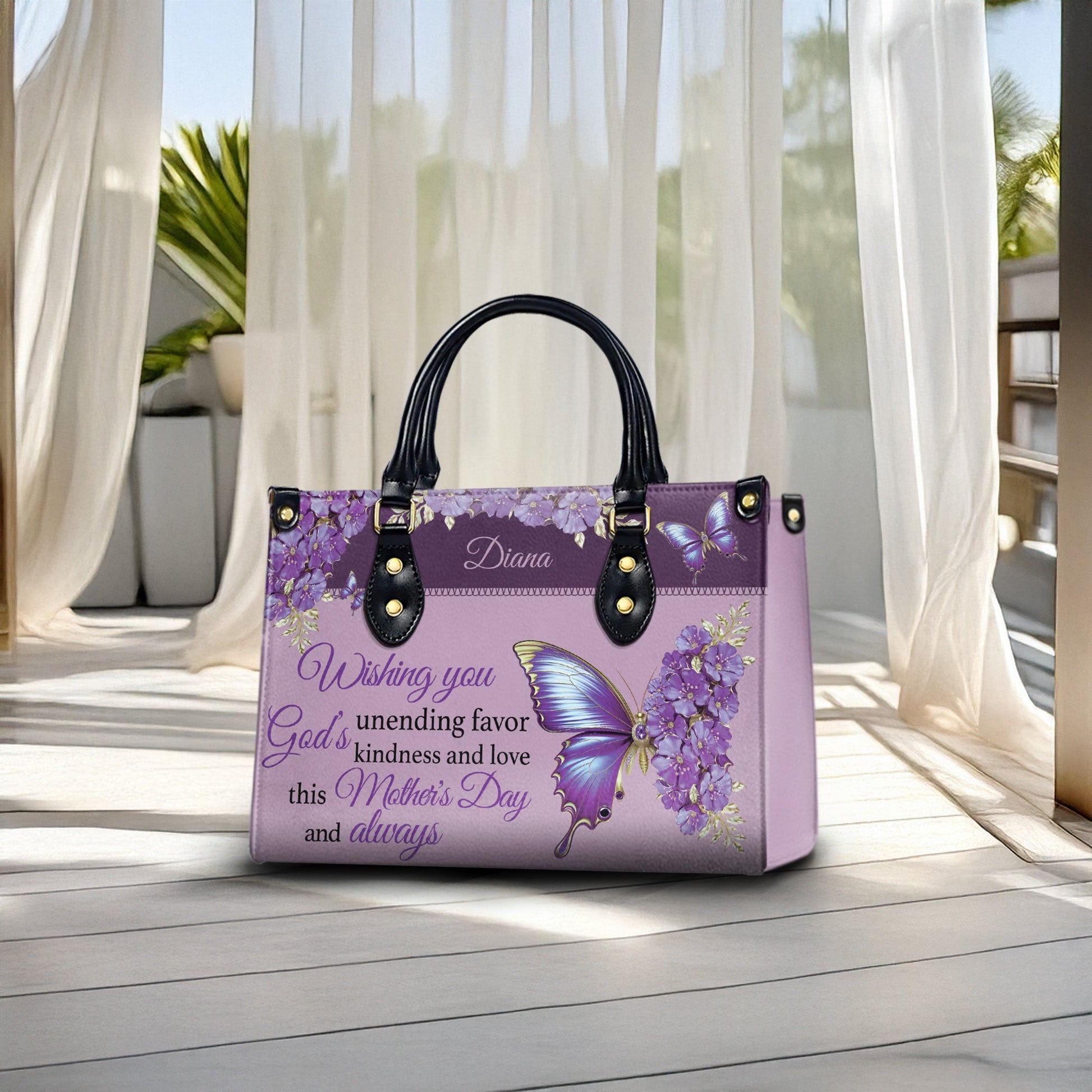 Make this Mother’s Day unforgettable with a beautifully personalized Christian handbag designed just for her. Adorned with elegant purple floral patterns, radiant butterflies, and heartfelt scripture blessings, this bag is more than just an accessory—it’s a daily reminder of God’s endless grace and your deep appreciation for Mom.