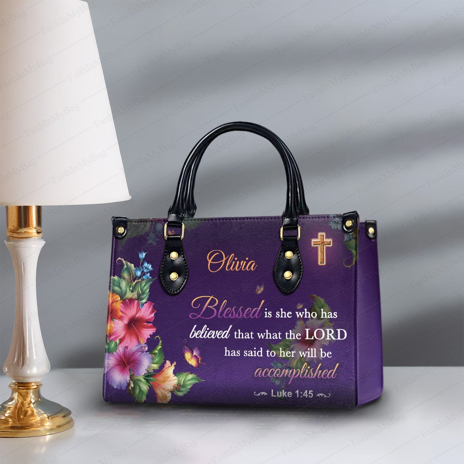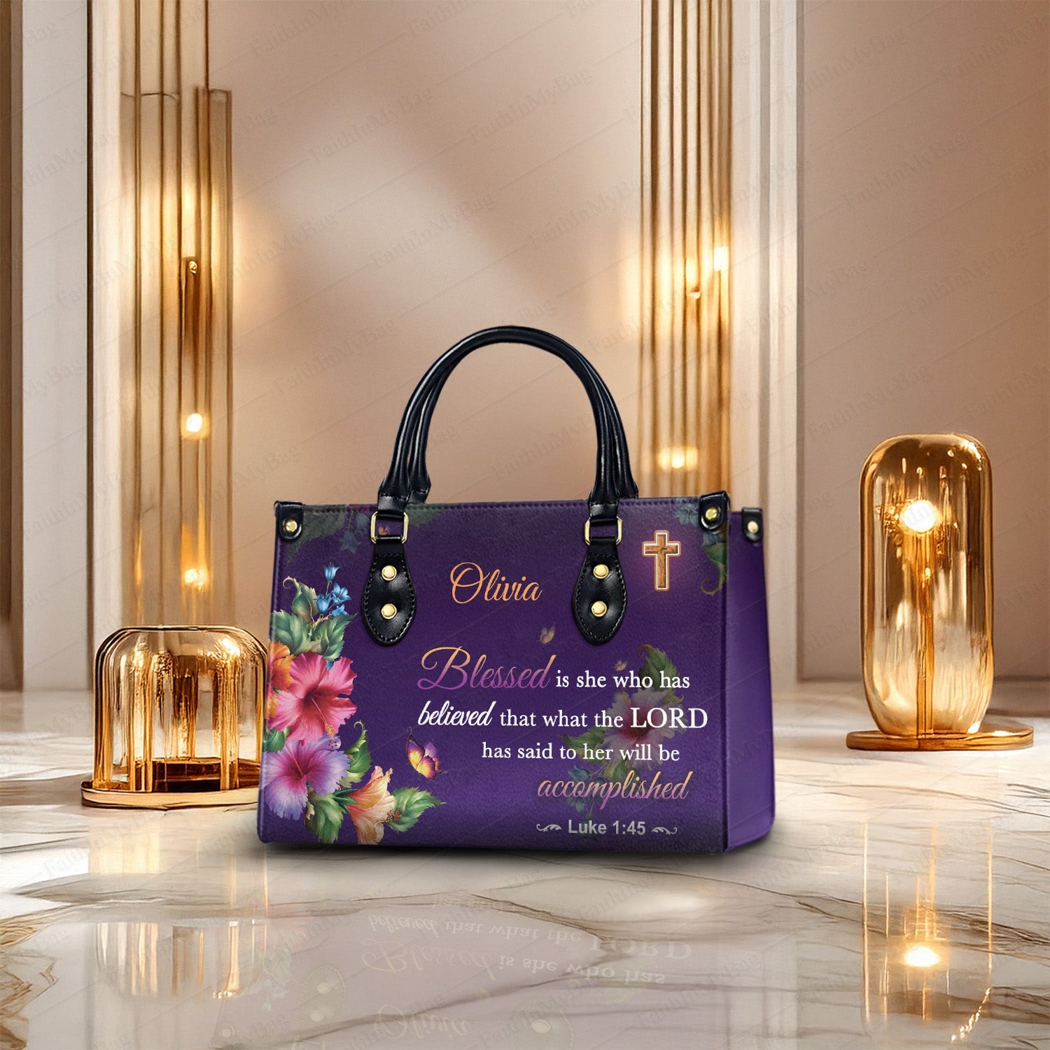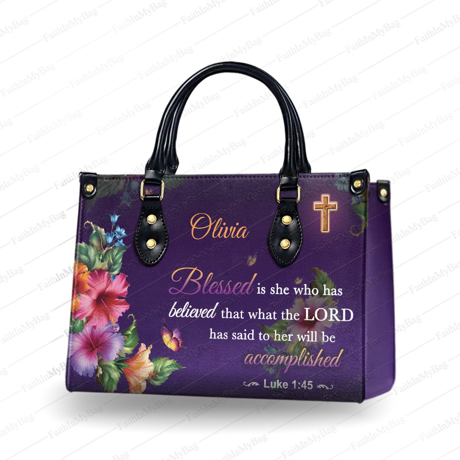 💜 This Christian handbag is more than just a purse — it's a daily reminder of faith and strength. Featuring elegant floral artwork and the inspiring Bible verse Luke 1:45, this custom name bag makes the perfect gift for moms, daughters, or any woman of faith.