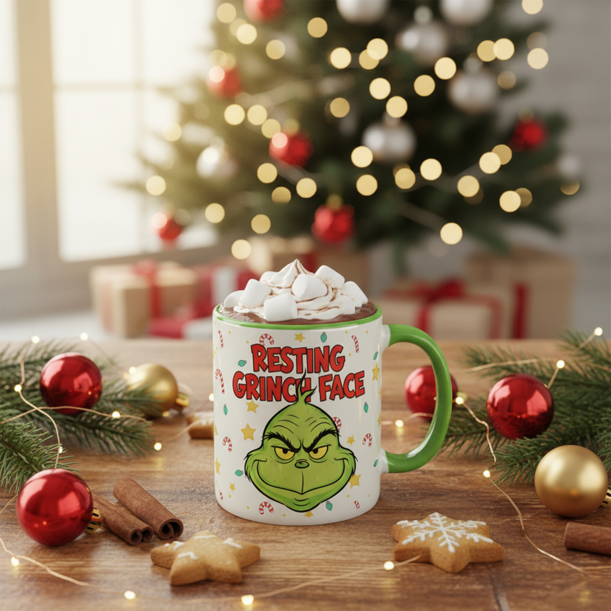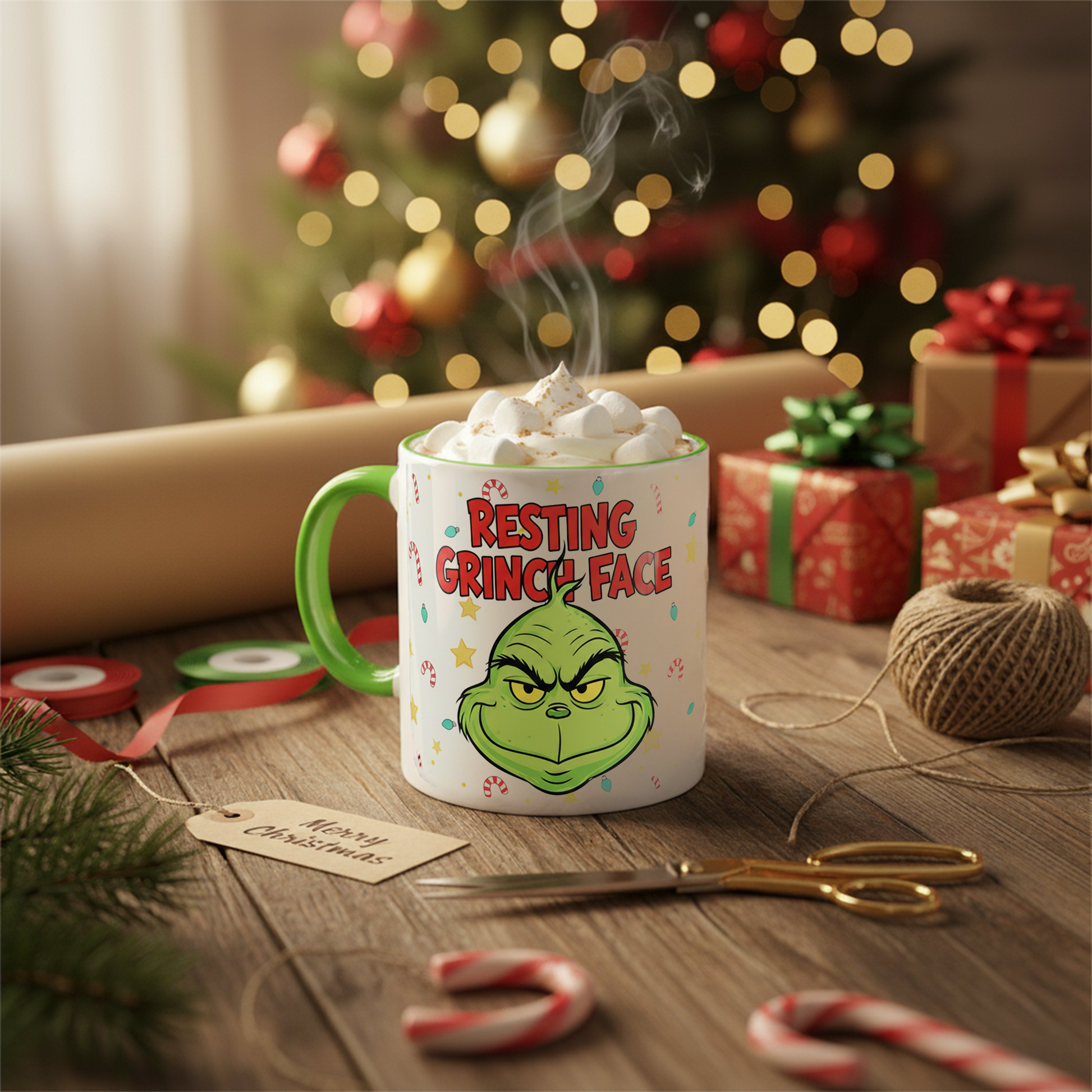 Funny Resting Grinch Face Christmas Mug, Holiday Grumpy Coffee Cup for Grinch Lovers, Festive Hot Cocoa Cup Gift for Cozy Winter Mornings| Mug 31